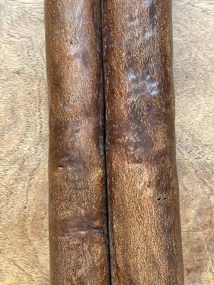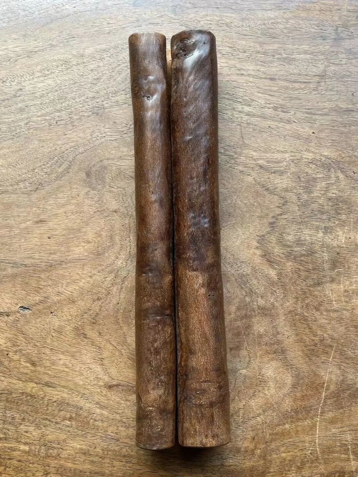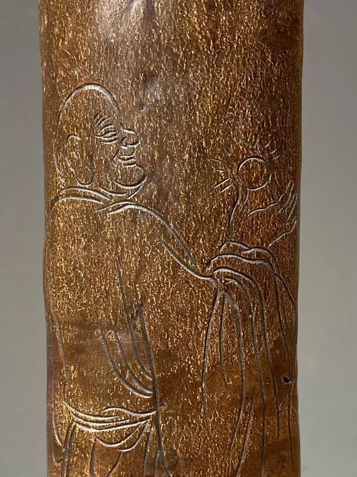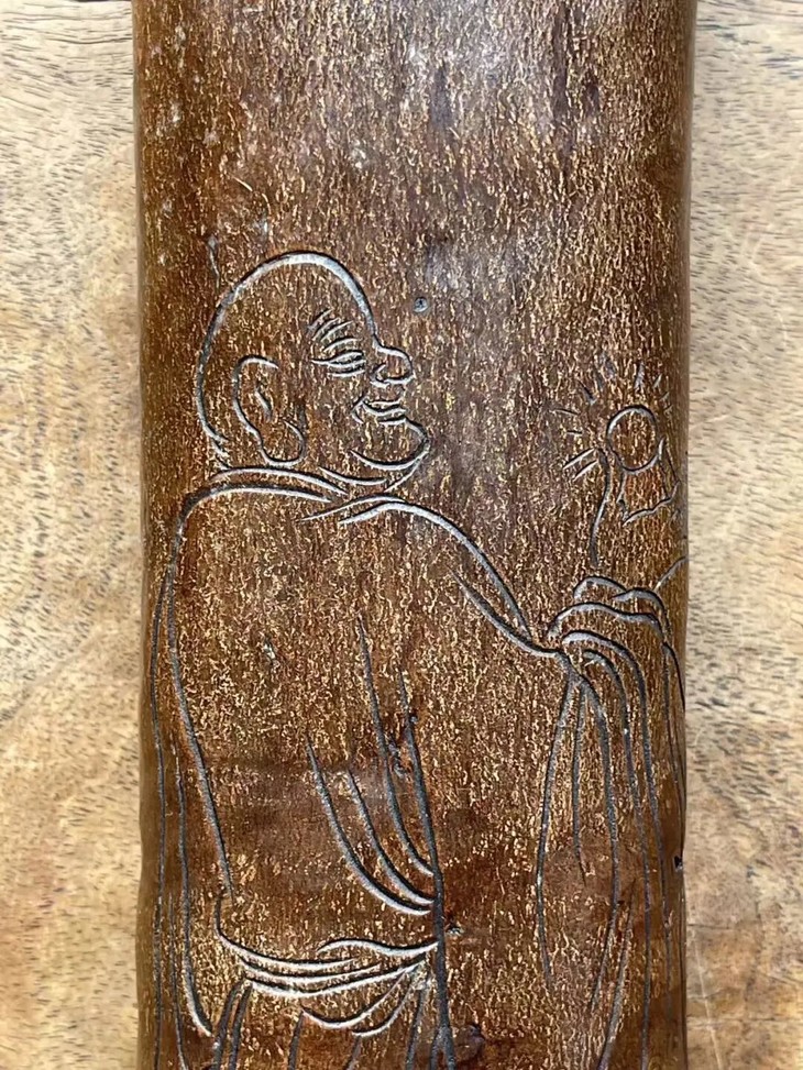 此天然桂皮雕罗汉纹臂搁,如图所示,除底部与边沿处有些细微磨损痕与刮痕外,基本保存完好,表面包浆浑厚,仍然散发出桂皮香气。