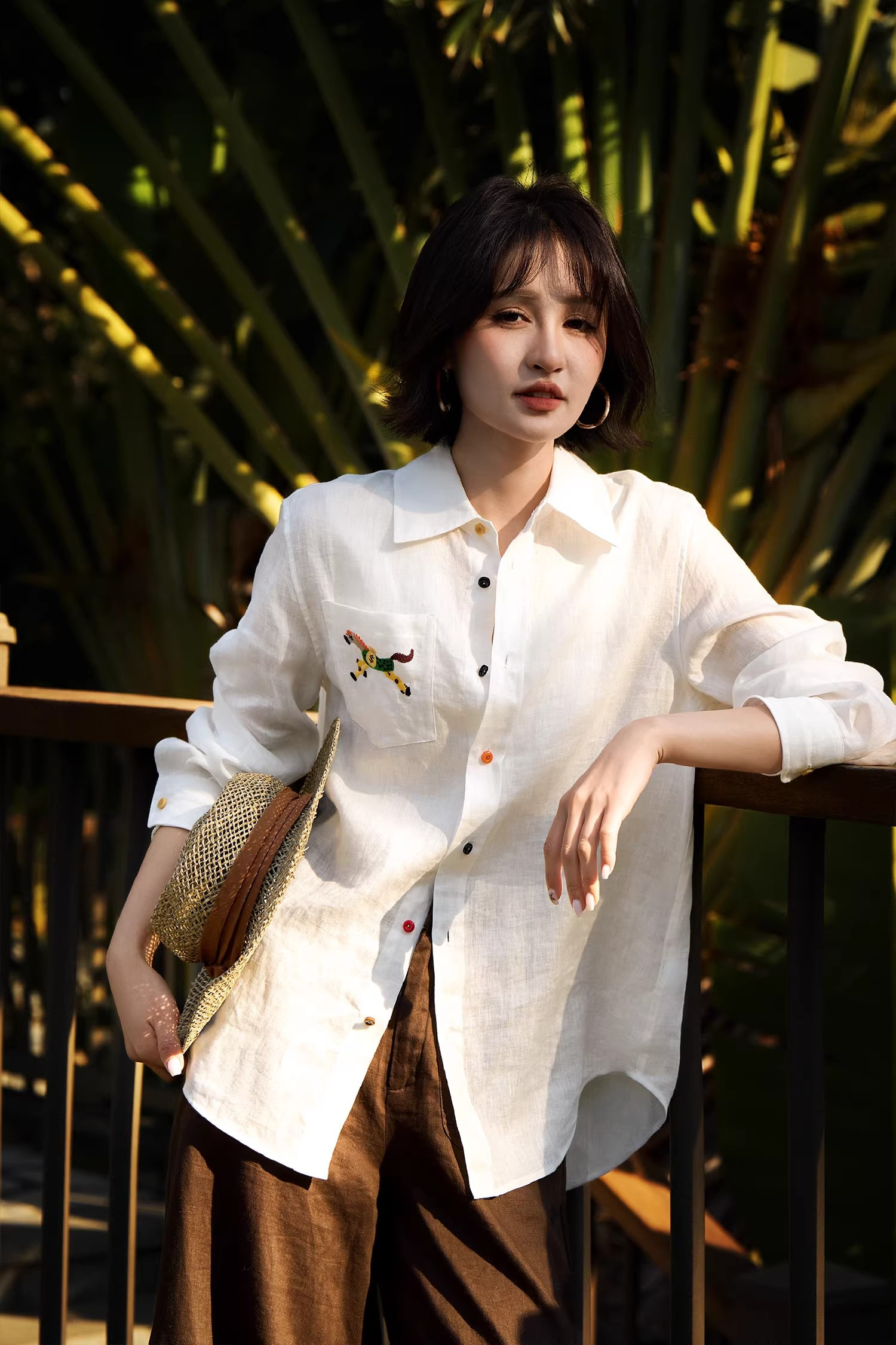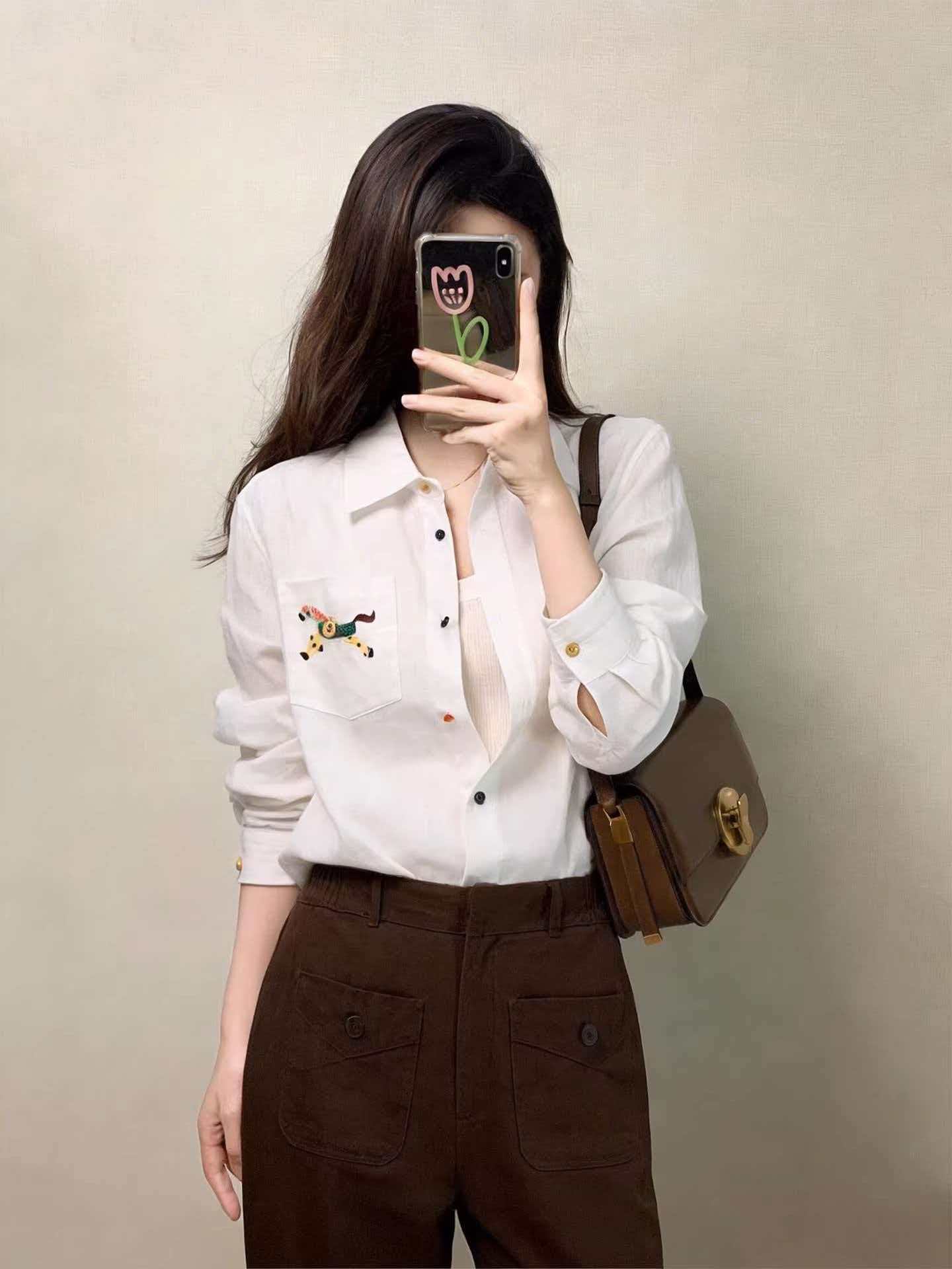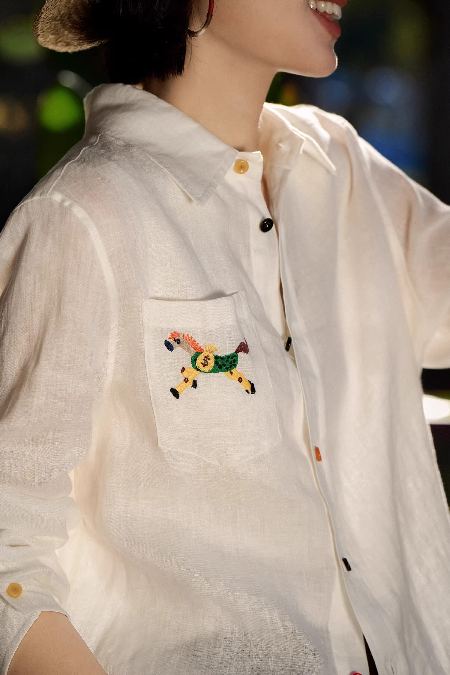 手工小马刺绣,精致又有质感,交错色的纽扣,低调又俏皮、又有腔调,慵懒的宽松版型,时尚百搭不挑人不挑年纪。
