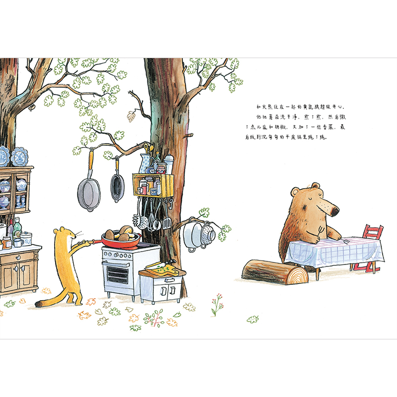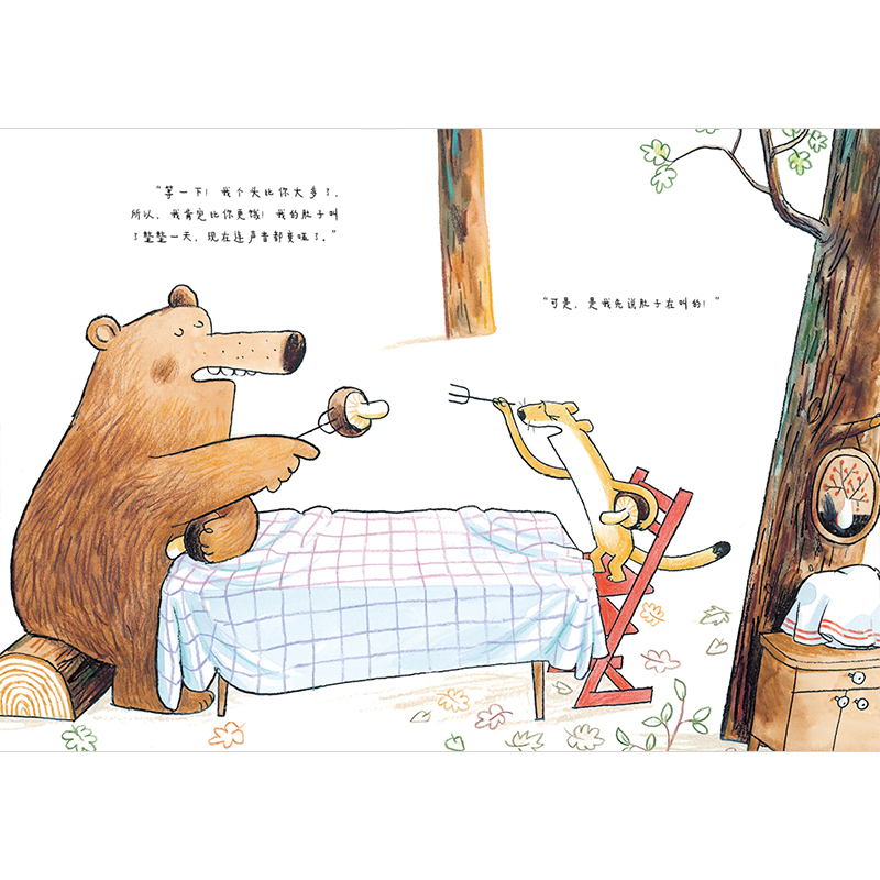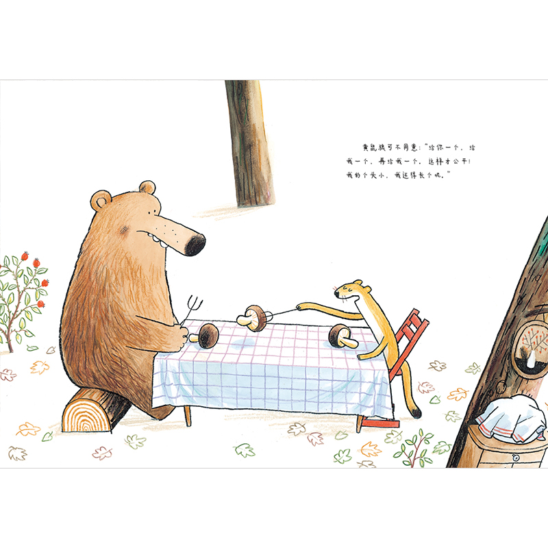 大熊在回家的路上找到三个蘑菇。他的好朋友黄鼠狼把蘑菇洗干净,又是煎又是煮。当他们准备享用香喷喷的蘑菇时,问题来了——两个人吃三个蘑菇,怎样分才算公平?大熊说:“给你一个蘑菇,给我一个蘑菇,再给我一个。这样就公平了。我的个头大,所以我必须多吃。”可是黄鼠狼不愿意了:“给你一个,给我一个,再给我一个。这样才公平!我的个头小,还得长个呢。”就这样,他们都说了许多自己必须多吃一个的理由。好像每个都挺有道理……