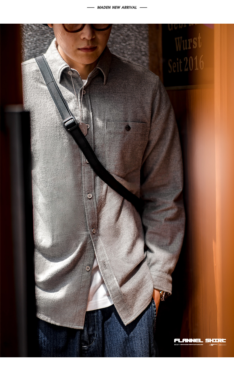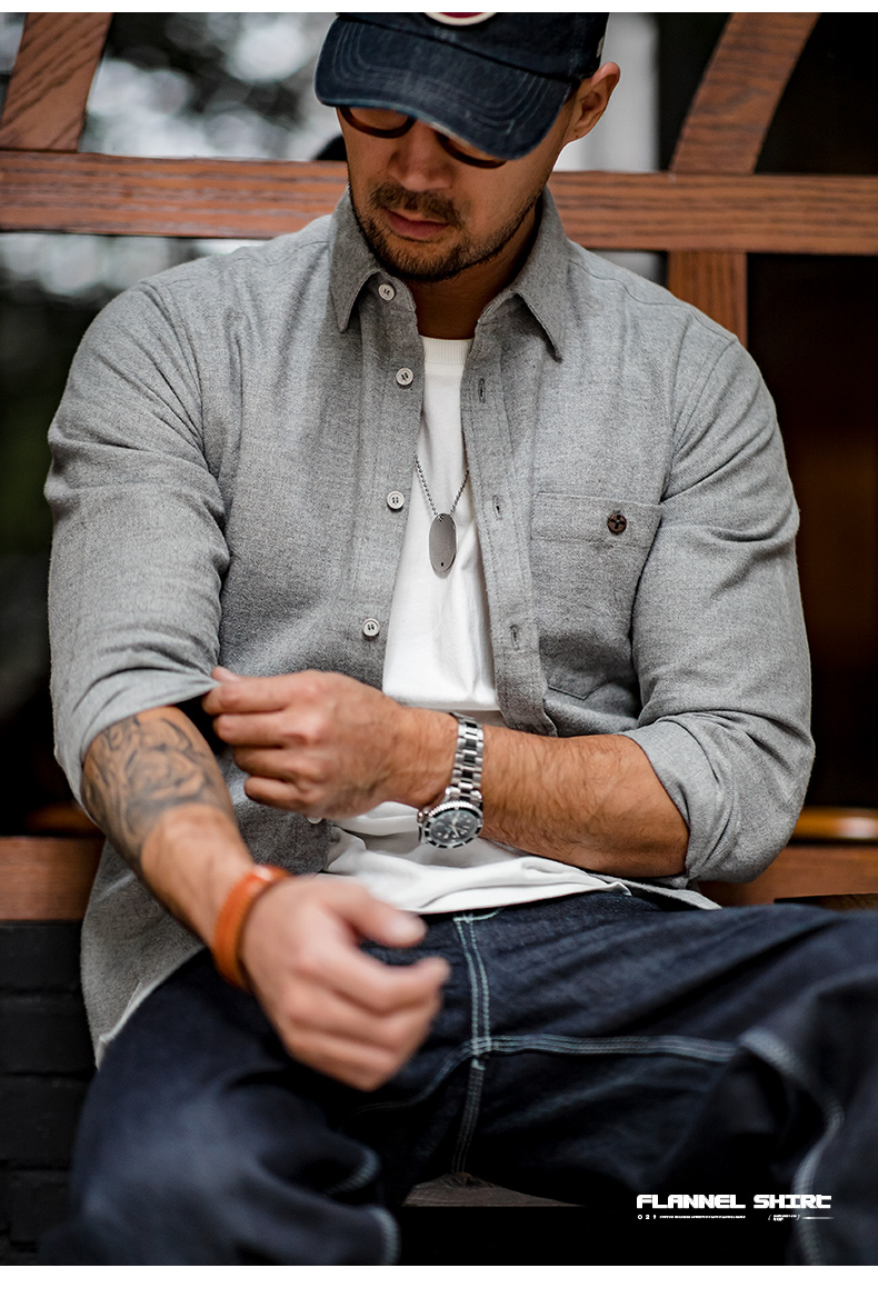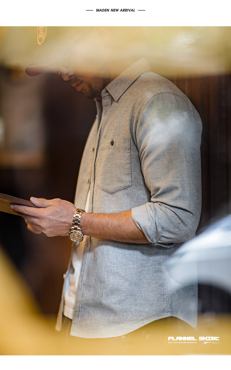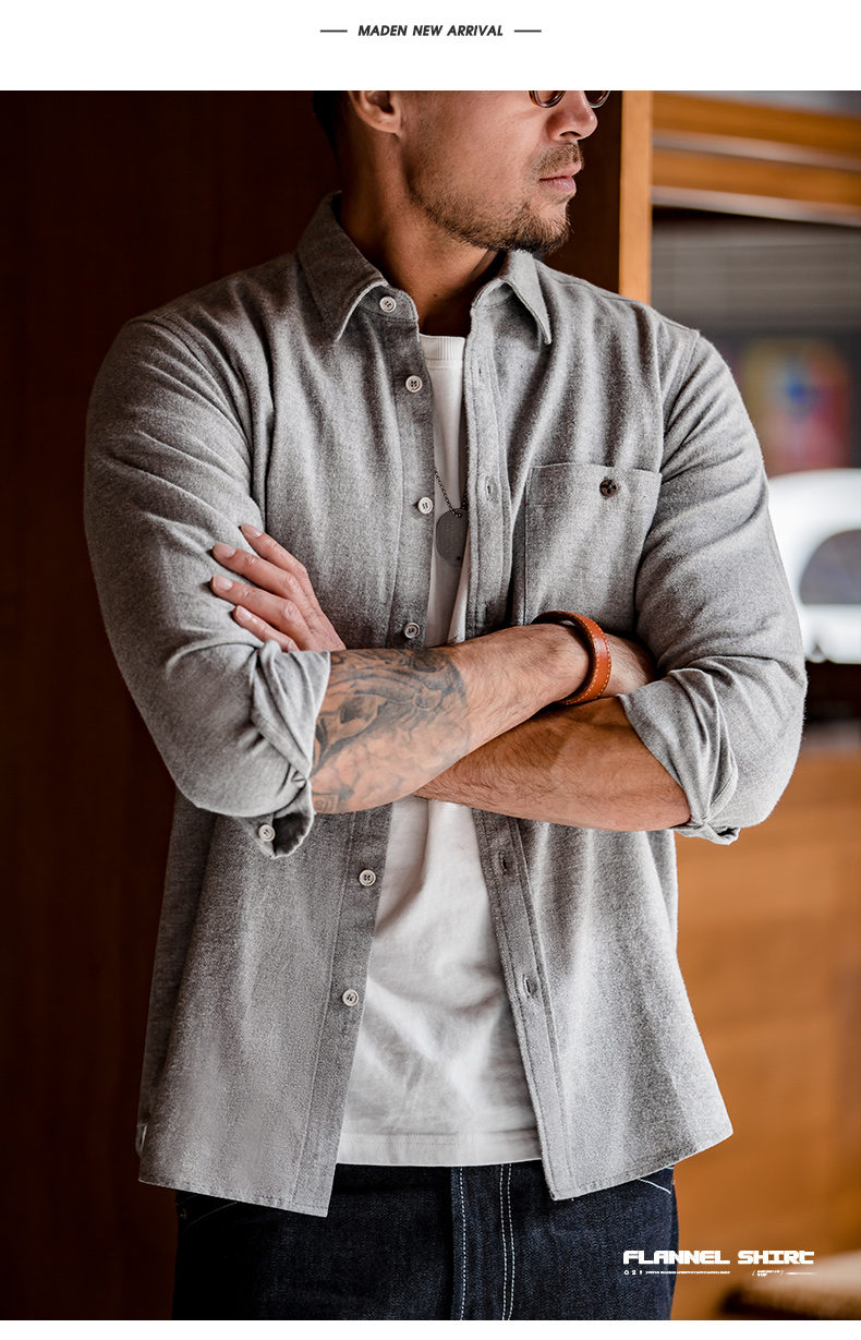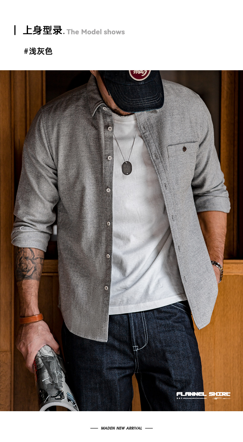 马登工装 美式休闲法兰绒全棉衬衫灰色商务通勤磨毛长袖衬衣男春