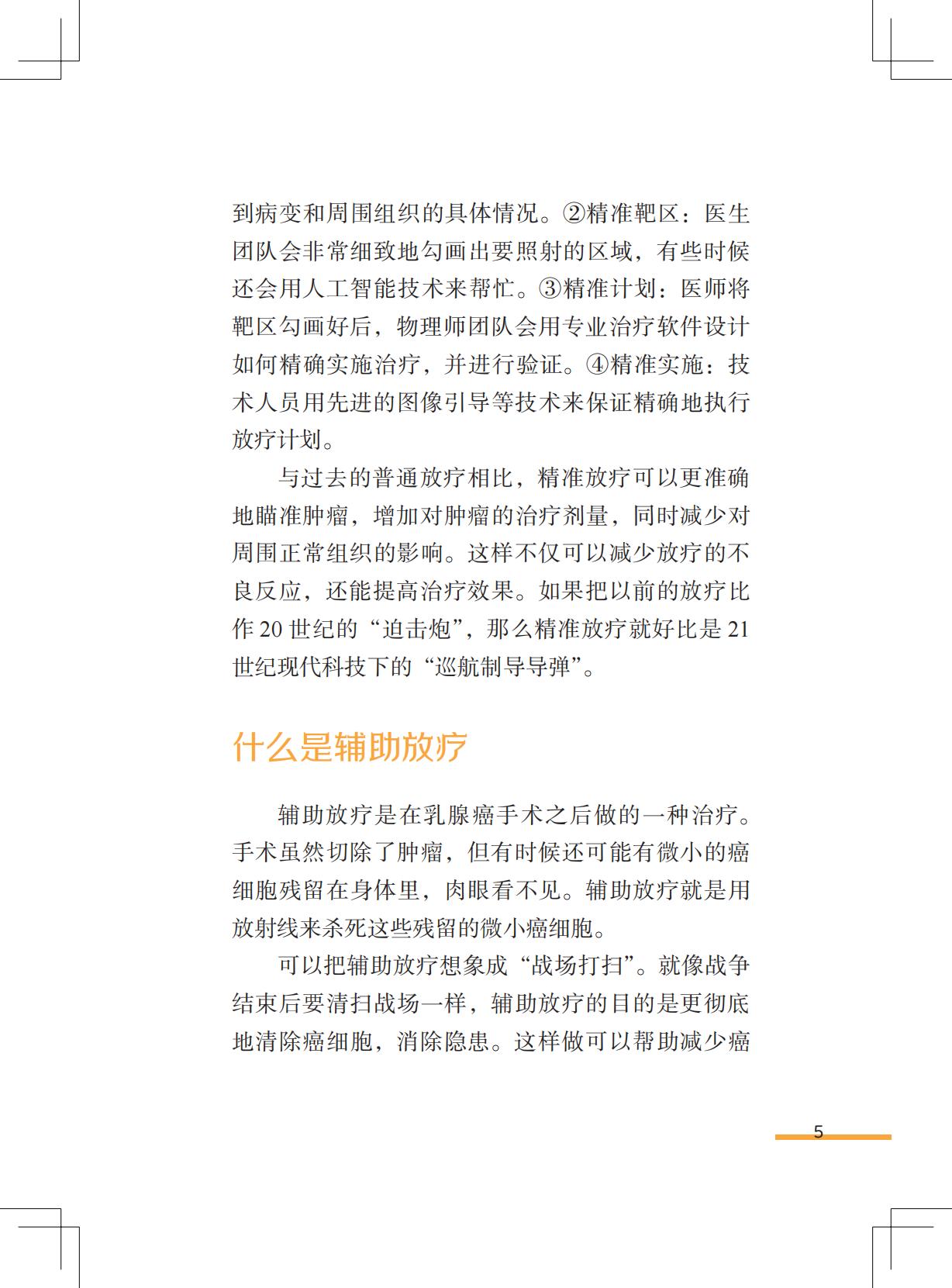 本书是用通俗易懂的语言、图文叙事的方式解释深奥的放疗专业知识的科普书,编写人员主要是来自全国大型肿瘤放疗中心的放疗医生们,工作在乳腺癌放疗一线。内容涉及乳腺癌发病原因,放疗的原理、方法,放疗前的准备,放疗中不良反应处理和放疗后的注意事项,以及与其他治疗方法(如手术和化疗)的配合应用,力求为读者呈现一个全面且清晰的乳腺癌诊疗图谱。