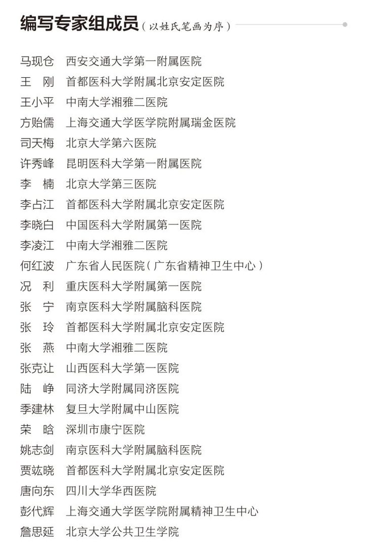 本指南由中华医学会精神医学分会组织编写,我国著名精神病学专家郝伟、王高华、于欣教授担任主审,李凌江、王刚教授主编,24名编写专家组成员亲自执笔,8名外审专家组严谨评审,凝聚了跨学科团队两年半的协作智慧。