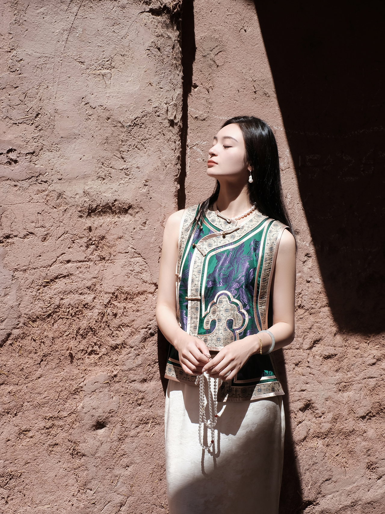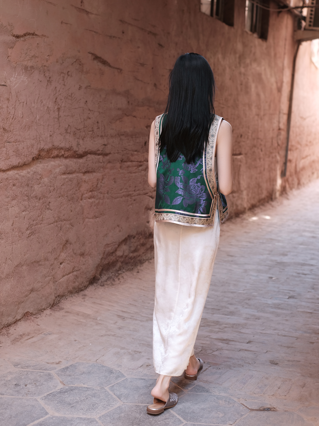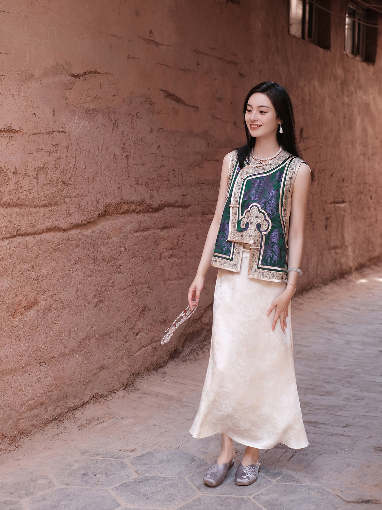盛唐牡丹盛奢系列|老缎牡丹纹琵琶襟马夹(特殊商品不退不换)