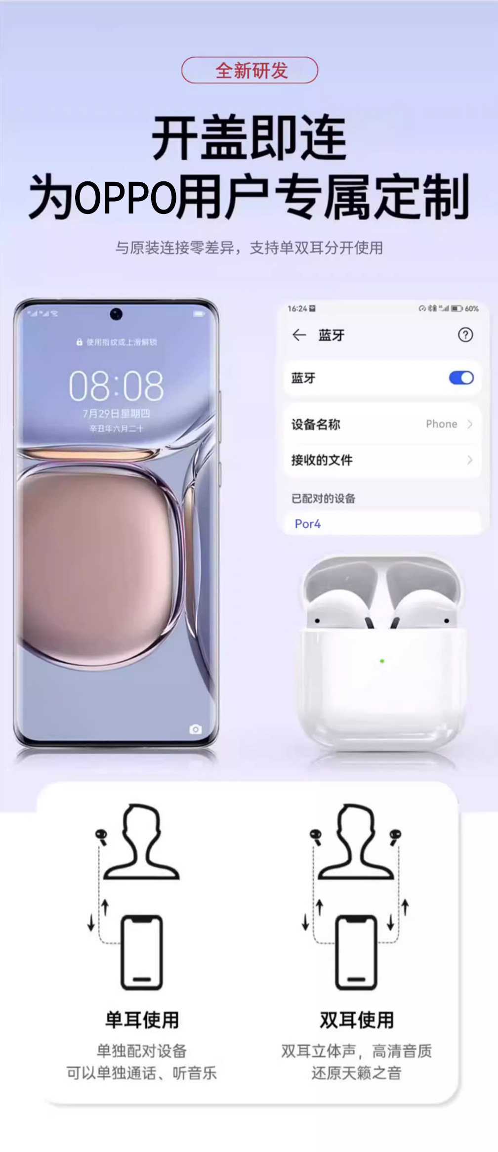 : 主控芯片杰理,充电口,13mm发声单元,驻极体麦拾音(ANS通话降噪),设备名Pro4,支持中英文提示音,支持游戏低延时模式,最大音量连续播放约4小时,开盖连接;
