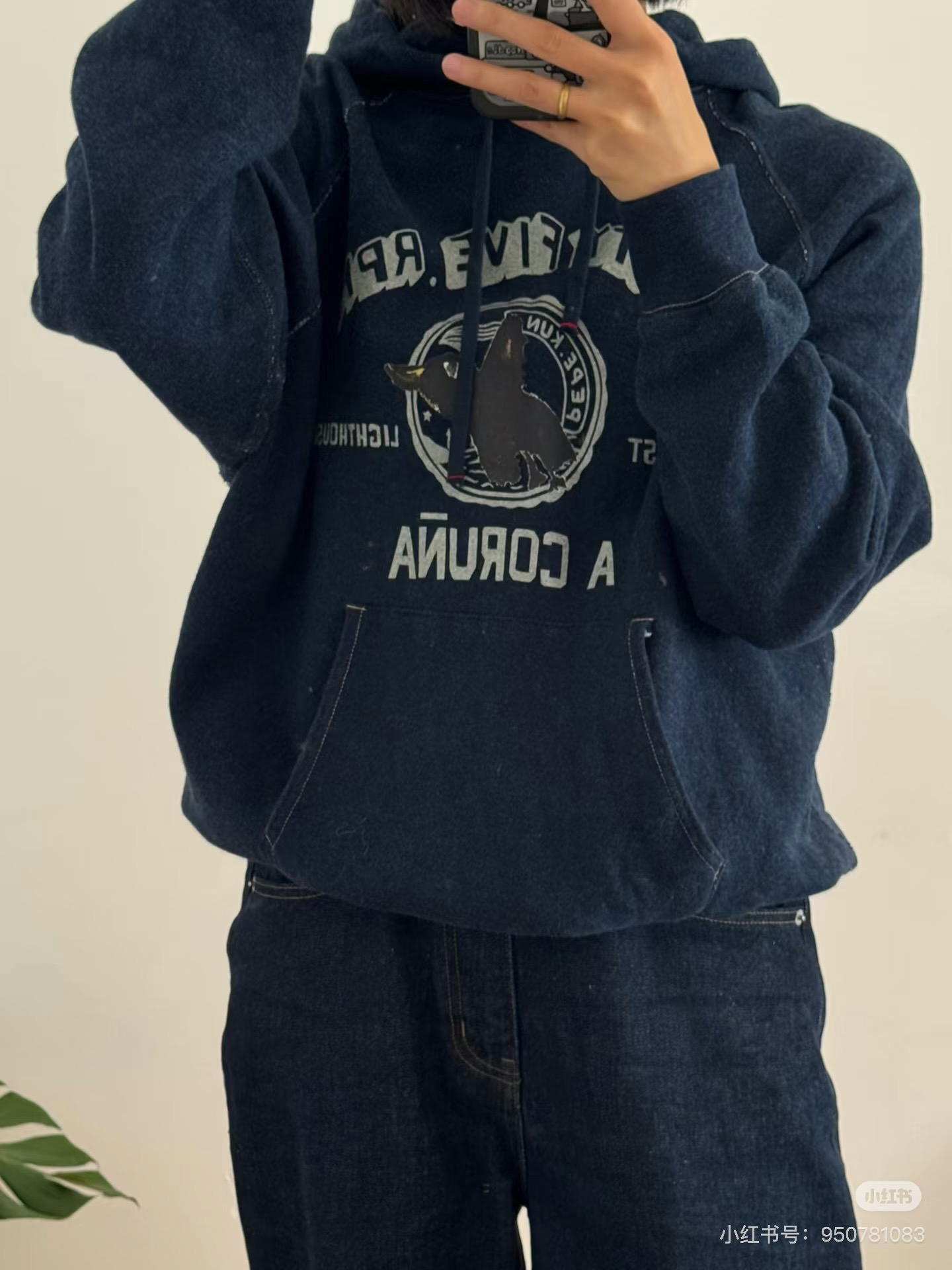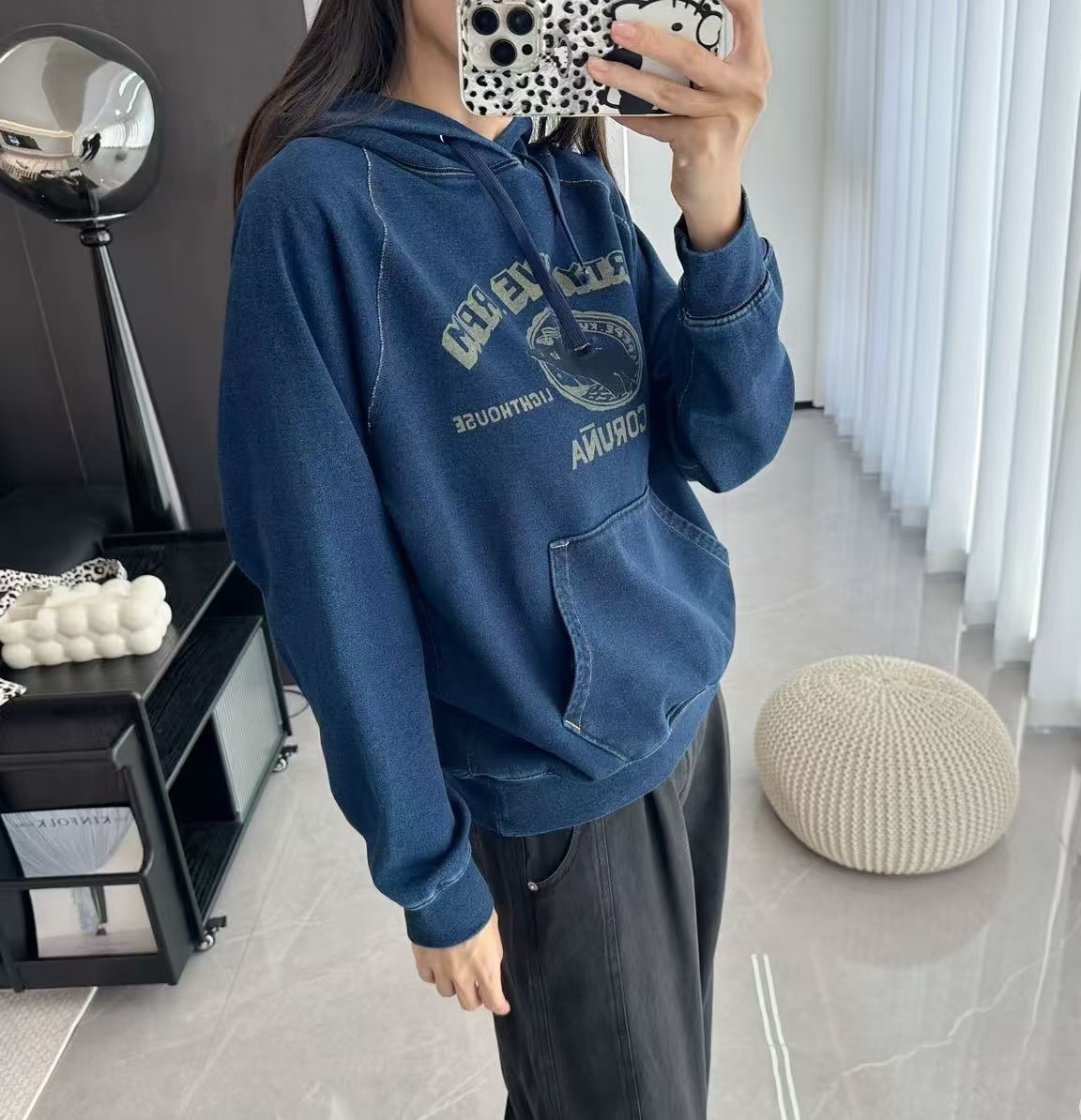 复古做旧仿牛仔连帽卫衣,美式休闲风