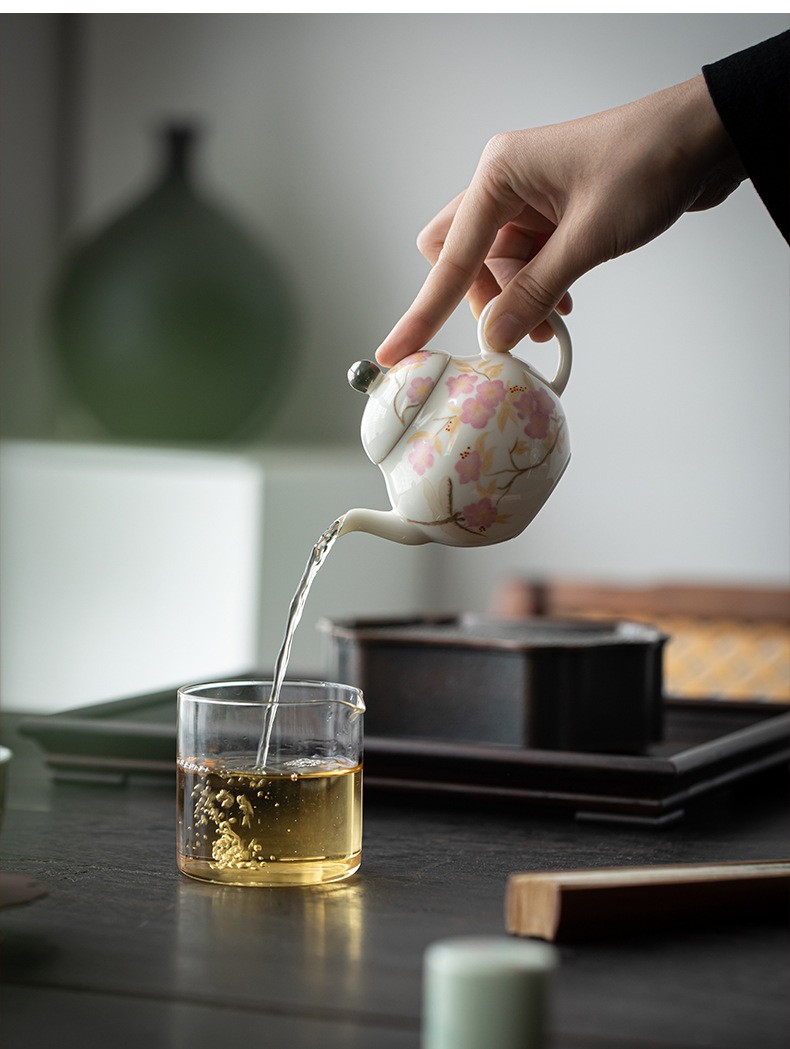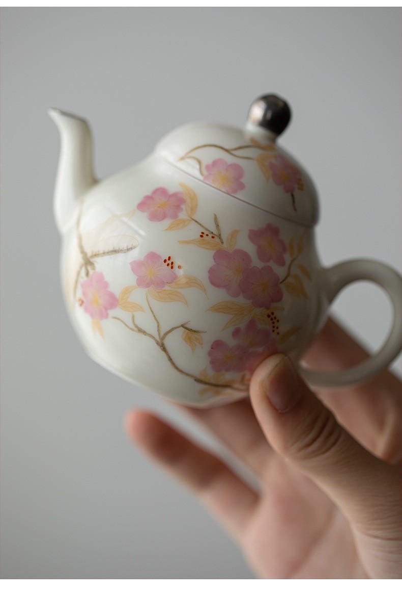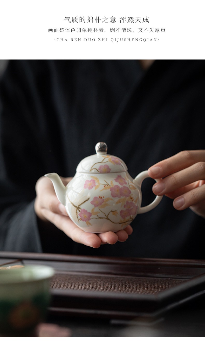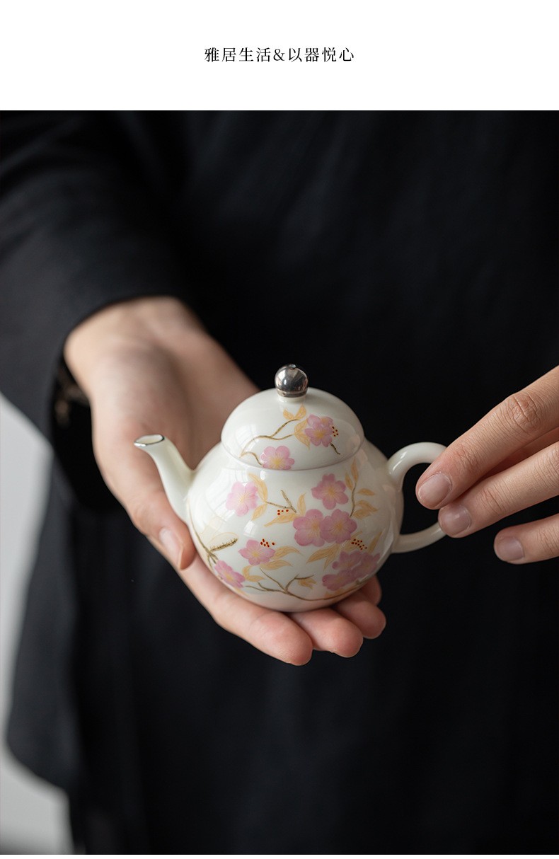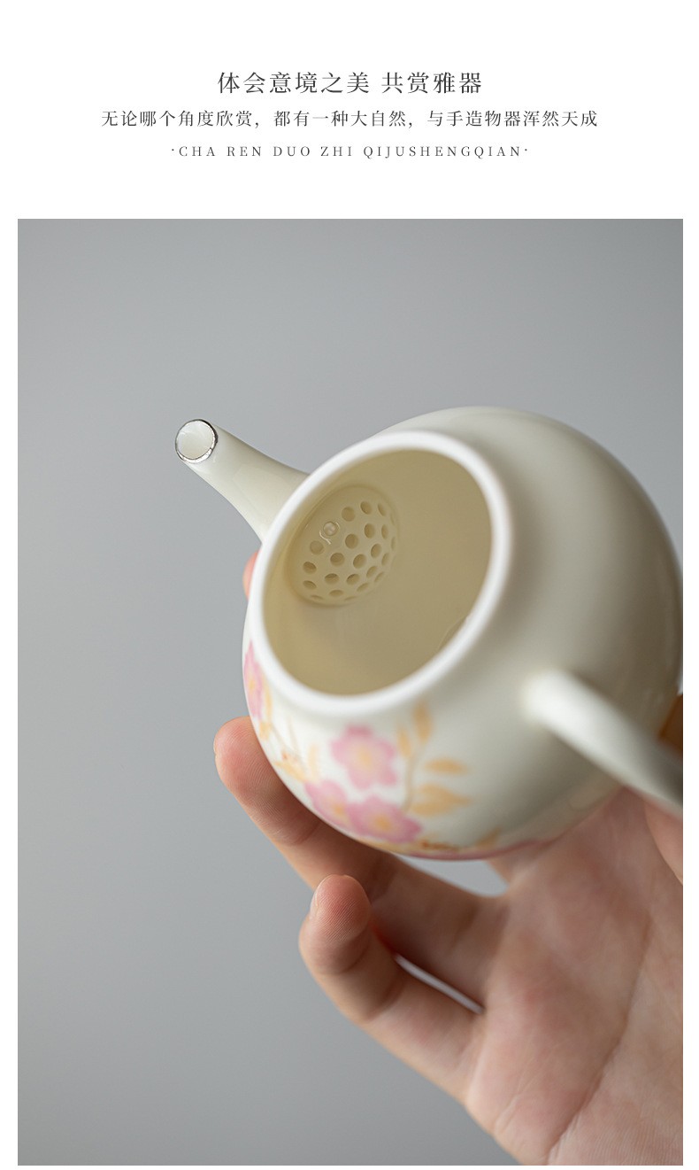 永利汇杏白釉上彩手绘粉露梨形壶手工陶瓷泡茶壶过滤球孔功夫壶