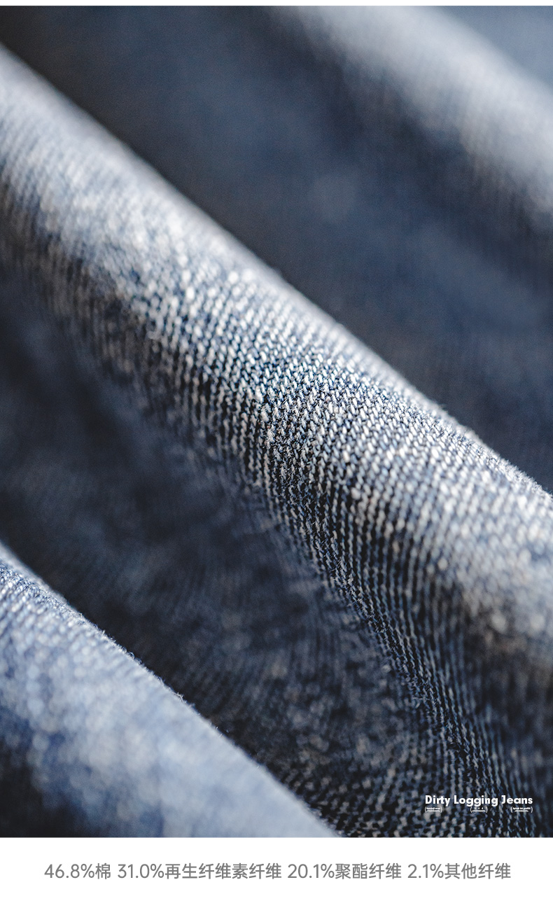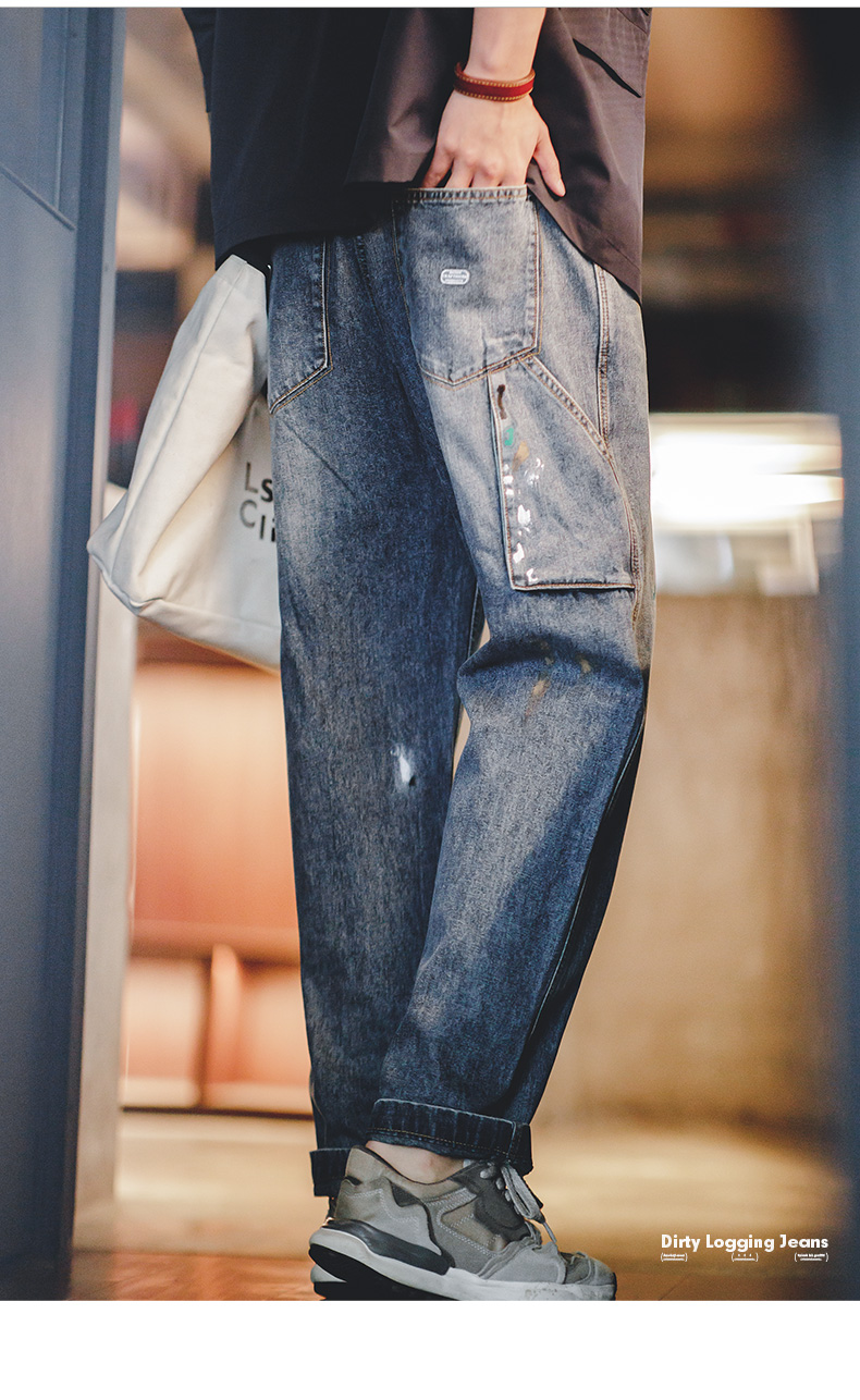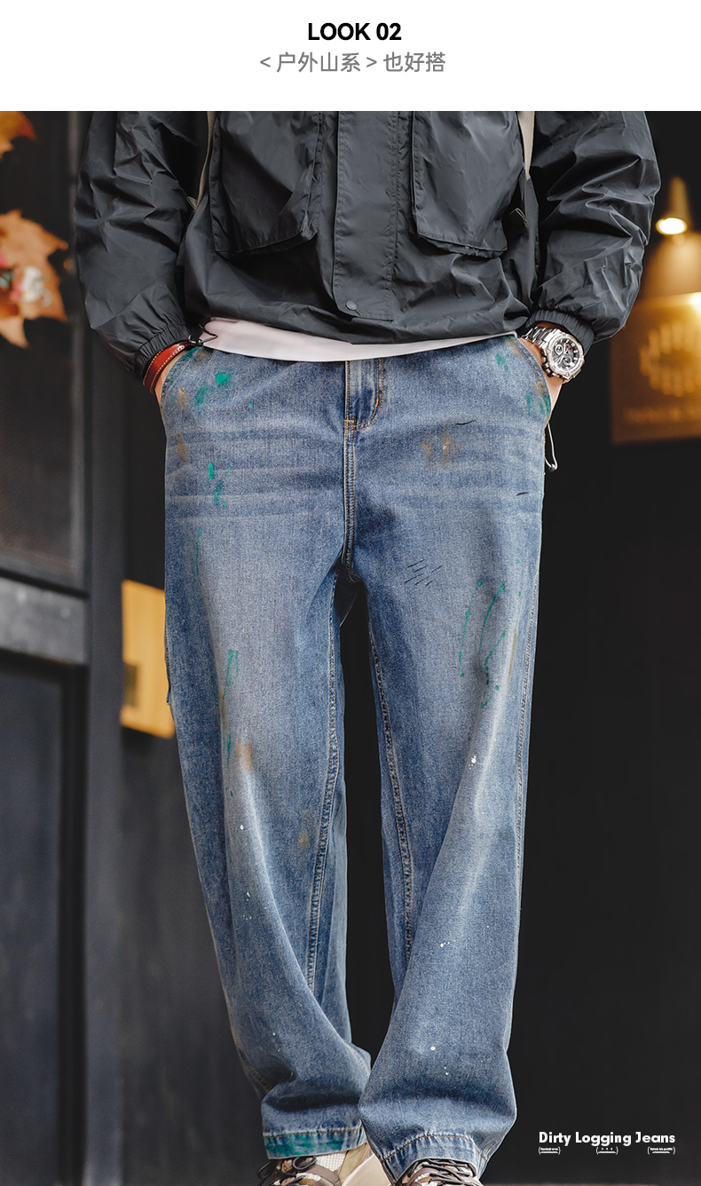 工装优选美式复古泼墨涂鸦牛仔裤浅蓝色竹节纹水洗直筒伐木裤男春