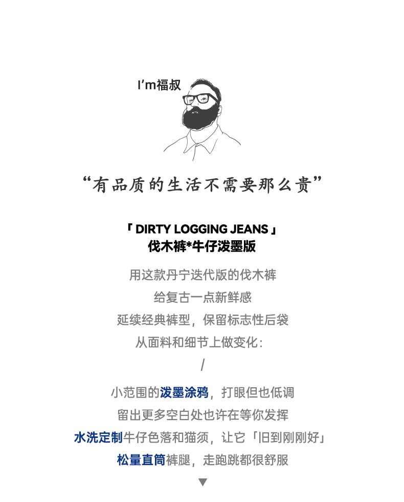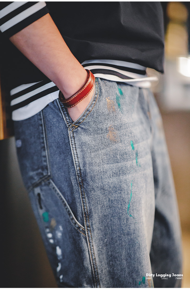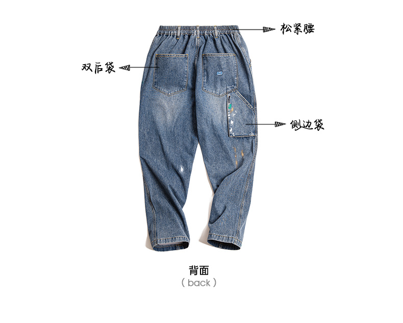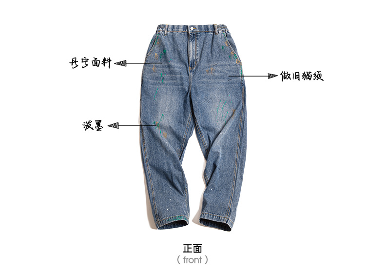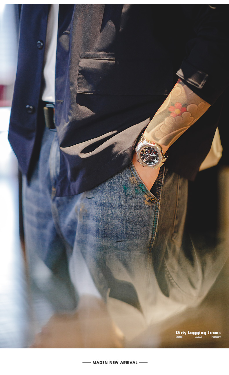 工装优选美式复古泼墨涂鸦牛仔裤浅蓝色竹节纹水洗直筒伐木裤男春