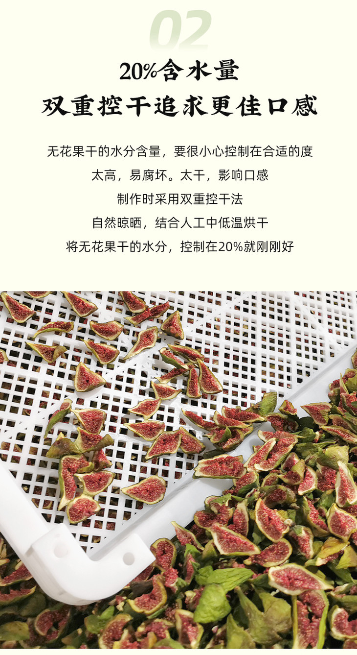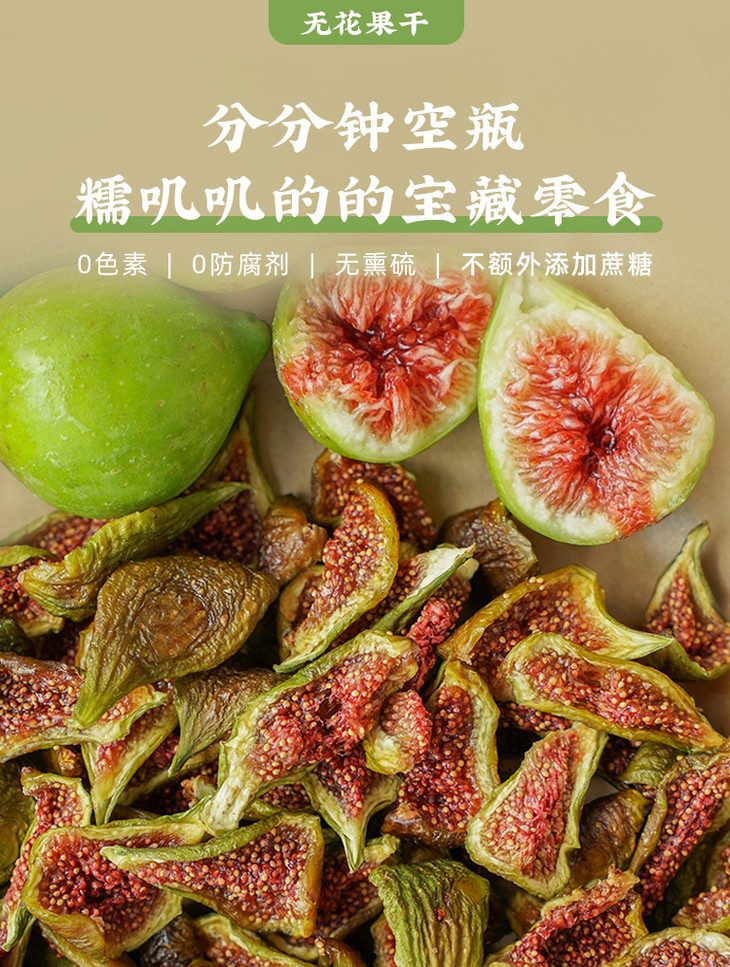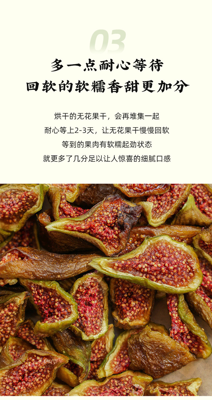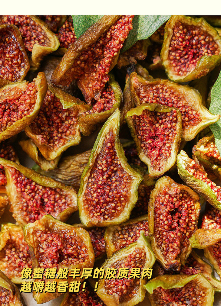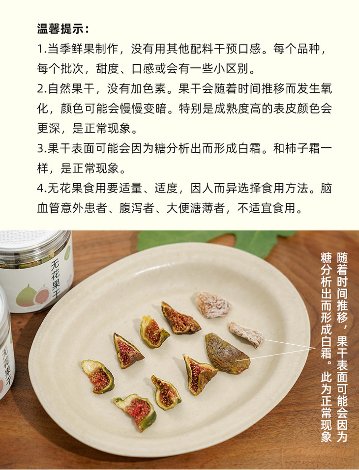 温馨小提示,由于是天然的果干,表面可能会因糖分析出形成白霜,同时,随着时间推移,颜色可能会逐渐变暗,属于正常现象,不影响食用。无花果性味甘凉,富含脂肪酶、水解酶等,对喉咙热、肠热、血气热,身体结节,都有疏通消解的益处,但食用要适量,如果有腹泻或者便便比较溏稀、正常血钾性周期性麻痹或者脑血管问题的朋友家人,不建议食用哦。