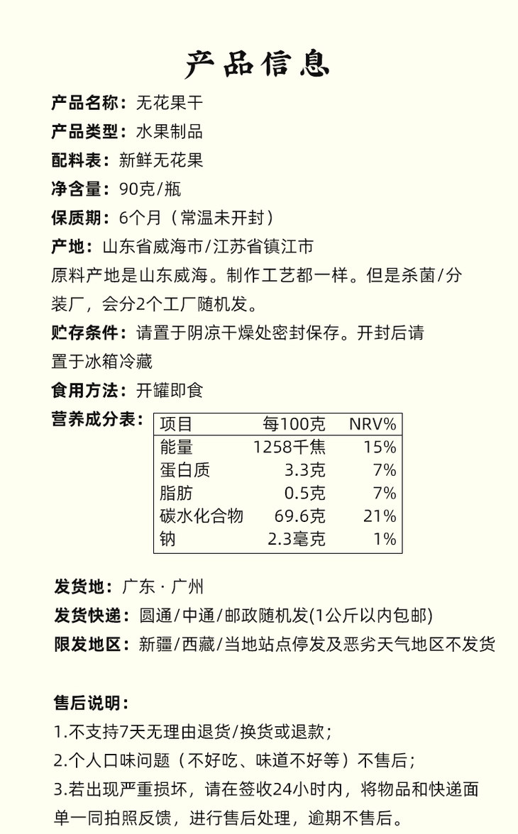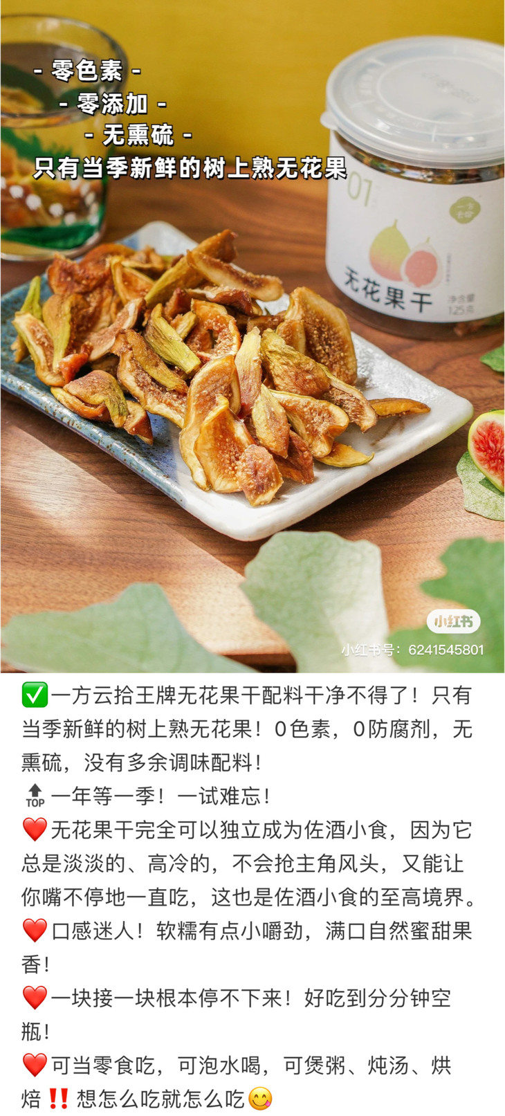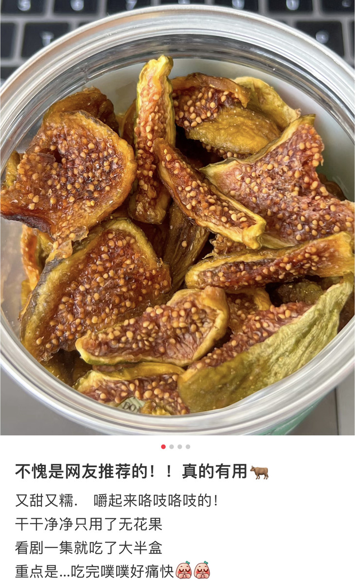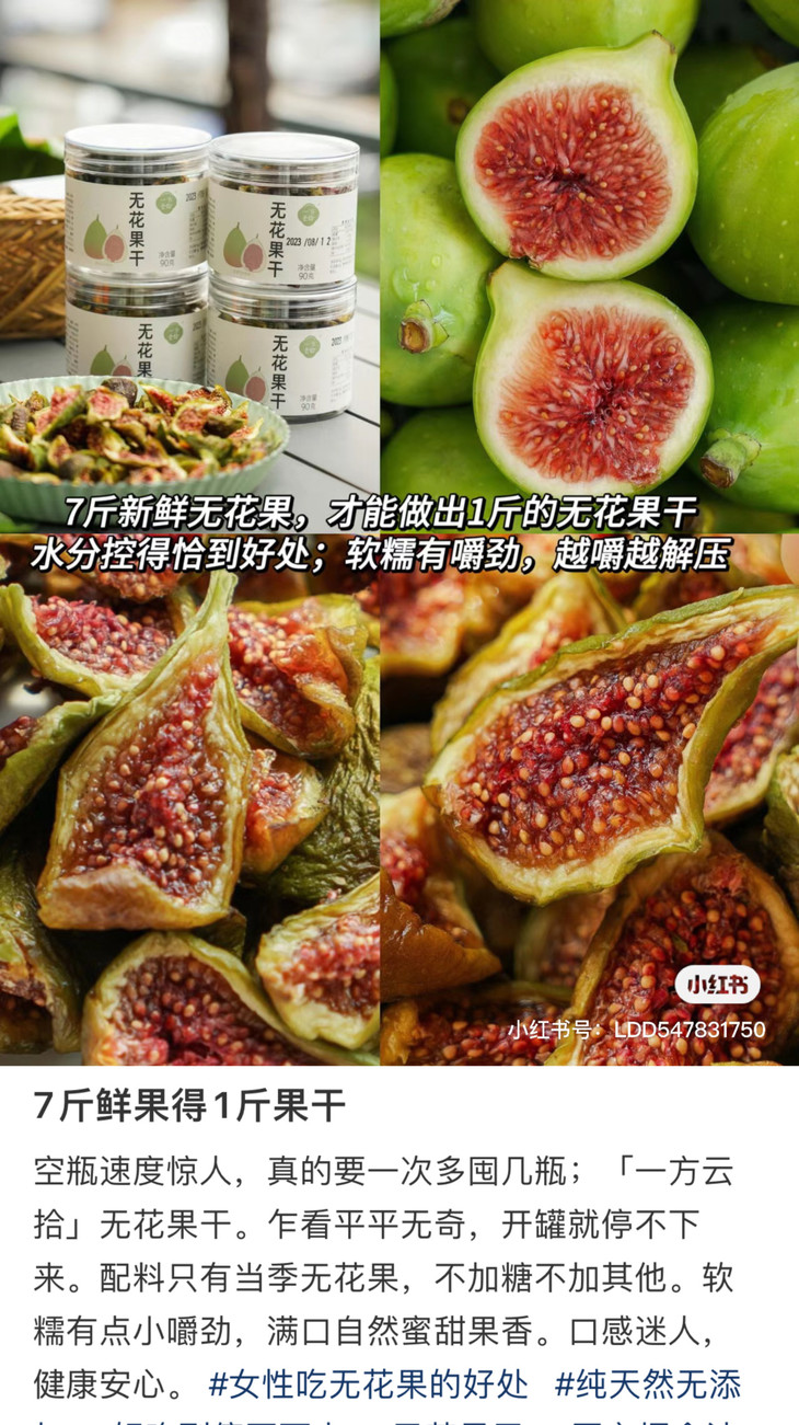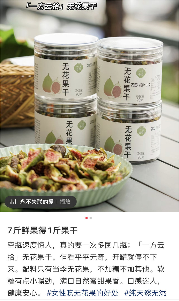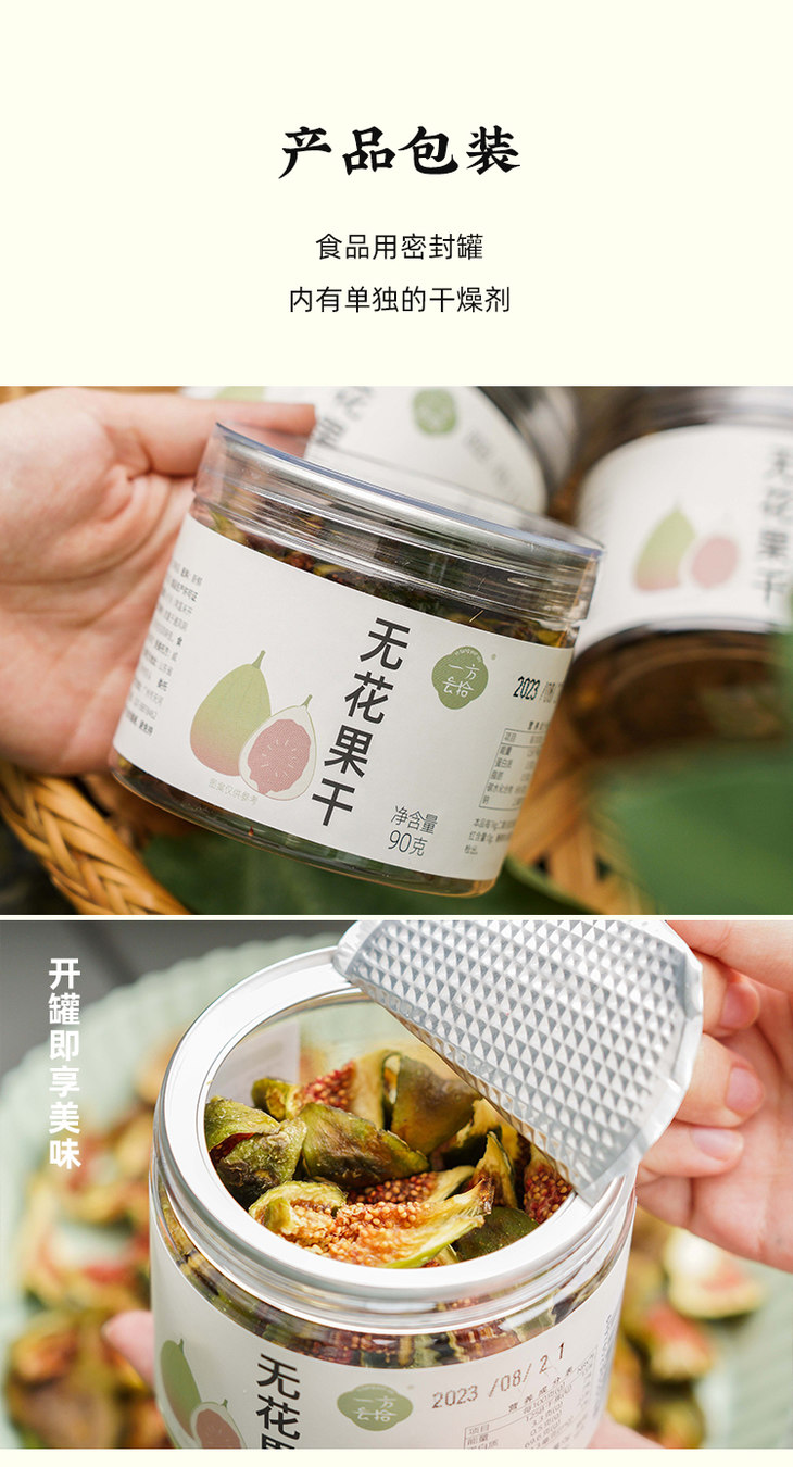 无花果干,是用透明罐装,量蛮大的,味道也相当好!我其实试过好几个品牌了,都没上,要么太干,要么味怪,一方云拾的就真的不错,水份刚刚好,直接嚼就是甜糯糯的,入口绵密,像半凝固的蜜糖一样,如果泡水,还能回软,果肉会更还原果子的本味,带有淡淡的清甜,很是润口,搭配新鲜水果做成果茶,更是独有风味,大家可以试试!