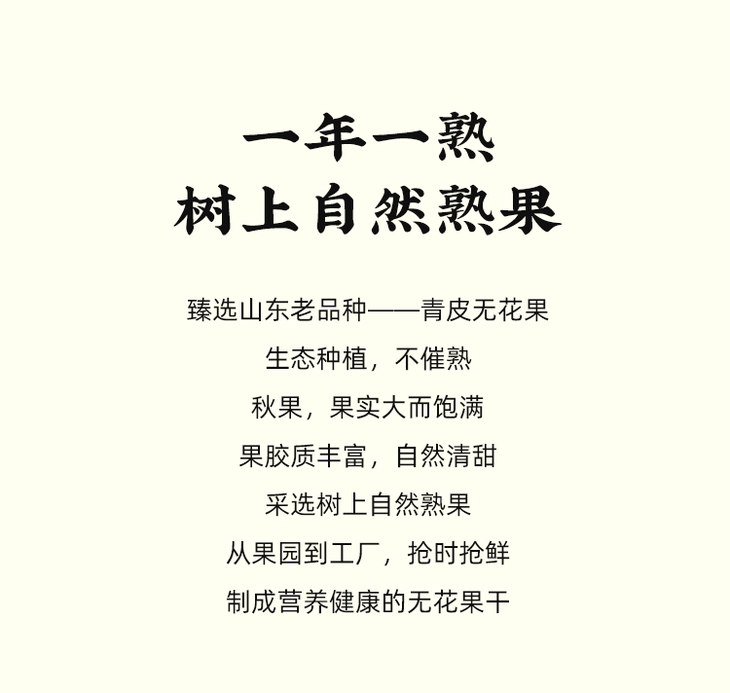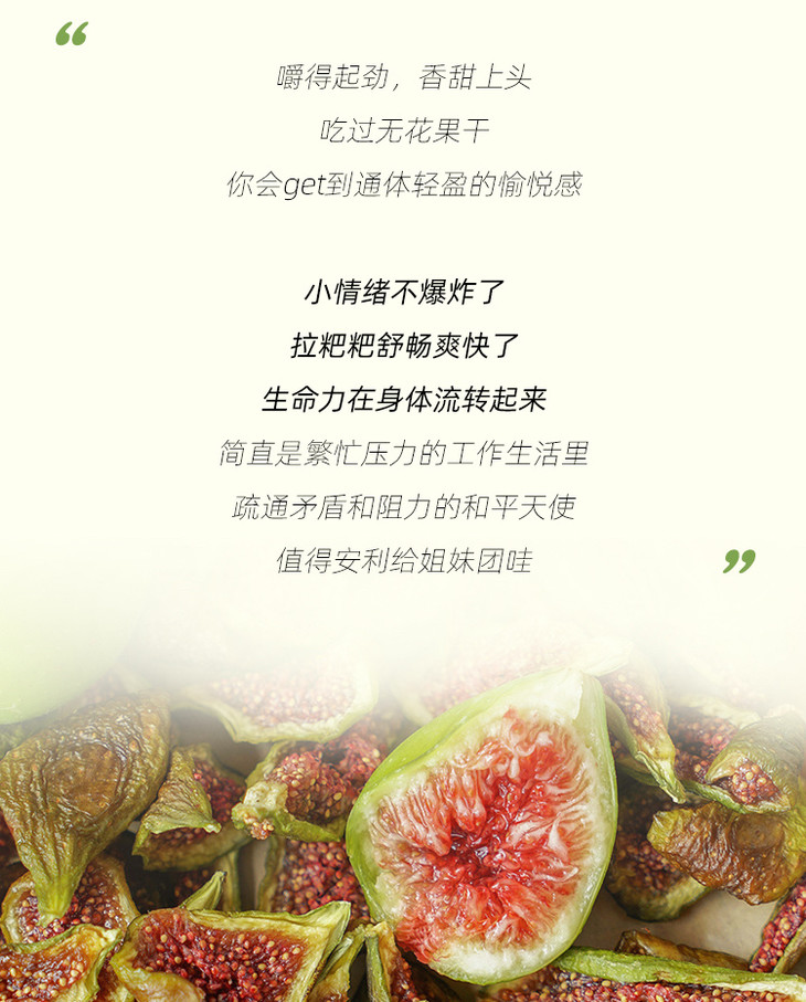 一方云拾的无花果干,简单纯粹,配料表只有无花果,没有其他多余的调味配料,也没有加色素和防腐剂,而无花果本身富含维C和脂肪酶、水解酶等,具有清热解毒、消滞通结、润肠通便的益处,对身体非常友好,真健康零食了。无花果干选择的更是不使用化学农药、不催熟的当季新鲜树上熟布兰瑞克无花果,当天新鲜摘下,经过筛选和清洗,分切成小瓣,然后进行双重控干,保持果干的水分含量在合适的程度,7斤鲜果才出1斤果干,口感狠是优秀。当然,产品也经过第三方质量检测,可以放心炫!