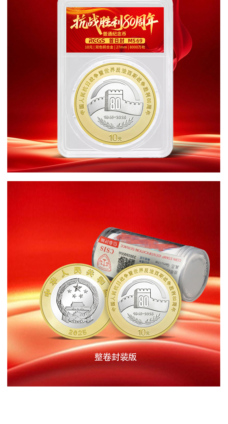 【央行发行】胜利80周年普通纪念币·双色铜合金纪念币·封装版·整筒