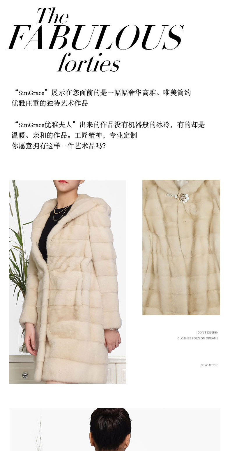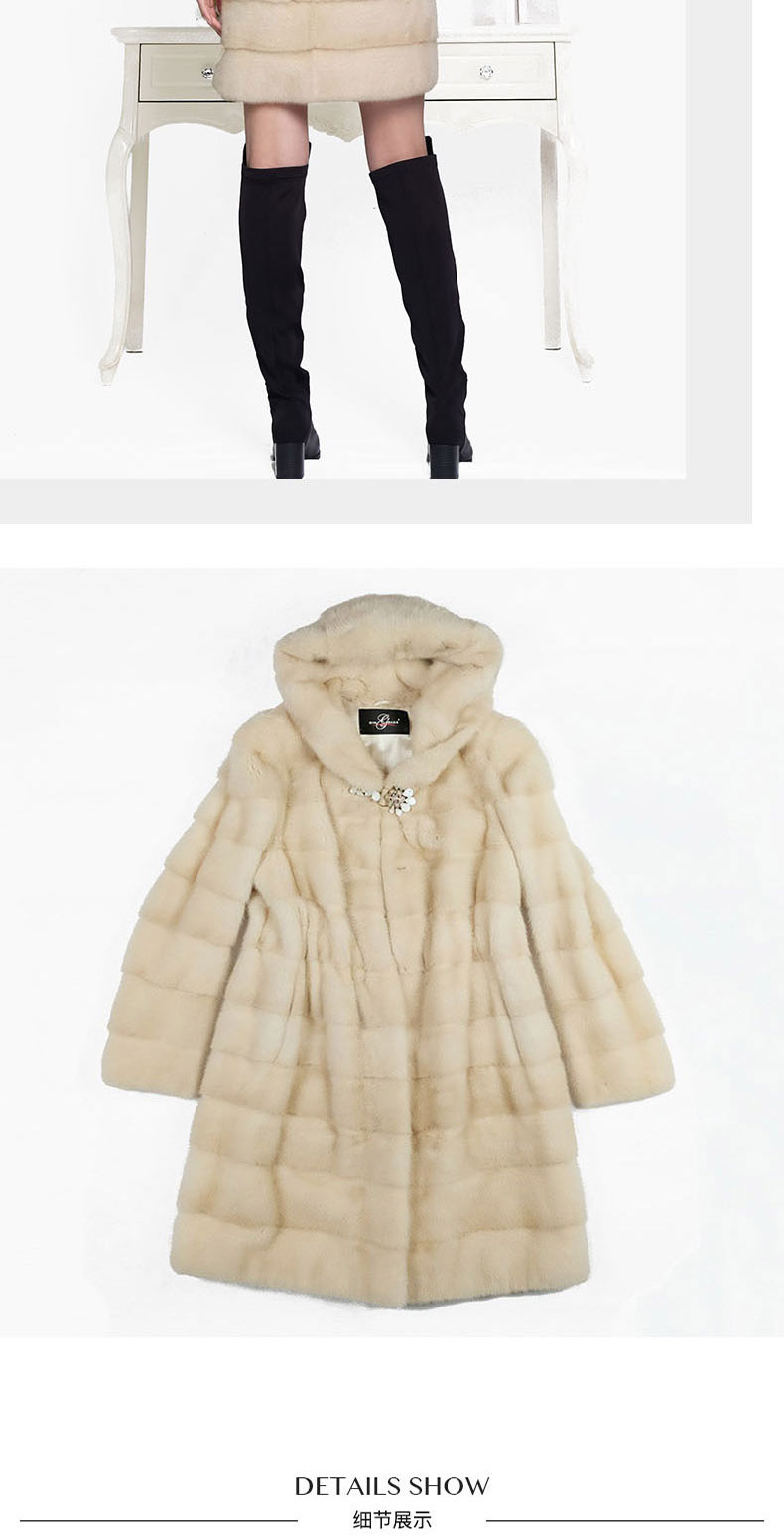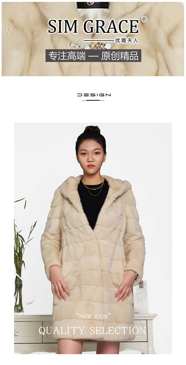 SIM GRACE 优雅夫人 珍珠色进口水貂中长款高贵大气横排工艺连帽外套