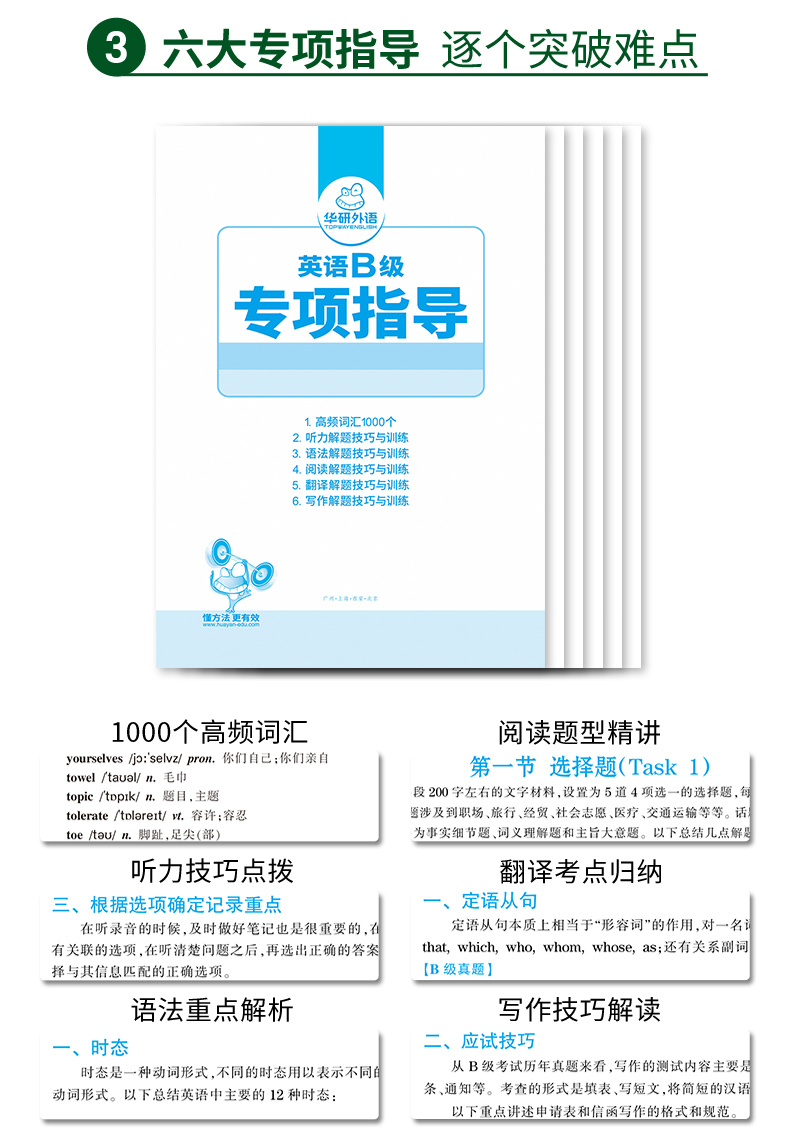 3. 英语B级听力、阅读、语法、翻译、写作5大专项指导及训练+1000高频词汇;