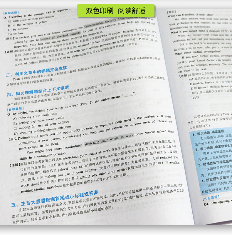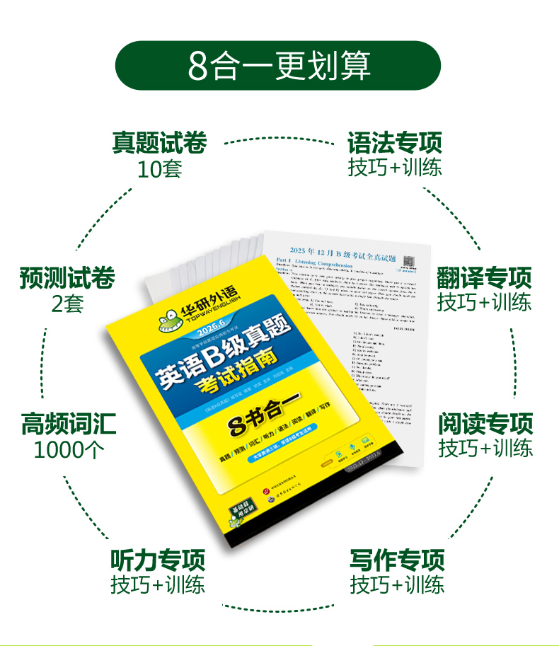 1. 八书合一,含英语B级真题详解+预测试卷+高频词汇+听力专项+阅读专项+语法专项+翻译专项+写作专项,一本过级;