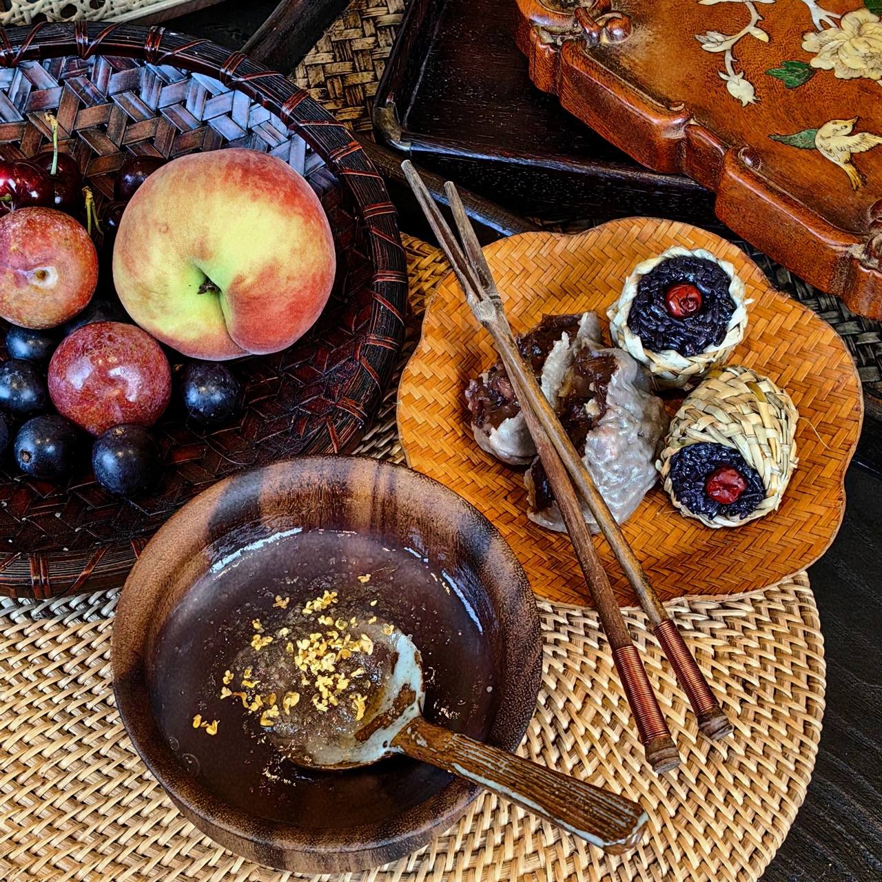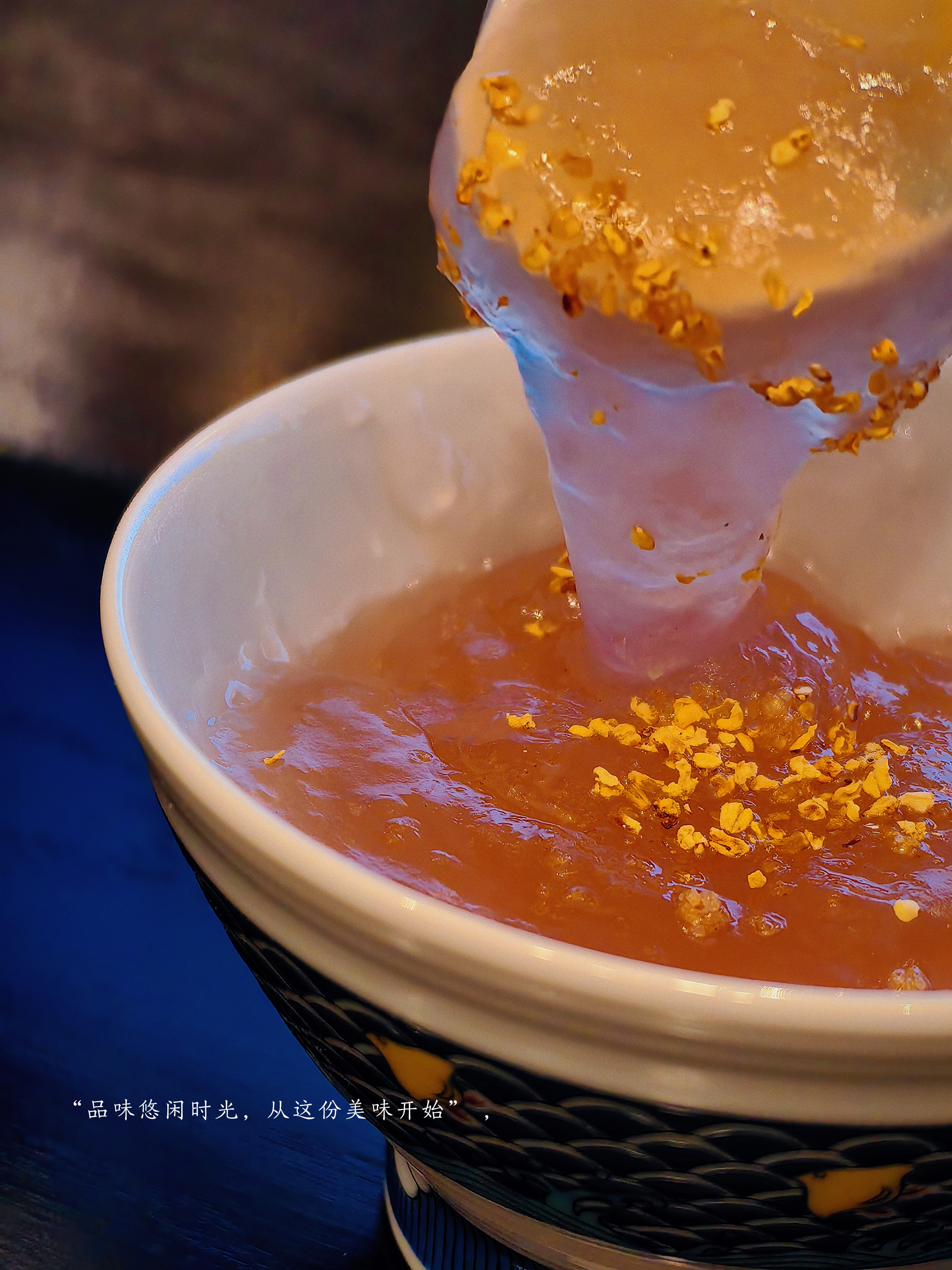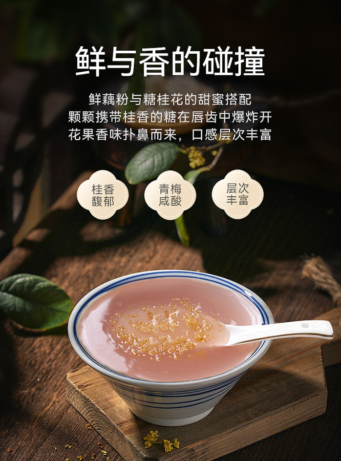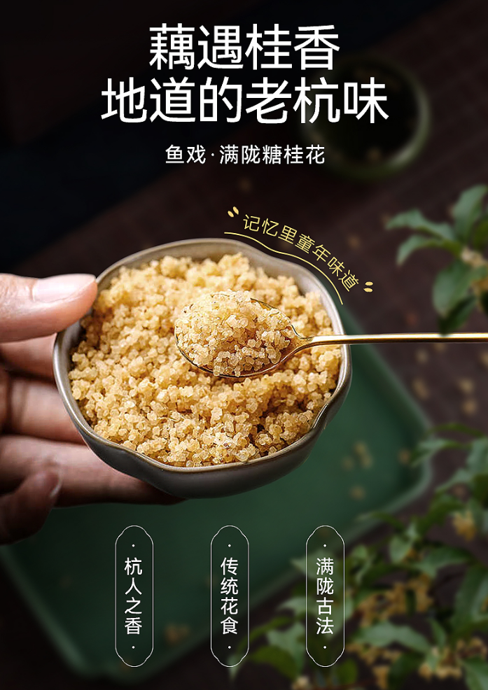 藕粉搭档桂花糖也给大家备上了,用的是杭州满陇桂花,再加大青梅,口感丰富,桂香浓郁,再加上青梅的咸酸,与鱼戏鲜藕粉搭配,不仅美味,更增添了一份老杭州的风味。