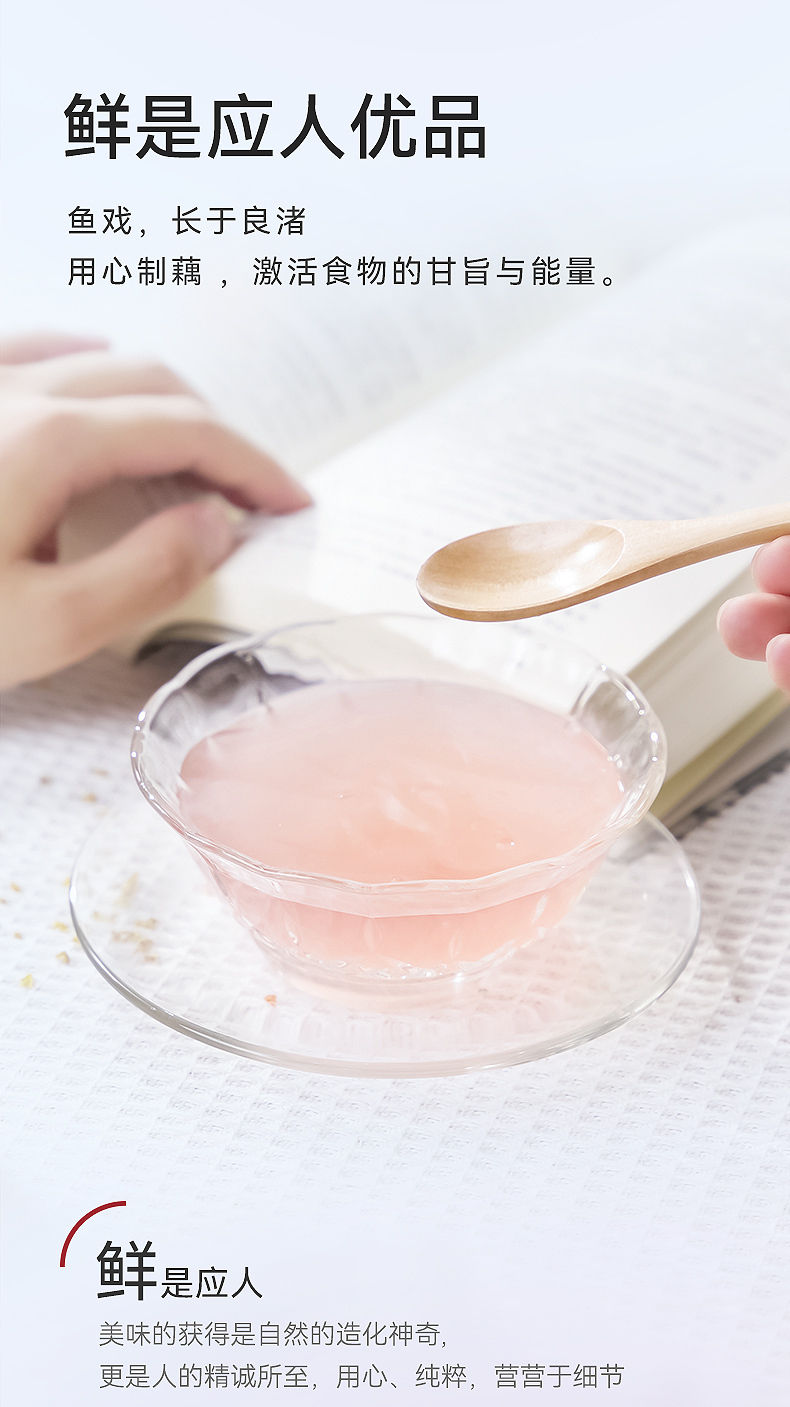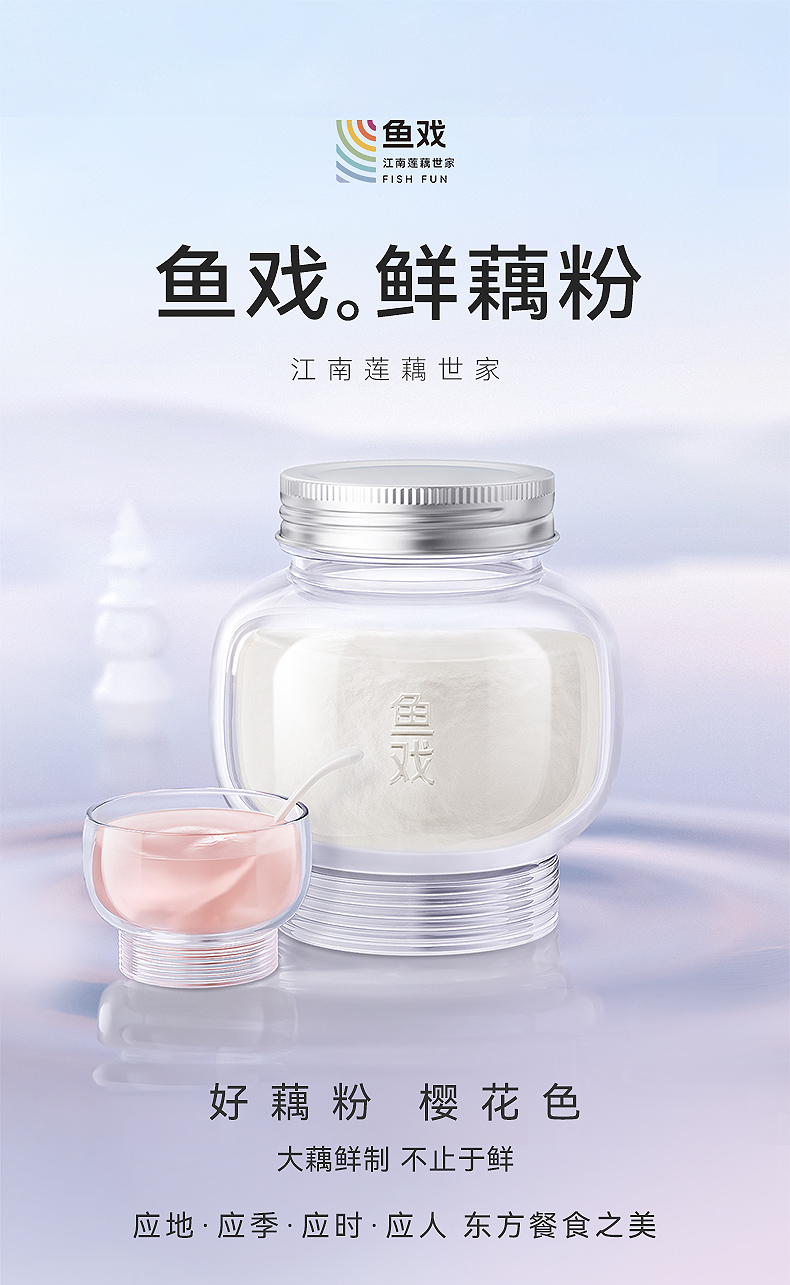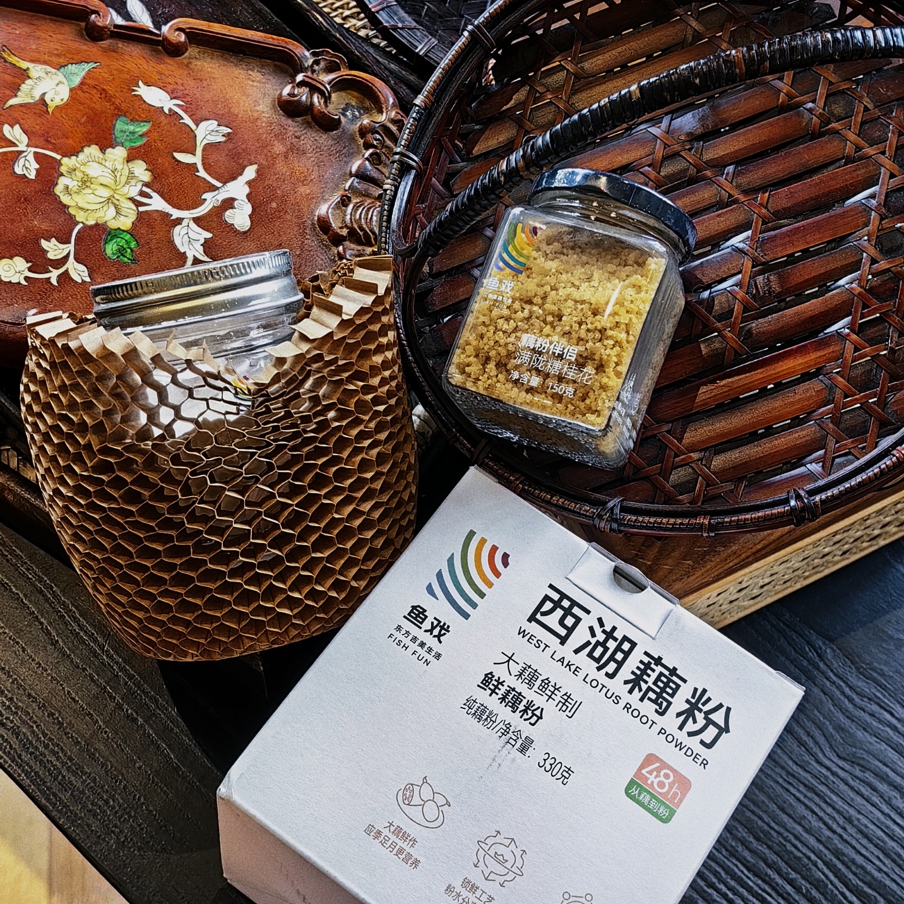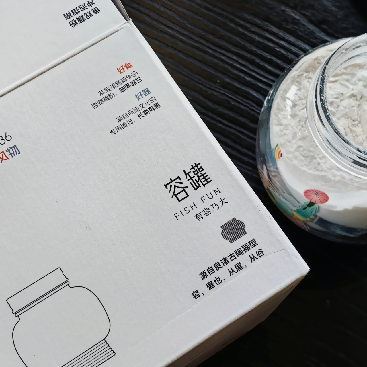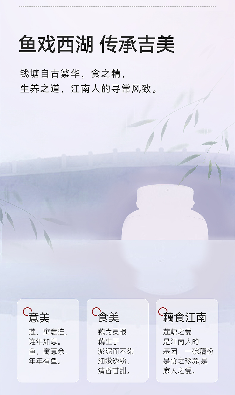 为了制作优秀的鲜藕粉,鱼戏精选来自北纬30°黄金藕带的大藕,自然生长270天,拥有丰富的膳食纤维、钙铁元素、多酚等!为了让藕粉更新鲜营养,更是在48小时内完成从藕田到藕粉的鲜制过程,天然多酚含量高达140mg/100g,有助于增强免疫力、kang氧化、kang老老、kang炎等,配料表中仅有纯藕粉,0额外添加糖、0色素、0防腐剂、0脂肪,真正做到了健康、安全、纯净。包装也很美貌,灵感源自良渚古陶器,透明圆润的罐身上印有杭州著名的三潭映月石塔,充满了江南韵味,超美貌!