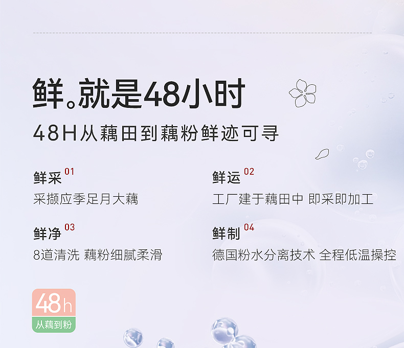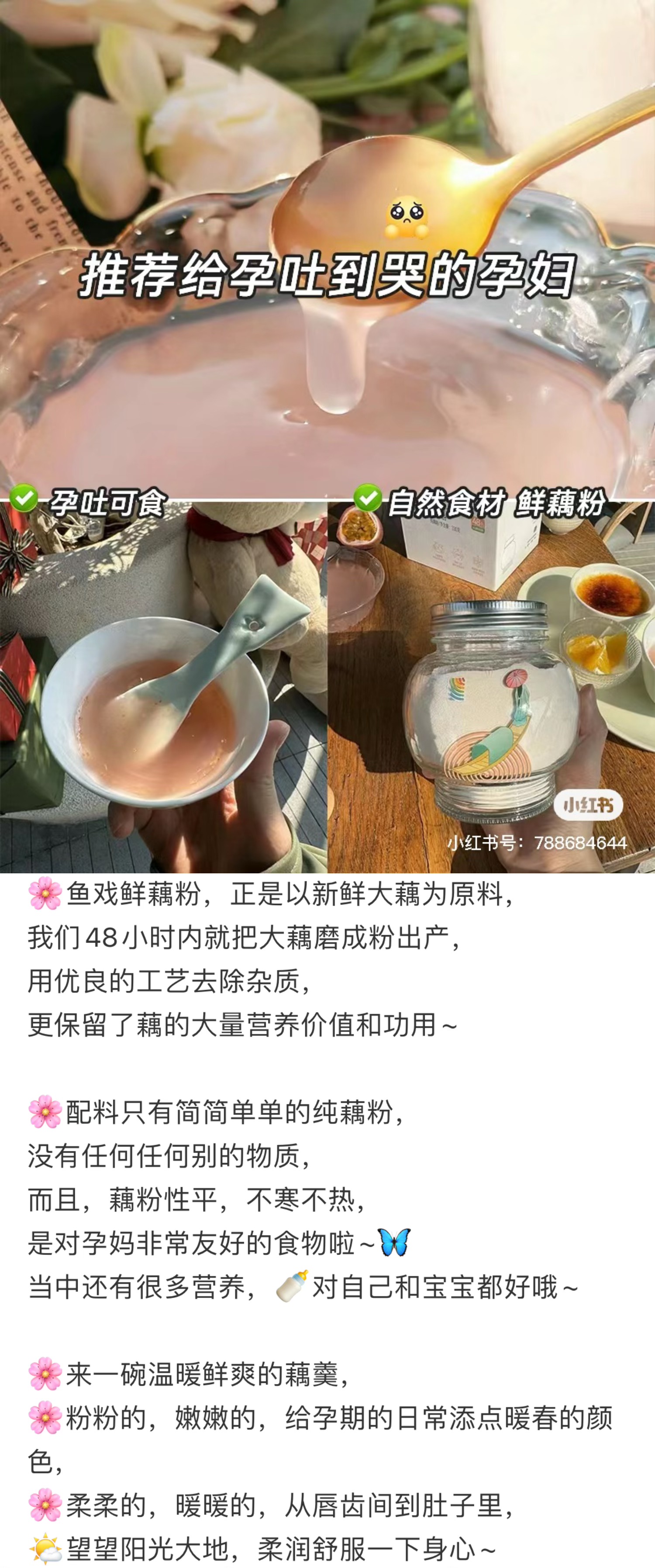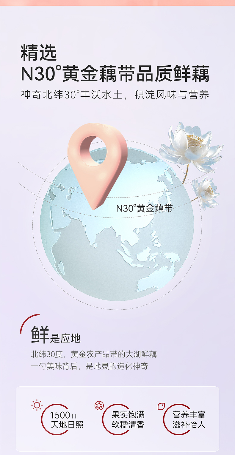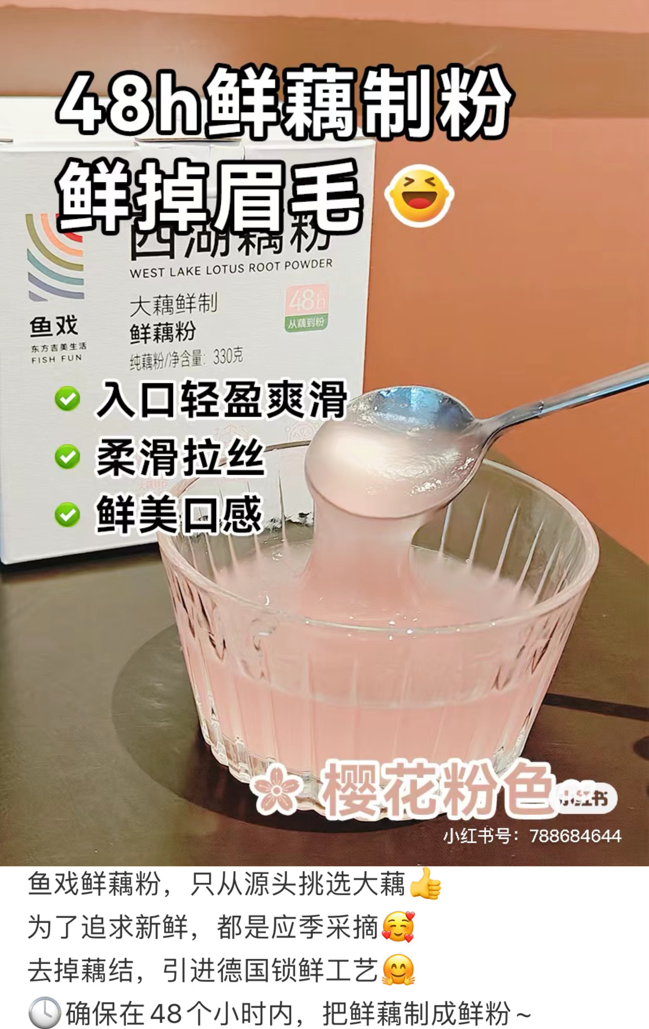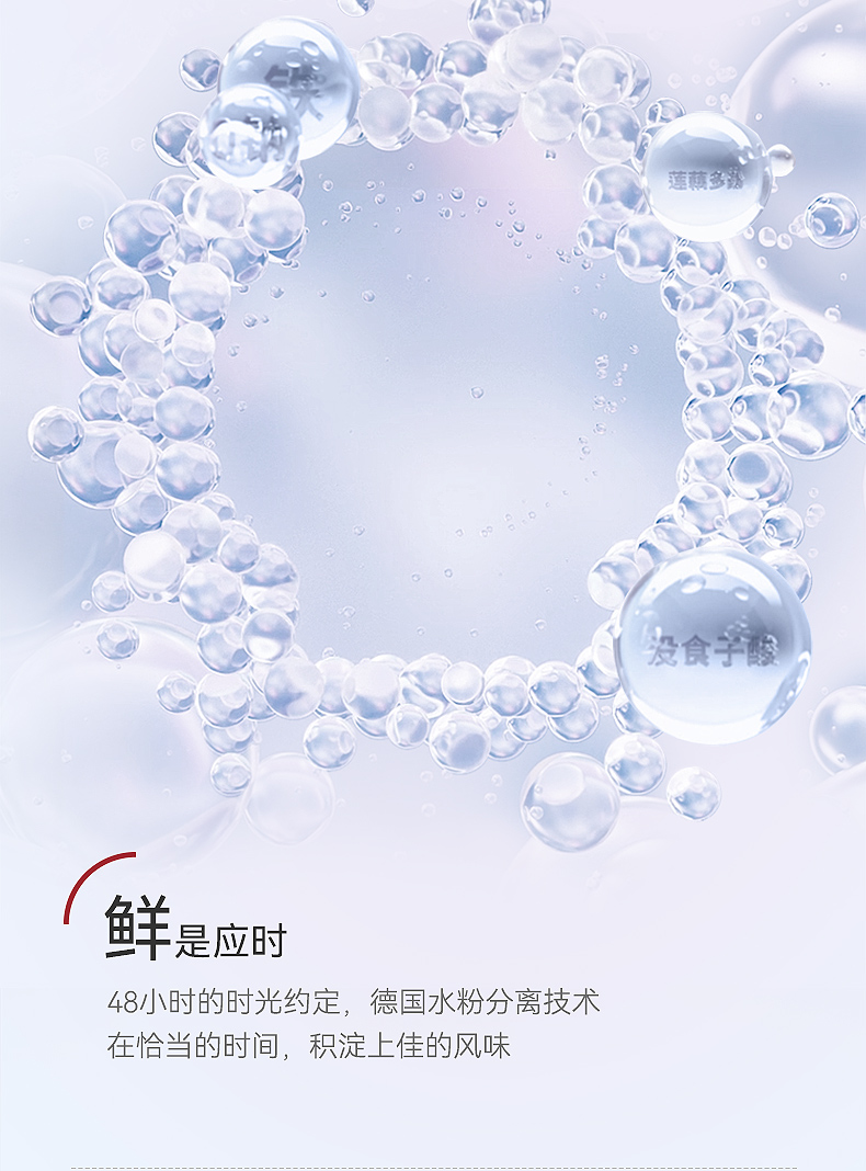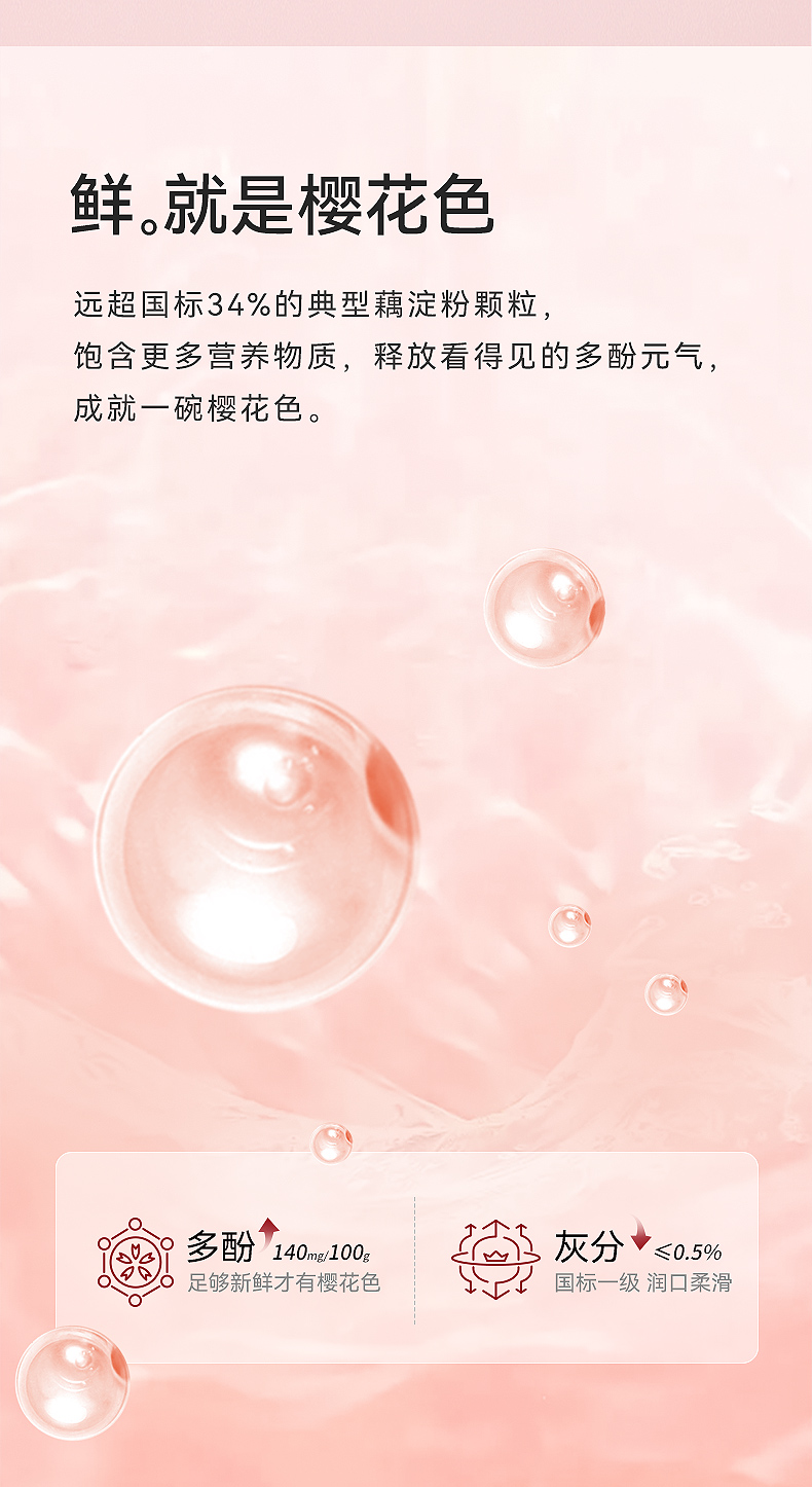 为了制作优秀的鲜藕粉,鱼戏精选来自北纬30°黄金藕带的大藕,自然生长270天,拥有丰富的膳食纤维、钙铁元素、多酚等!为了让藕粉更新鲜营养,更是在48小时内完成从藕田到藕粉的鲜制过程,天然多酚含量高达140mg/100g,有助于增强免疫力、kang氧化、kang老老、kang炎等,配料表中仅有纯藕粉,0额外添加糖、0色素、0防腐剂、0脂肪,真正做到了健康、安全、纯净。包装也很美貌,灵感源自良渚古陶器,透明圆润的罐身上印有杭州著名的三潭映月石塔,充满了江南韵味,超美貌!