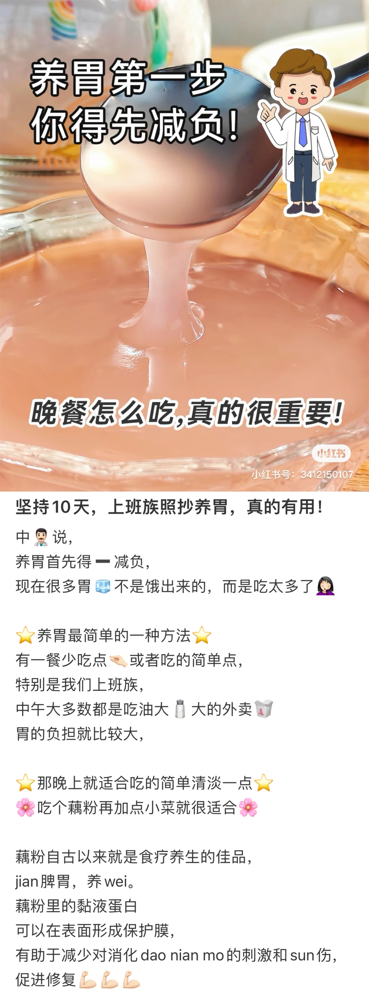 藕粉冲泡很是简单。取粉10g放入碗中;再加入20ml冷水化开藕粉,搅拌至无阻塞感;最后,用150ml沸水快速冲入后轻轻搅拌均匀。记得水温要保持在90°以上哦,否则会影响冲泡效果。再撒上桂花糖,或加入一些坚果,就是一顿营养丰富的主食了!藕粉低GI的慢碳特性,对于维持血糖水平是有一定帮助,而且热量好低,减脂期也可以适量吃吃!