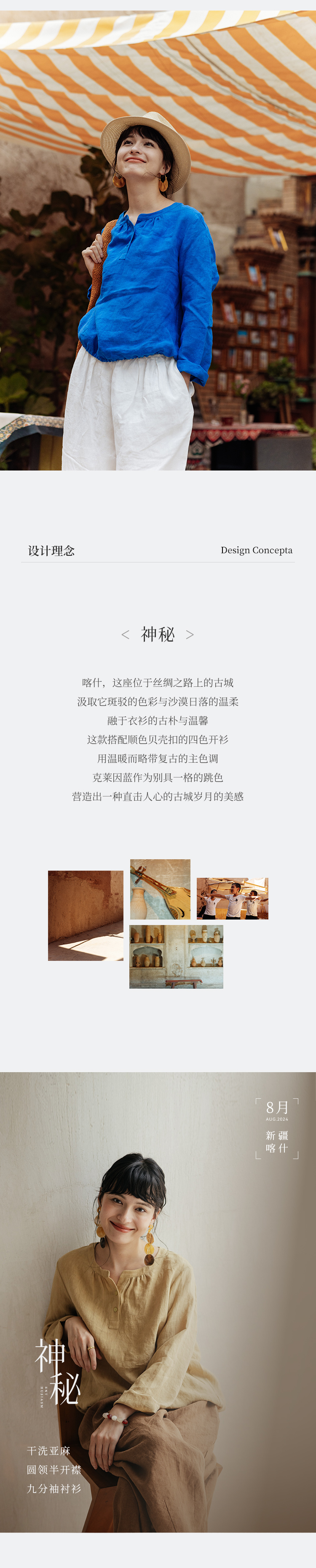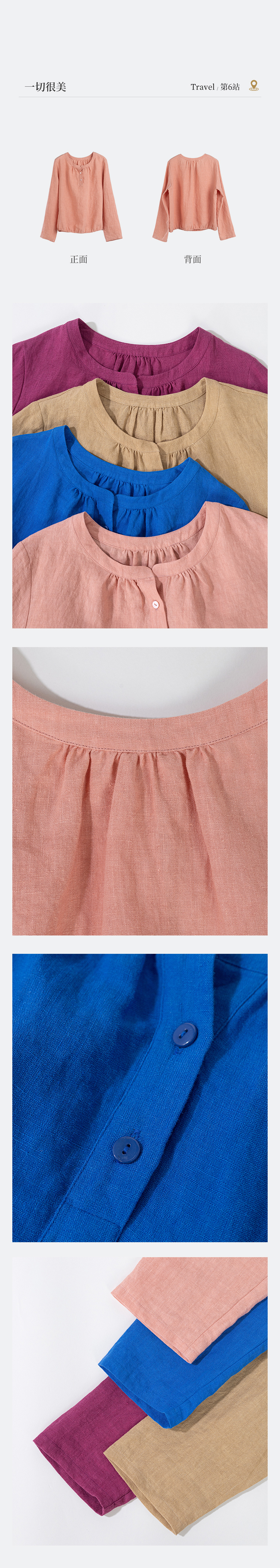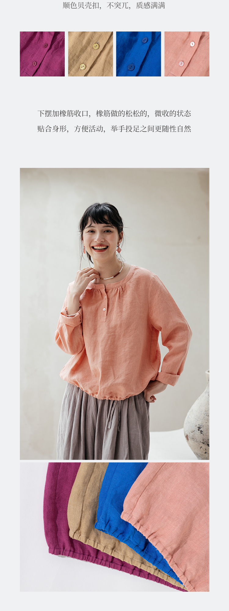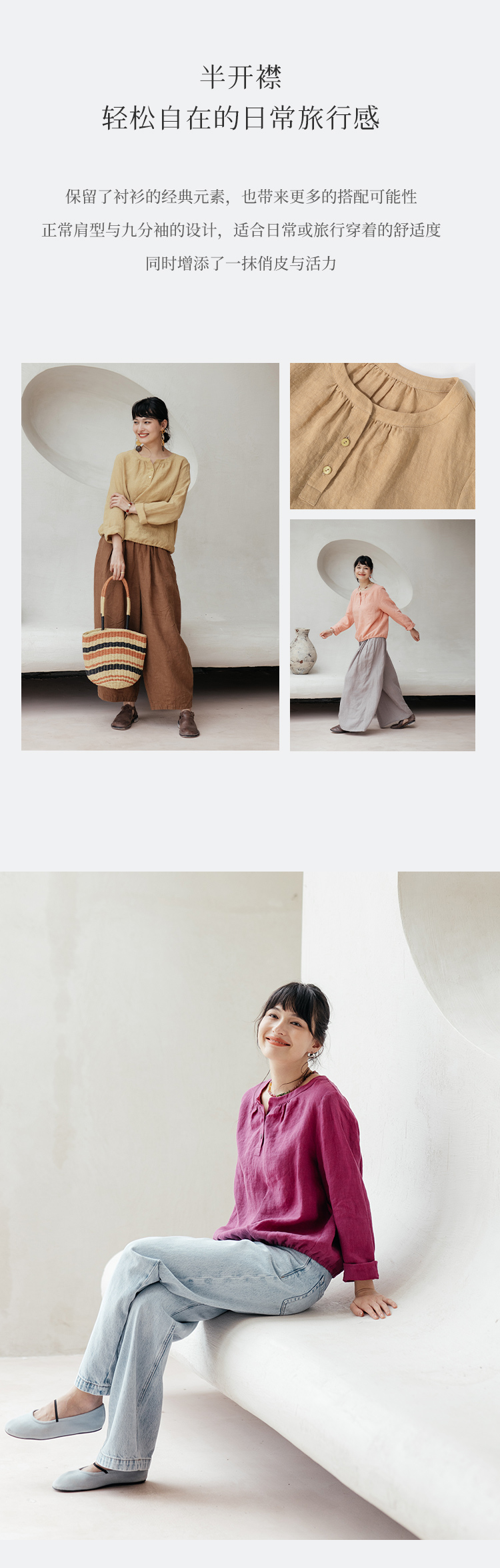 绽放旅行女装589朵/干洗亚麻圆领半开襟九分袖衬衫下摆收口小衫