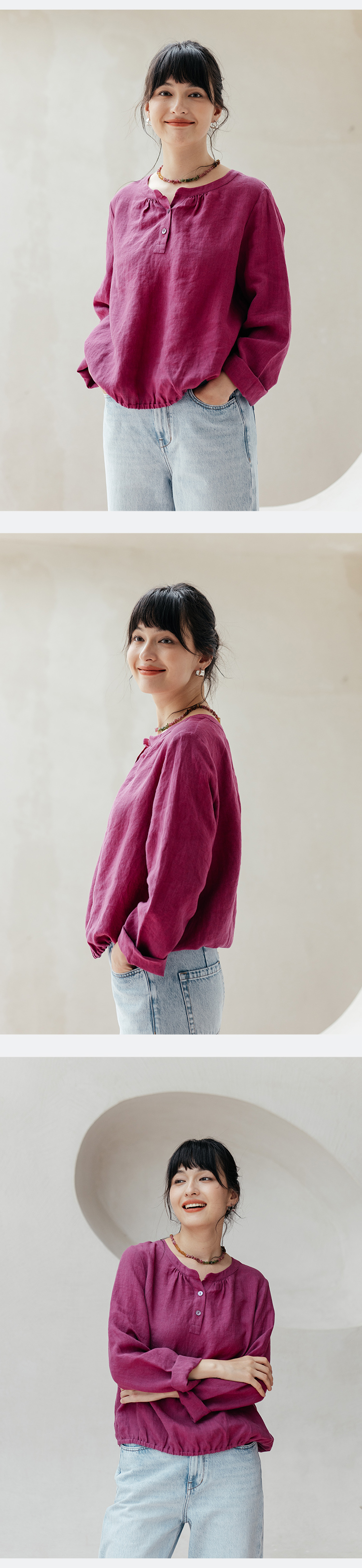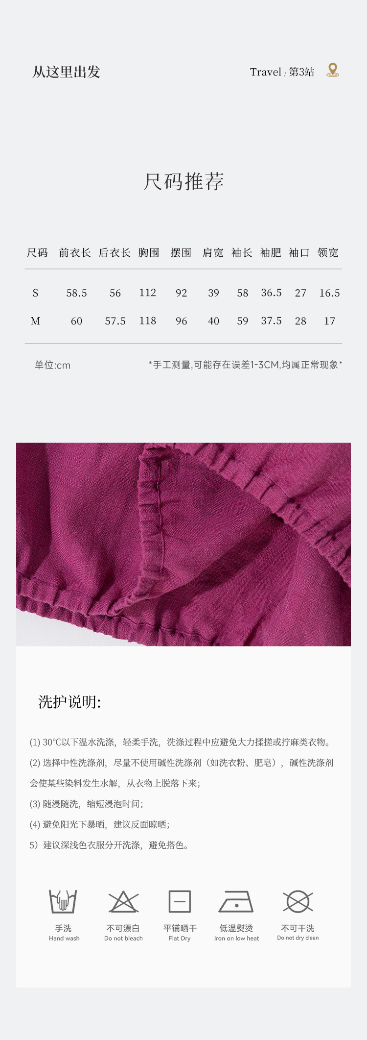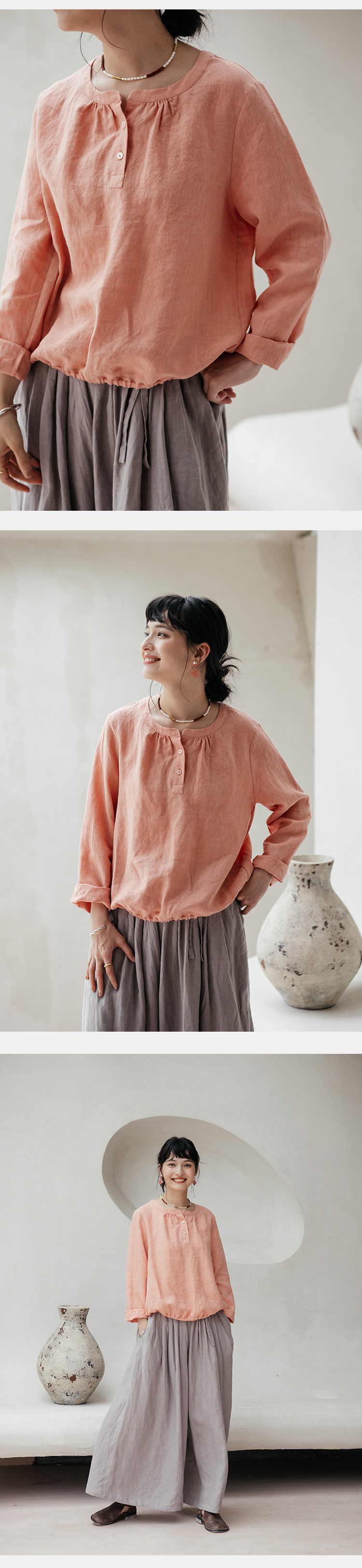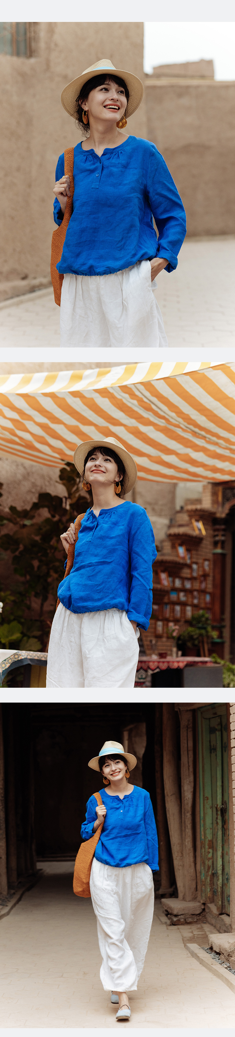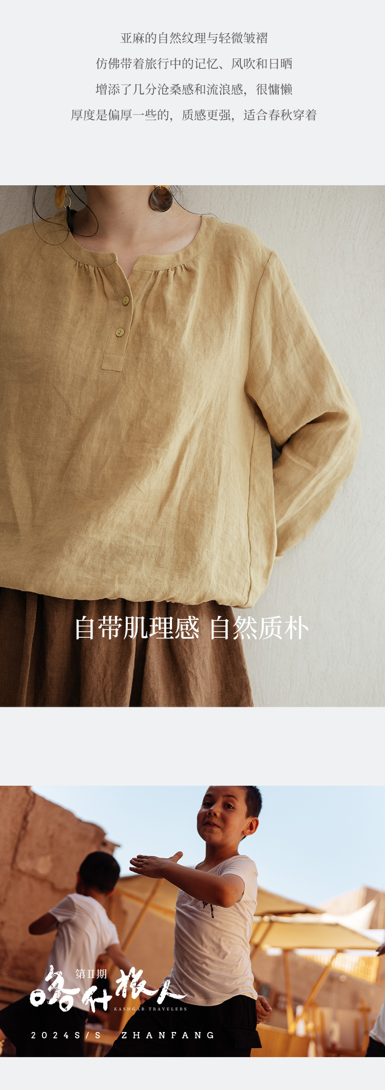 绽放旅行女装589朵/干洗亚麻圆领半开襟九分袖衬衫下摆收口小衫