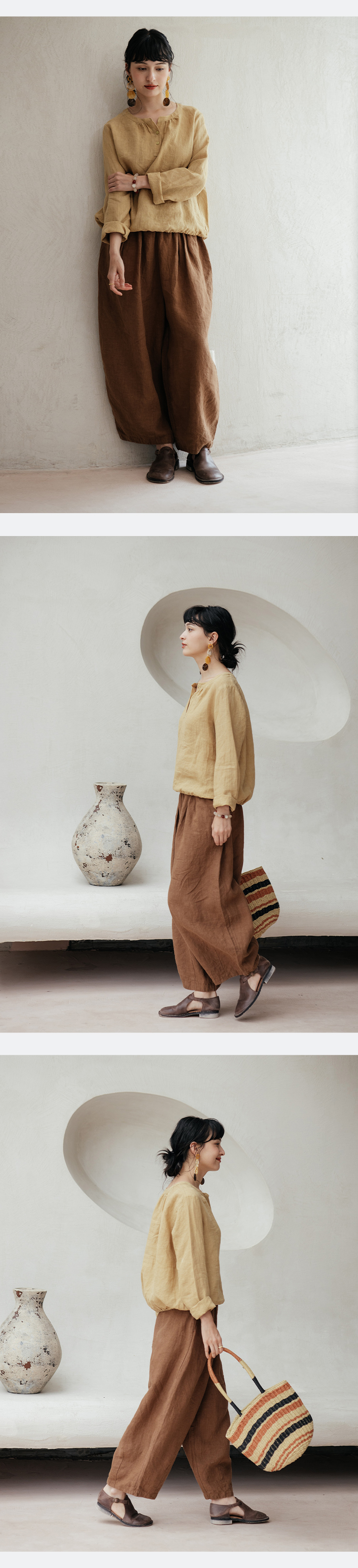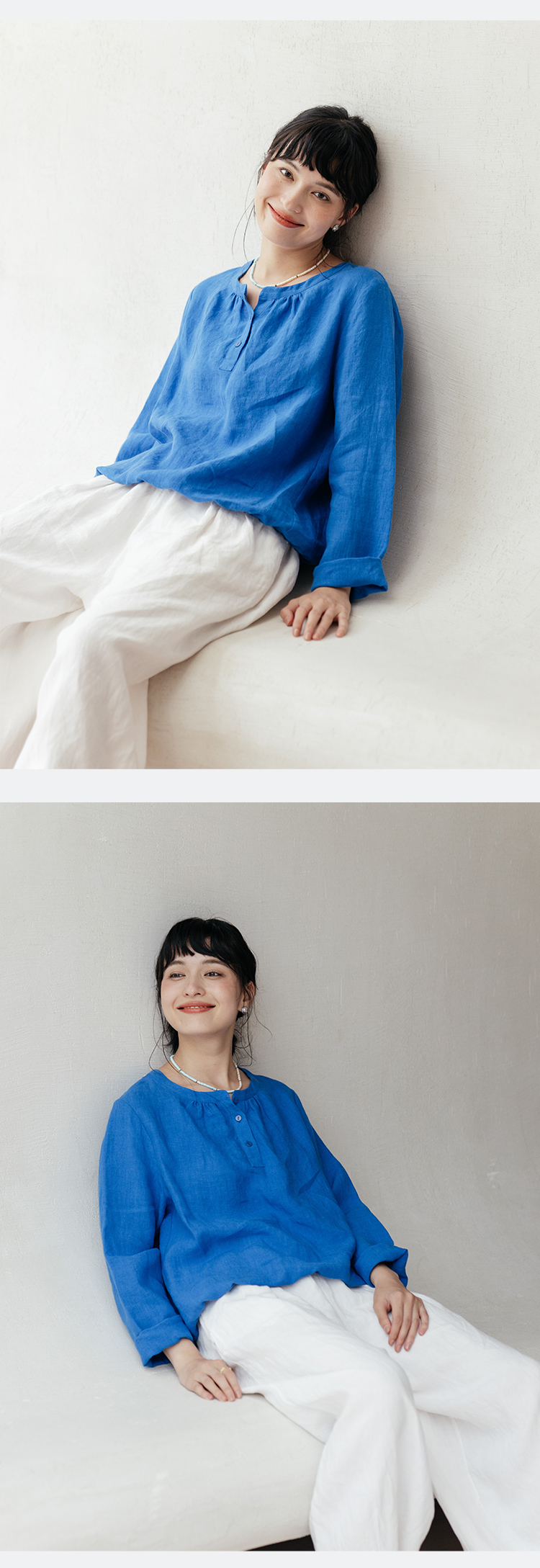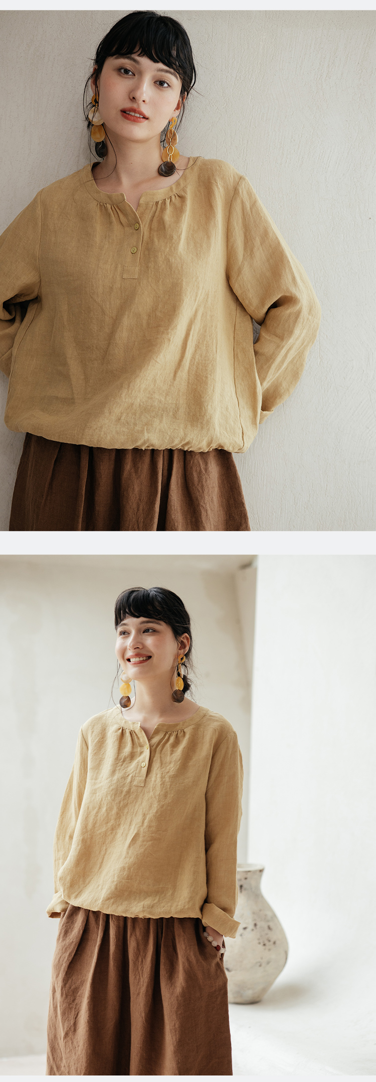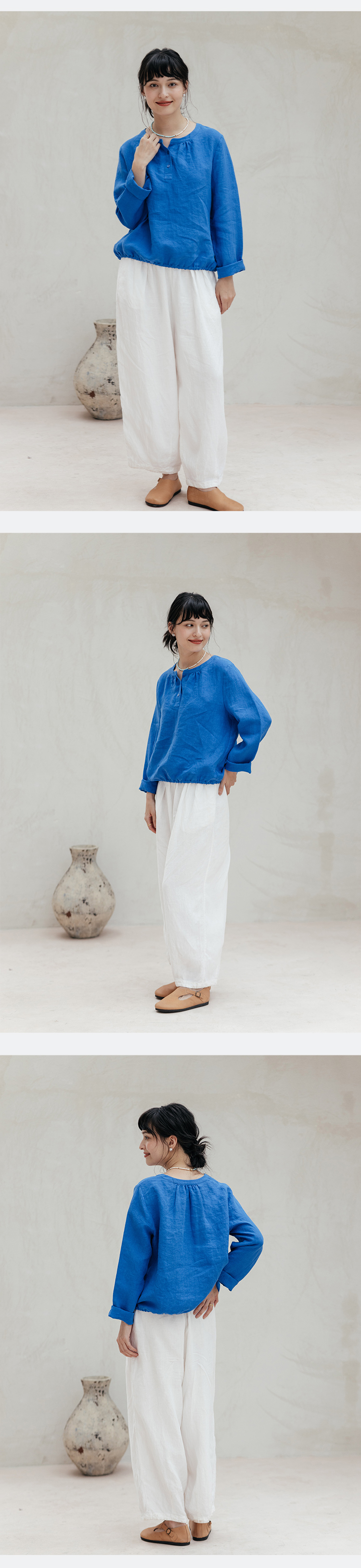 绽放旅行女装589朵/干洗亚麻圆领半开襟九分袖衬衫下摆收口小衫