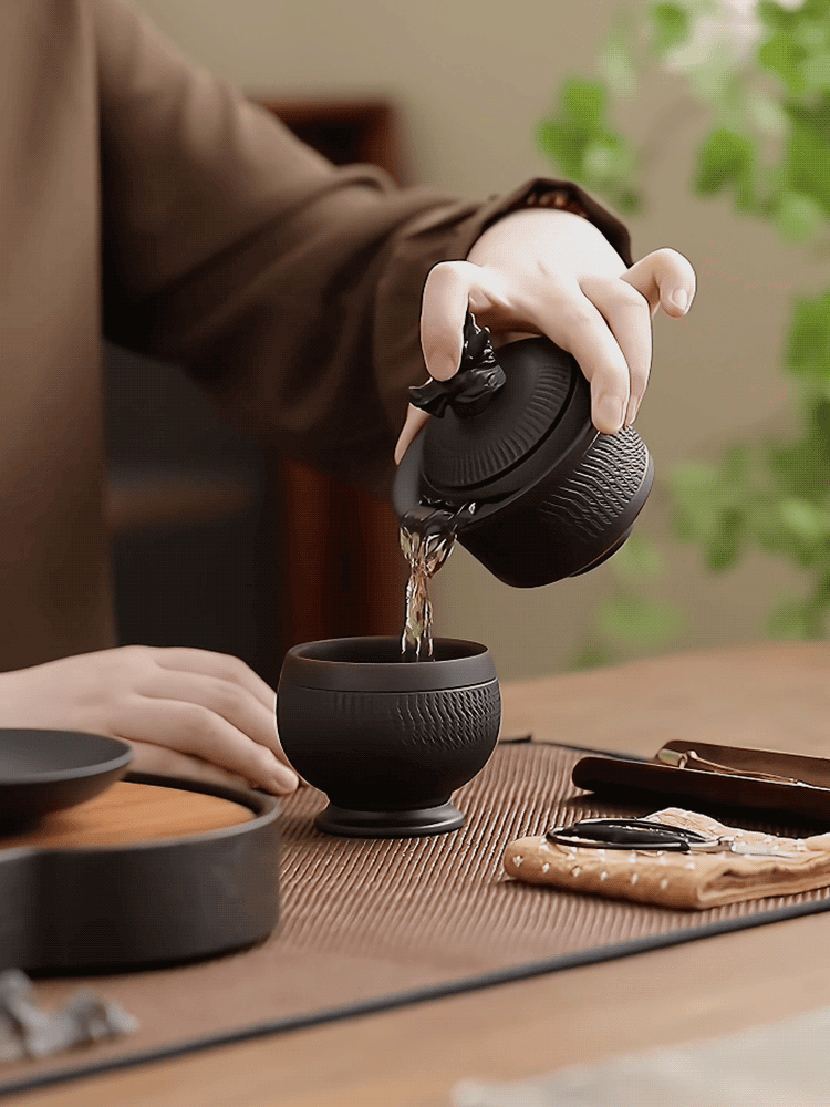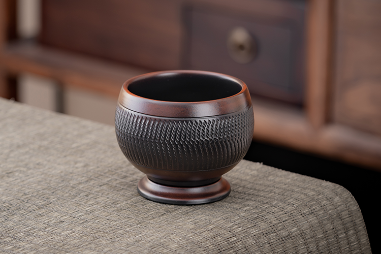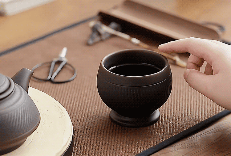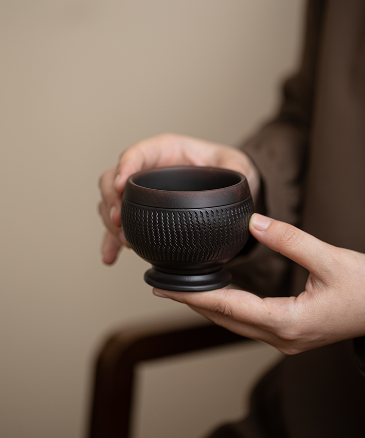 杯壁触感温润如脂,哑光釉面流转着紫陶特有的金属光泽,既有青铜器的古朴厚重,又暗含现代极简美学。