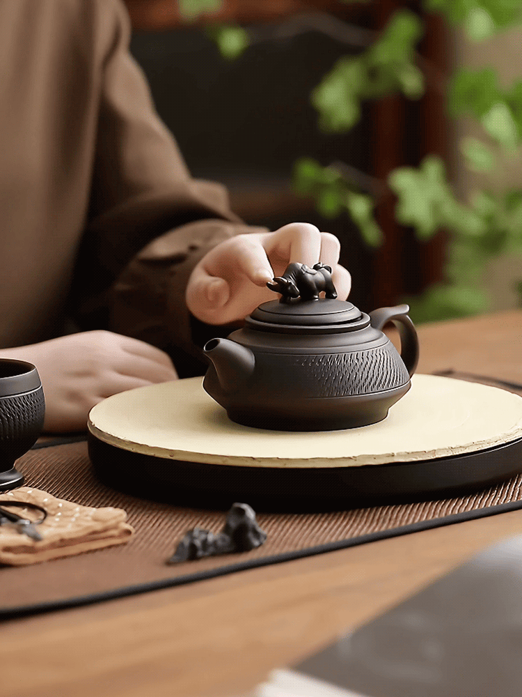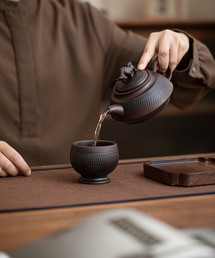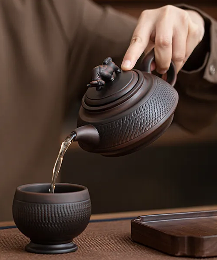 跳刀纹的奥妙在于实用与美学的共生——凹凸肌理既防滑防烫,又让光影在茶席间流转。