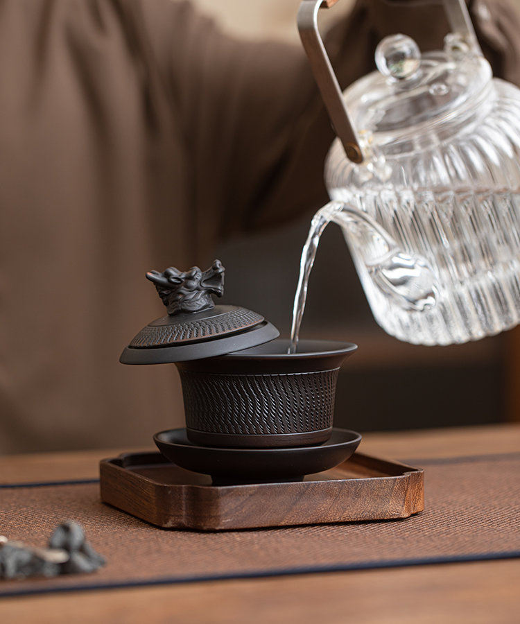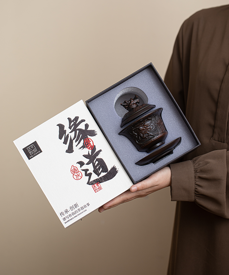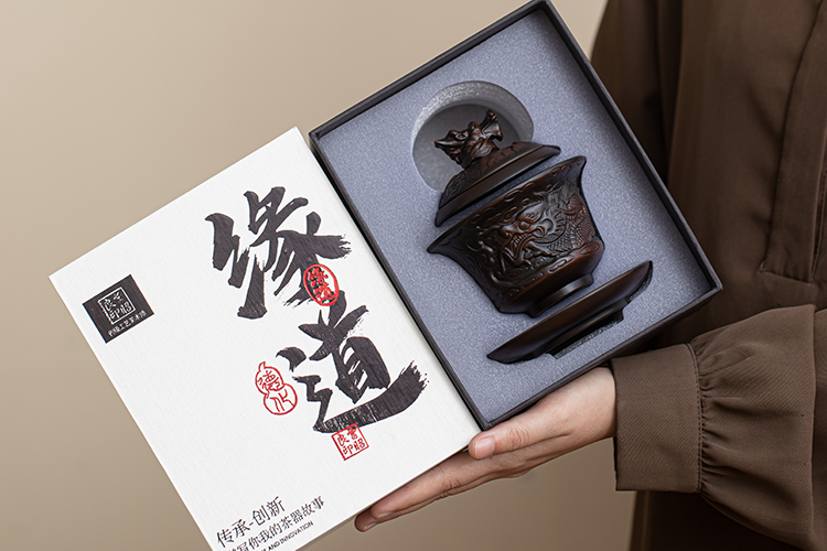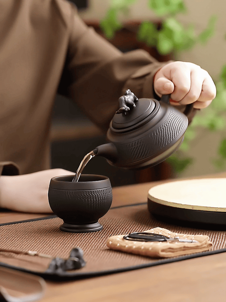 这款茶具以纯手工雕刻为核心灵魂,从盖钮瑞兽到器身纹路,皆由匠人执刀倾注心血,将冰冷的泥土化作承载东方哲思的艺术品。