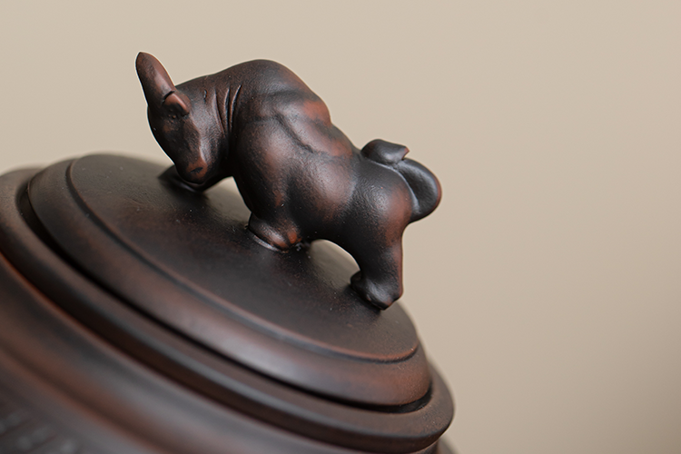 器身跳刀纹凹凸有致,触感防滑,搭配手工打磨的哑光釉面,既有青铜器的古朴厚重,又兼具现代极简美学,十二生肖盖钮更是一绝:
