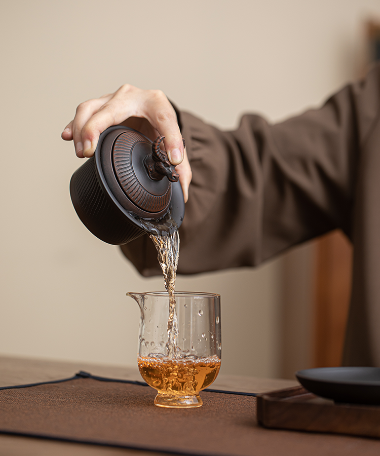 壶身重心精准校准,单手持握如拈花,倾倒时水流如银河倾泻,断水时壶嘴微抬即止,茶汤如刀切般利落。