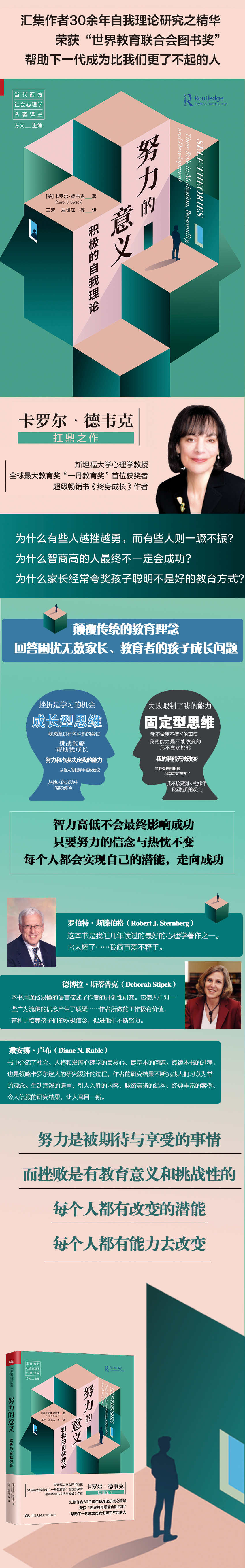 卡罗尔 • 德韦克,斯坦福大学心理学教授,美国艺术与科学院院士,动机、人格及发展心理学领域研究*导者。她贡献*著,获奖无数,包括美国人格与社会心理学会杰出学者奖(2013)、美国心理学会杰出科学贡献奖(2011)、美国心理学会桑代克教育心理学专业成就奖(2010)等。2017年,德韦克教授因自我理论的相关研究成为全球*大教育奖“一丹教育奖”首位获奖者。