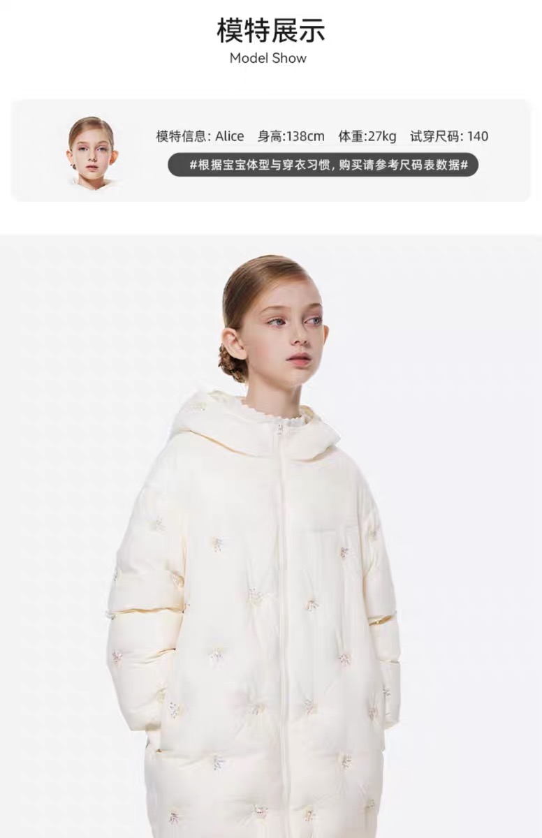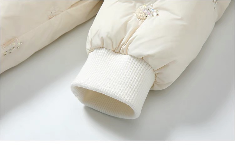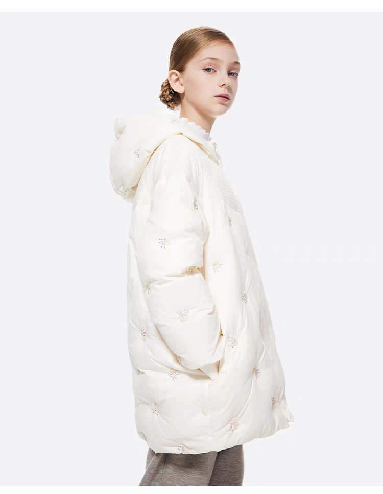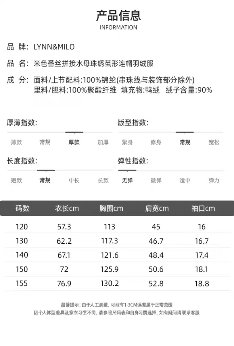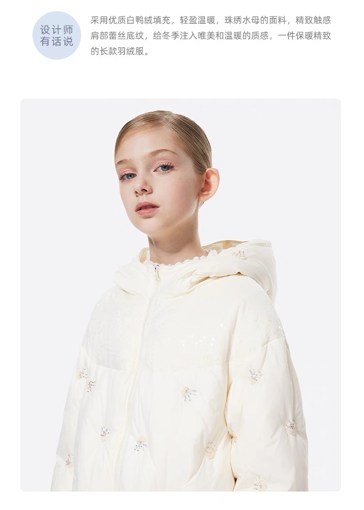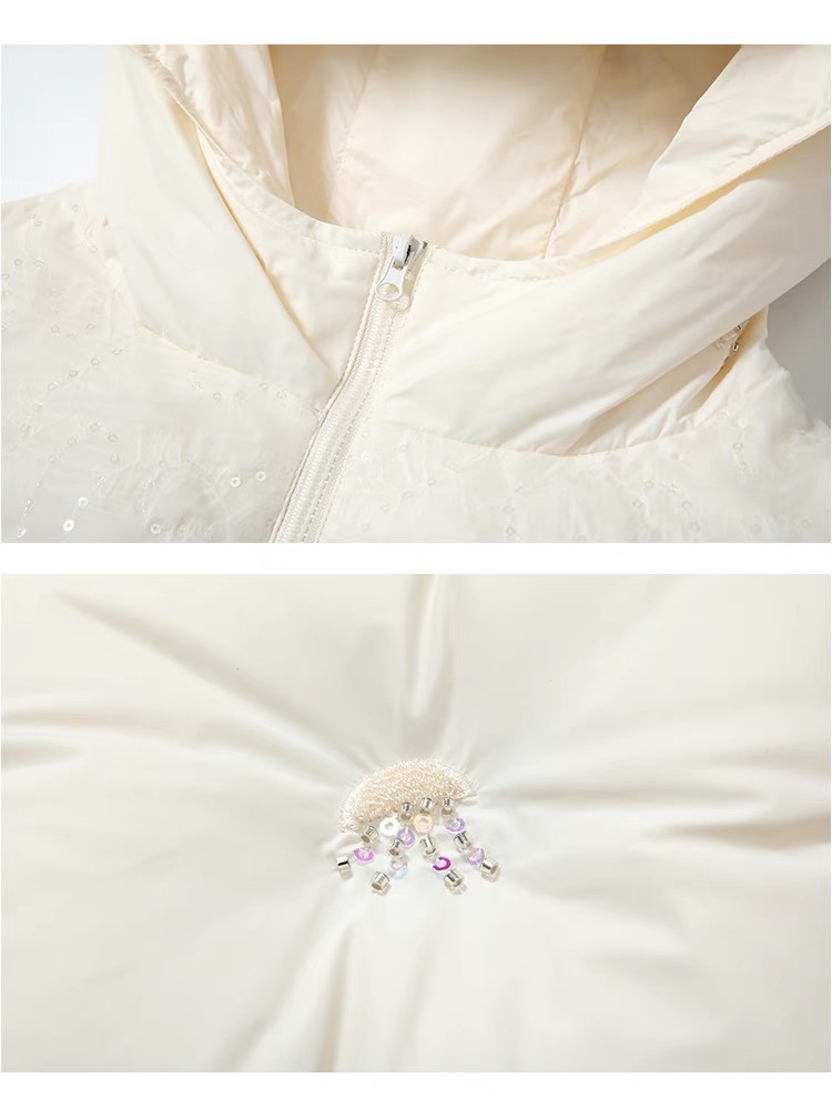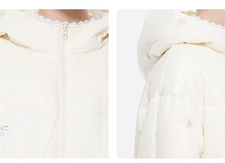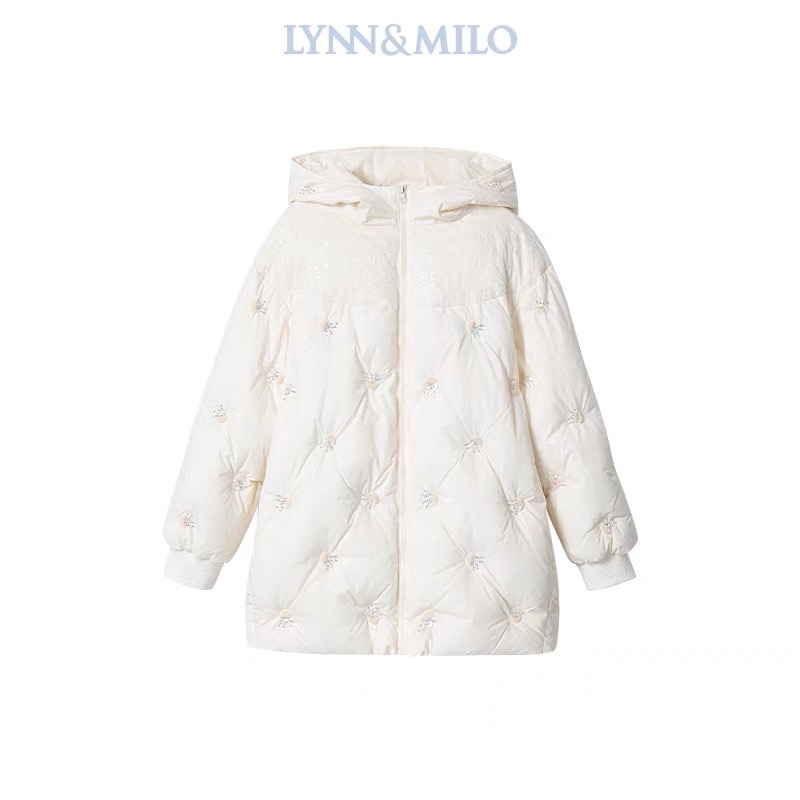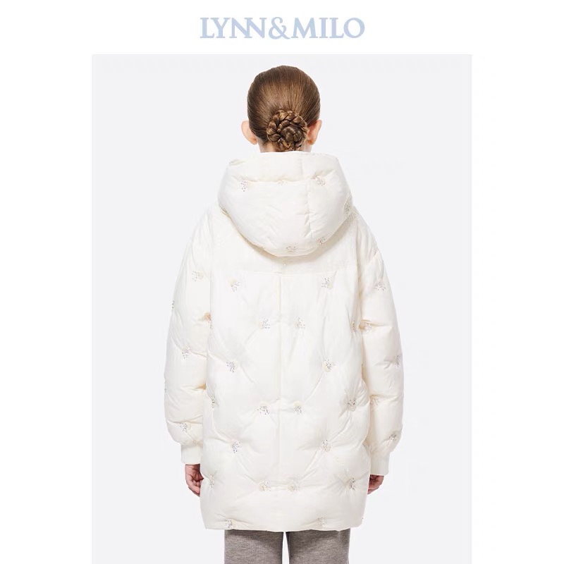【春上新】8楼琳麦罗 LYNN&MILO 米色蕾丝拼接水母珠绣茧形连帽羽绒服