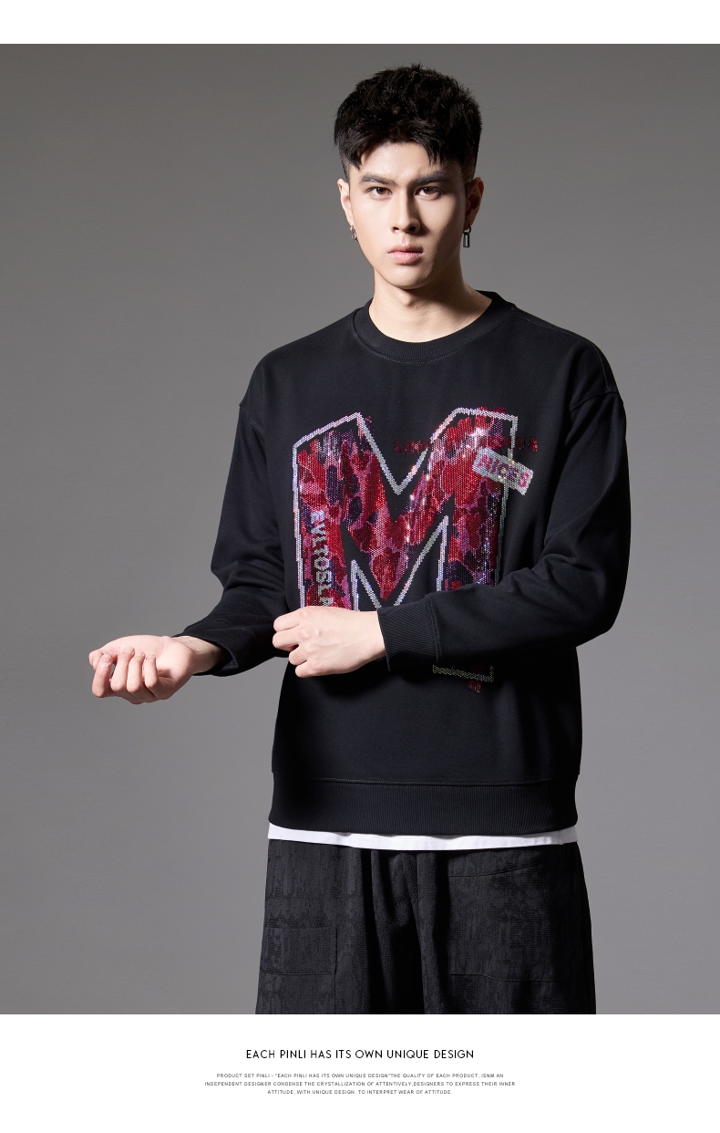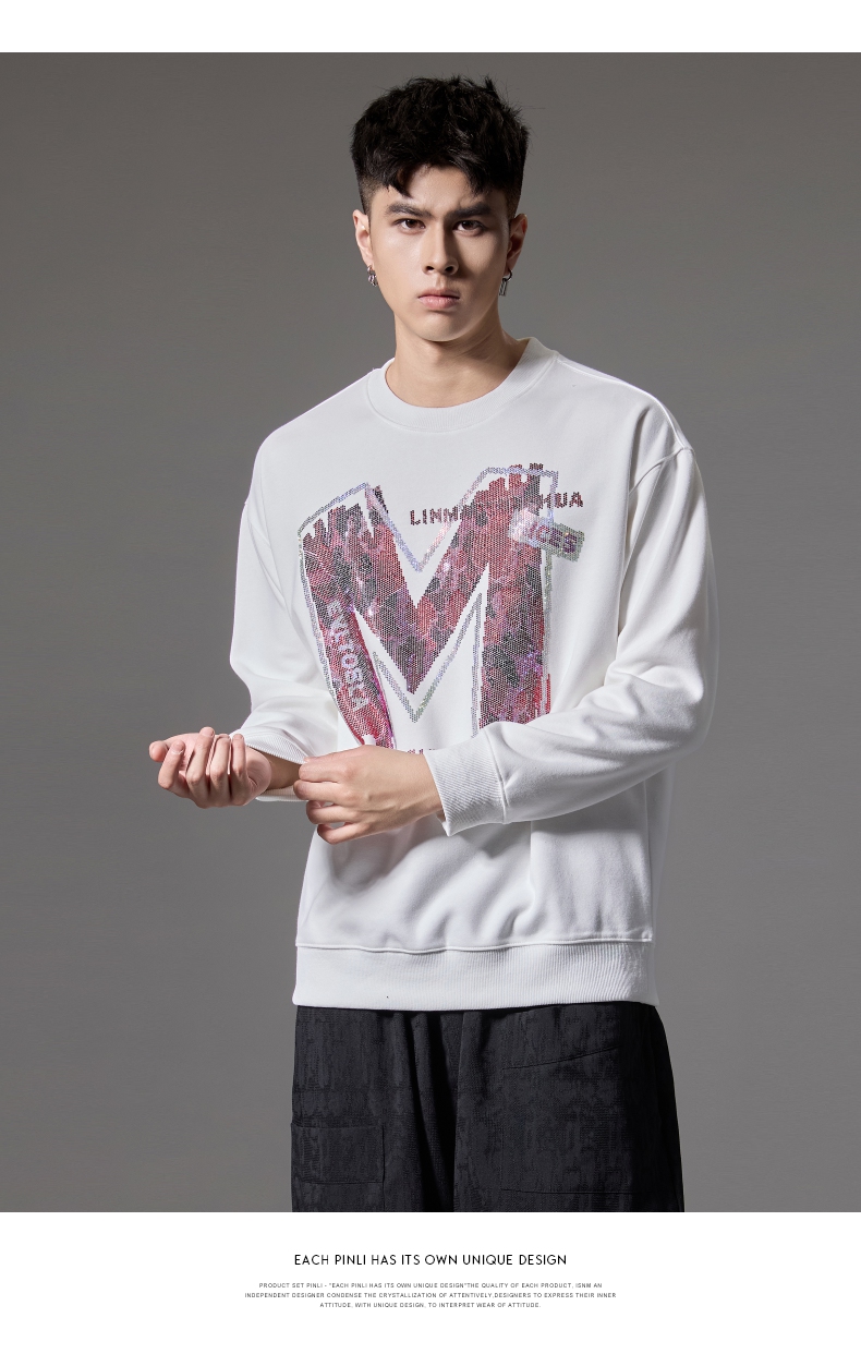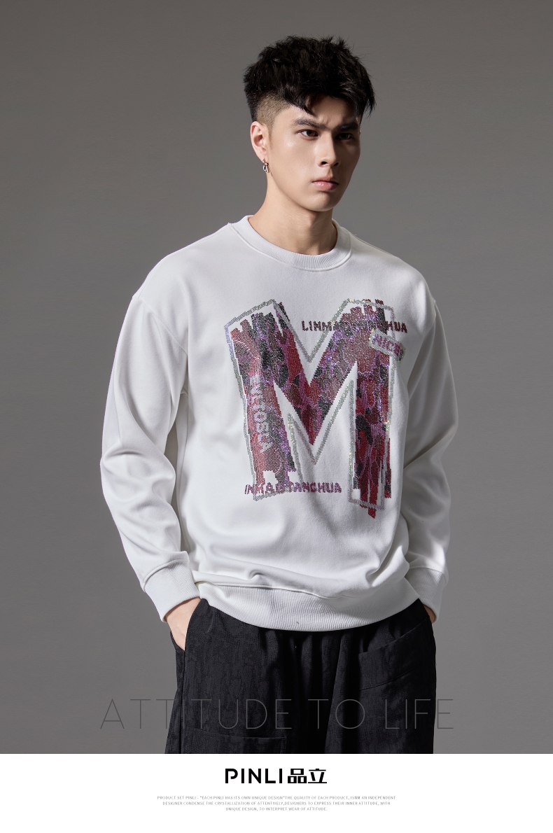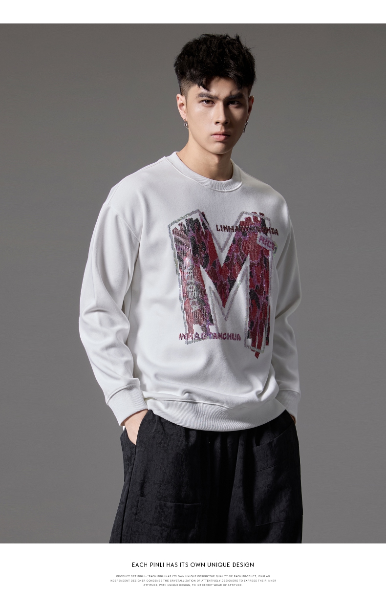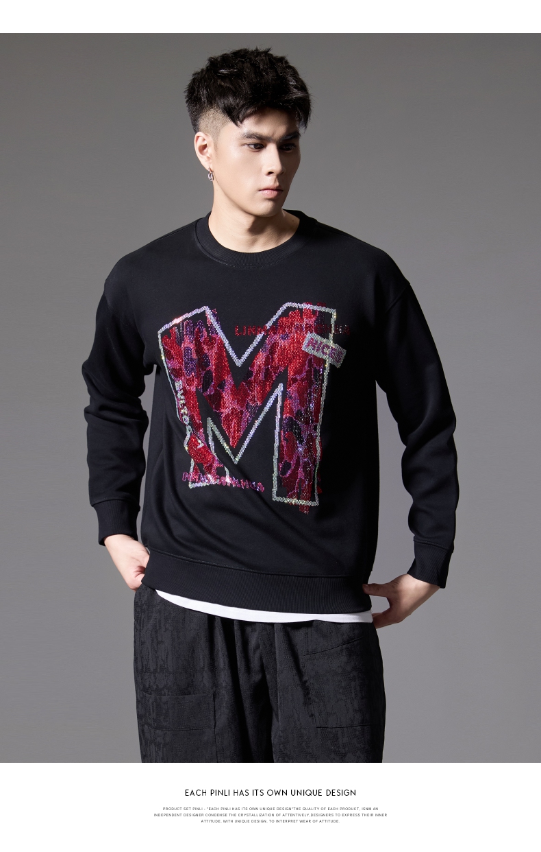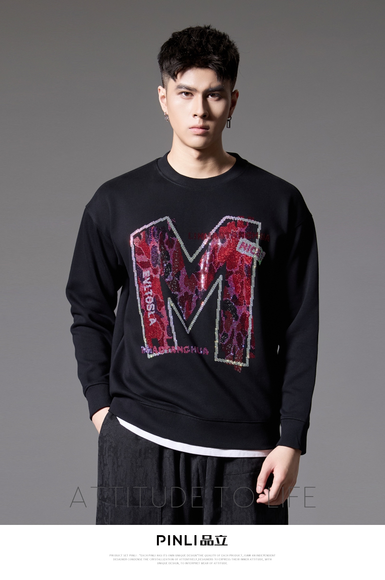 PINLI品立2024秋季新款男士字母烫钻套头卫衣百搭休闲宽松上衣潮BG243109014