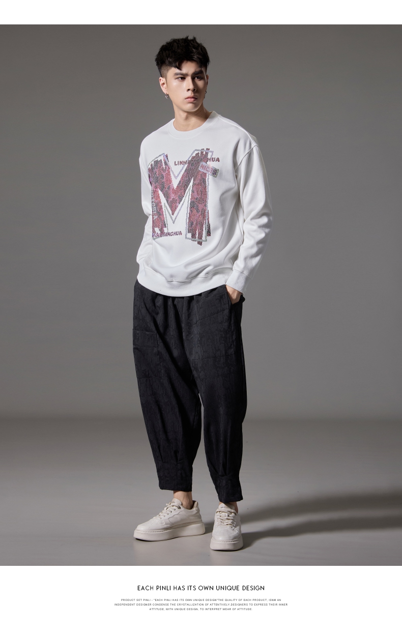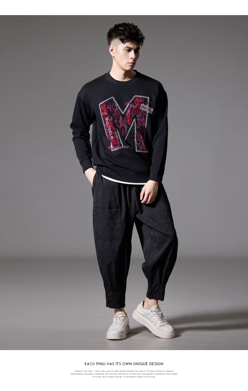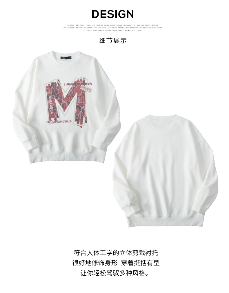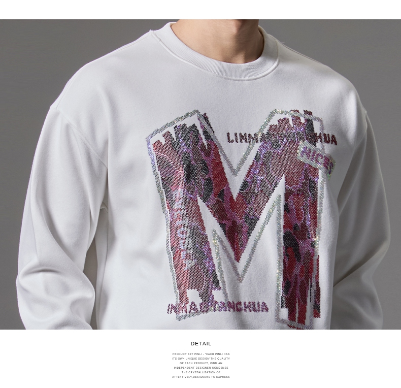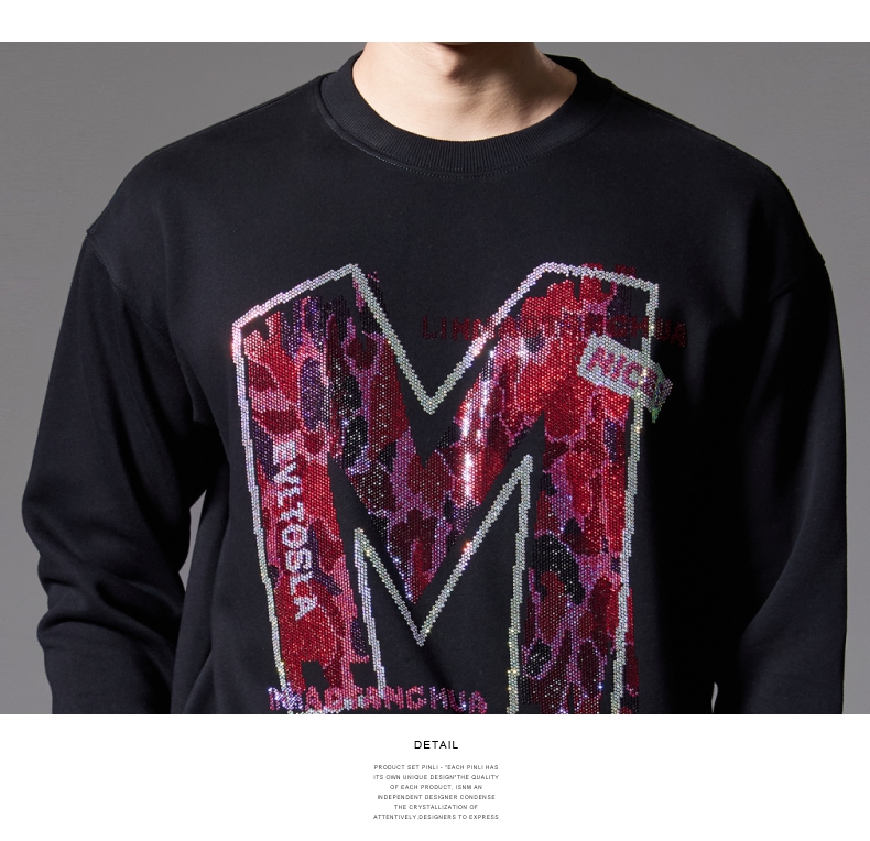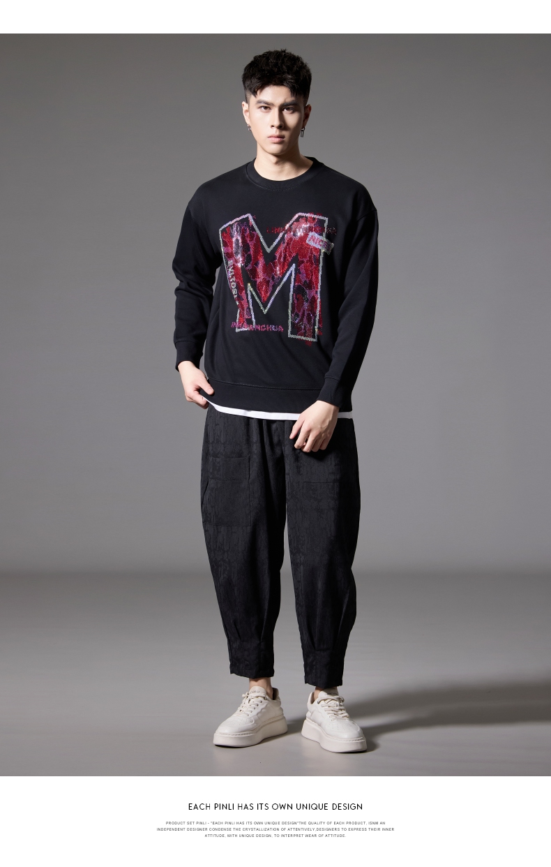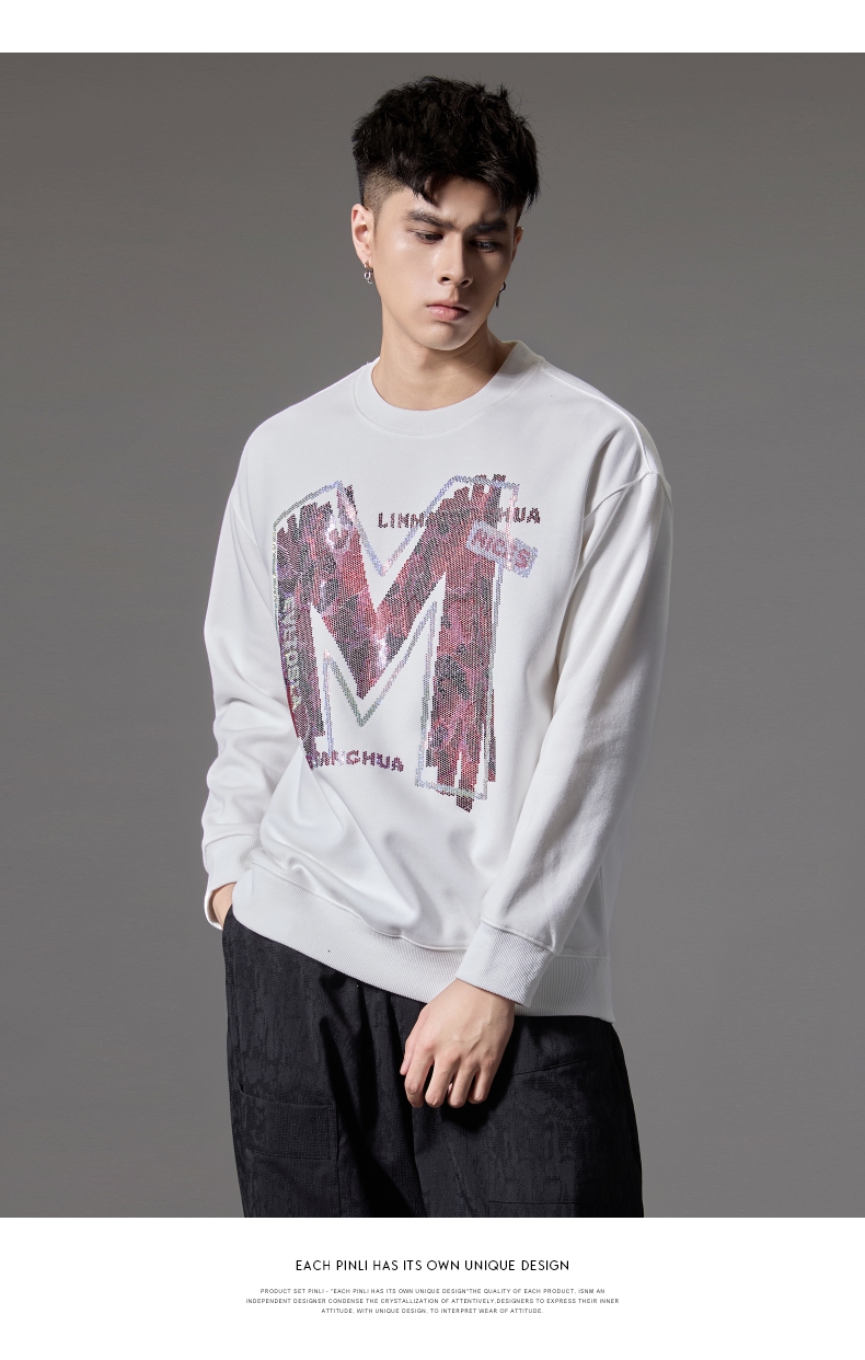 PINLI品立2024秋季新款男士字母烫钻套头卫衣百搭休闲宽松上衣潮BG243109014