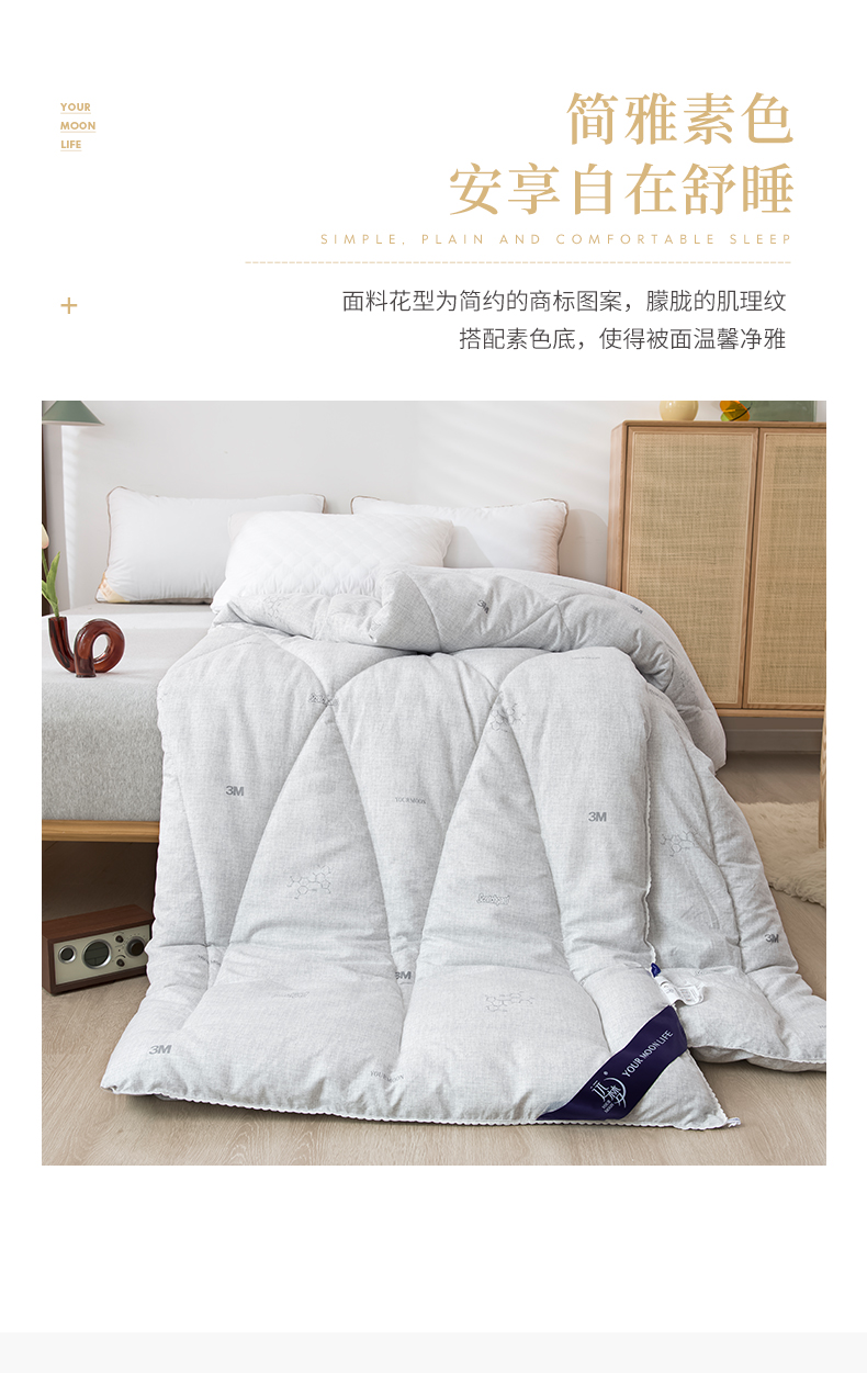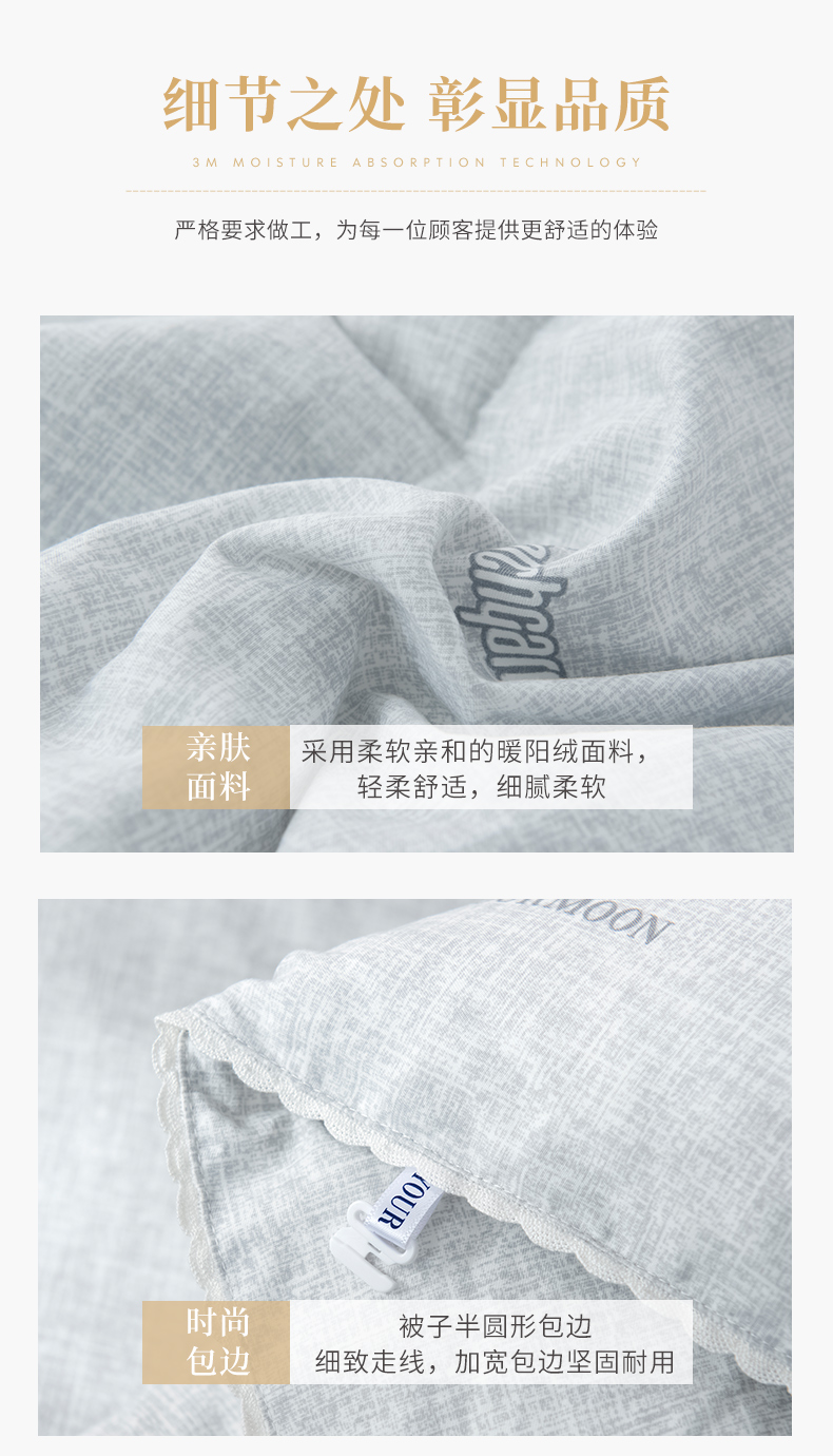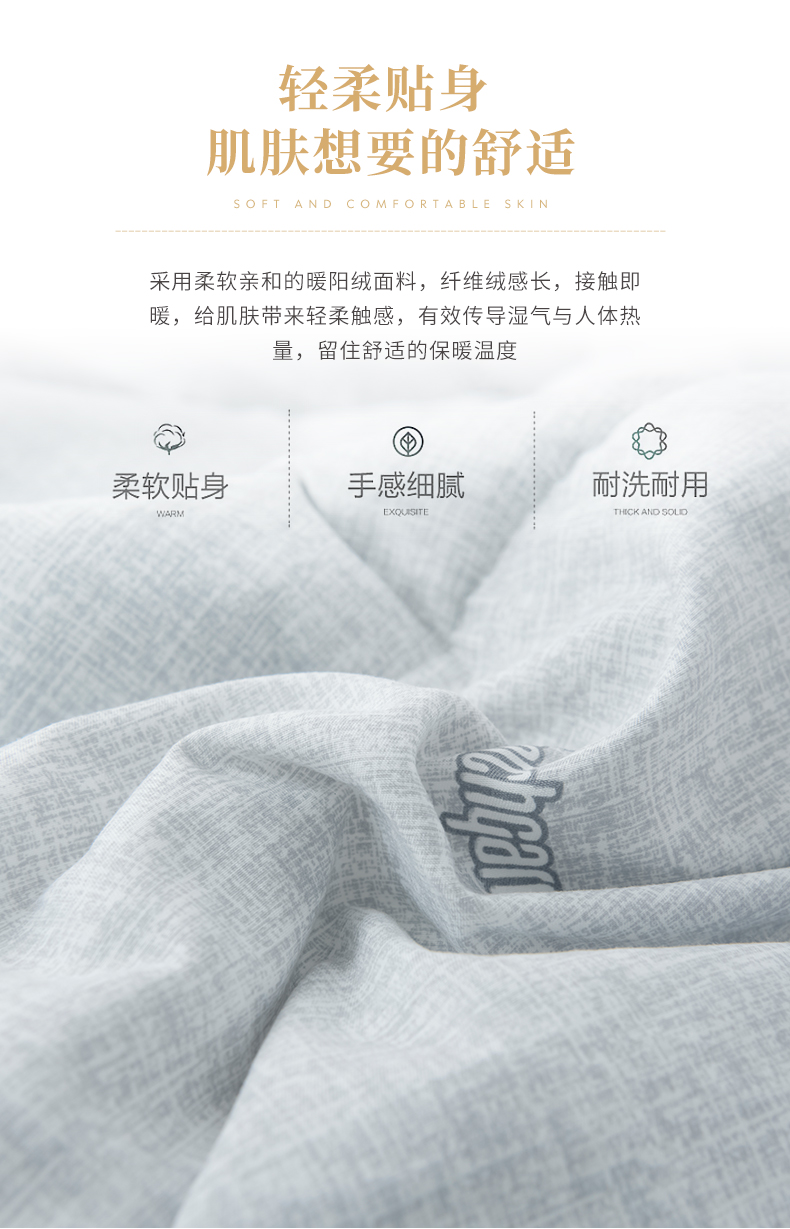 b. 【暖阳绒面料】面料采用柔软亲和的暖阳绒面料,纤维绒感长,接触即暖,给肌肤带来轻柔触感,面料花型为简约的商标图案,朦胧的肌理纹搭配素色底,使得被面温馨净雅,适合各种风格的家装。超柔暖芯纤维填充,细腻柔软,畅享睡眠。