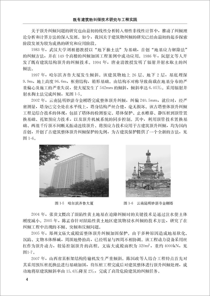 既有建筑物纠倾技术是解决此类问题的一项重要技术,在既有建筑物抢救性保护中发挥着重要的作用。该项技术拯救了大量的倾斜建筑物,使问题建筑物得以保全,使国家财产免遭损失,同时减少了建筑垃圾,保护了生态环境。在既有建筑物加固保护中推广该项技术,将产生巨大的经济效益和社会效益。我国既有建筑物纠倾技术起步比较晚,但建筑物倾斜坍塌事故的不断发生和土力学相关理论知识、地基处理技术、施工机械、检测技术的发展,促进了我国建筑物纠倾技术的产生和发展。既有建筑物纠倾涉及多学科、多领域,专业技术性强,是一项技术难度高、风险大的技术工作。既有倾斜建筑物能否成功纠倾,关键在于合理的方案和得当的施工措施。设计方案是否合理,在于其是不是经过充分调查后的正确决策;施工方案是否得当,在于是否有严格的施工组织及技术措施,是否对施工全过程进行严密监控,是否能够准确地监测建筑物的沉降量。