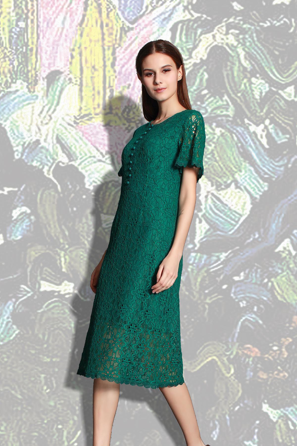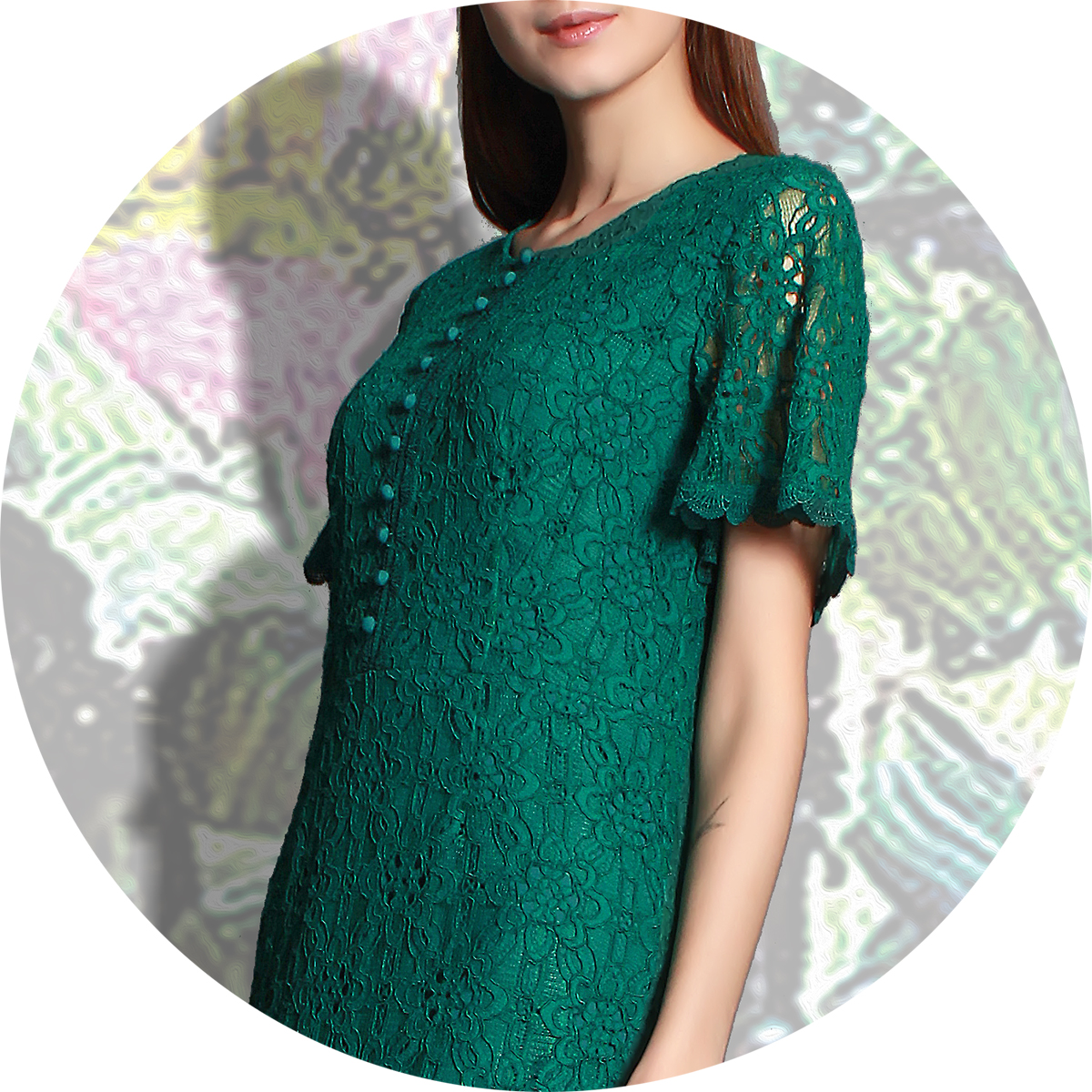 透视感的高品质蕾丝面料,精美的花朵图案如蔓藤盘踞,小花边贴车设计精细的处理每处的细节,彰显的格外有品质,袖口荷叶状设计,具有减龄感,前小蘑菇纽扣设计,更巧妙添趣,圆裁下摆,收腰遮小腹,是不可多得的一款具有复古造型的高品质连衣裙.。