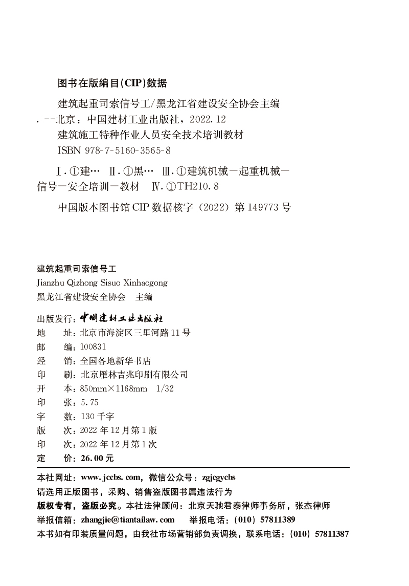 建筑起重司索信号工 黑龙江省建设安全协会主编