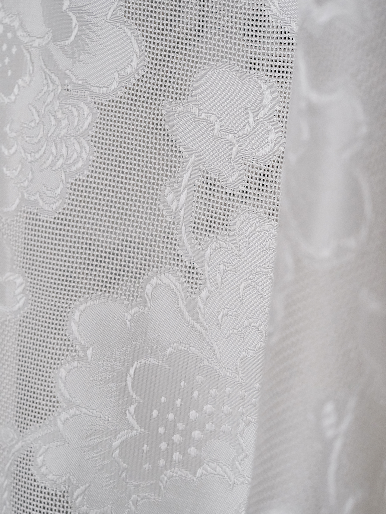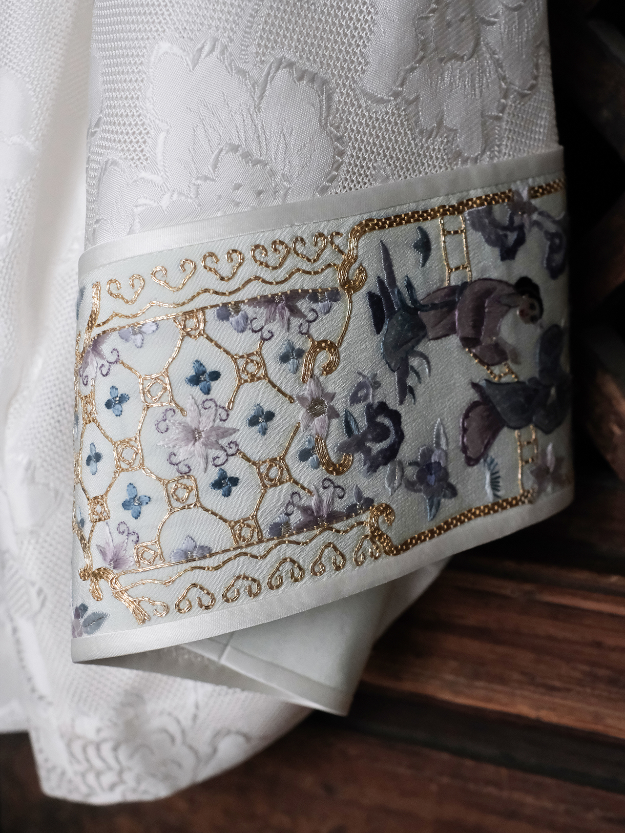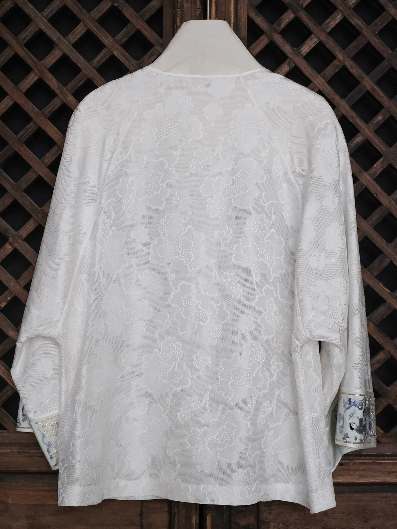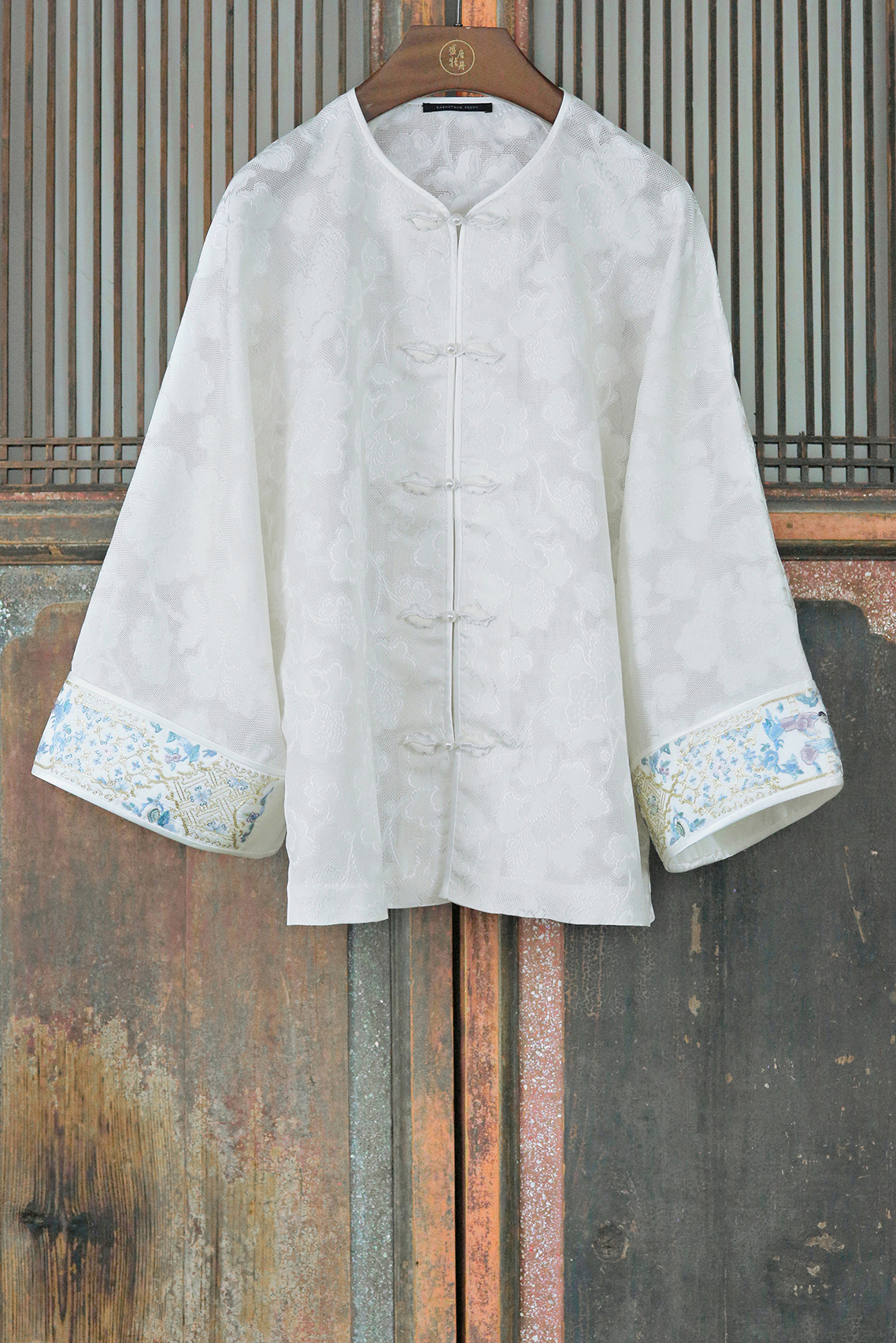 盛唐婧 |圆领团花丝麻提花宽袖上衣-白色