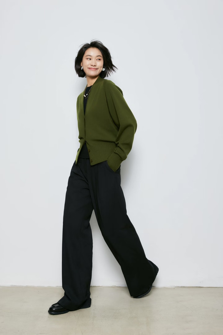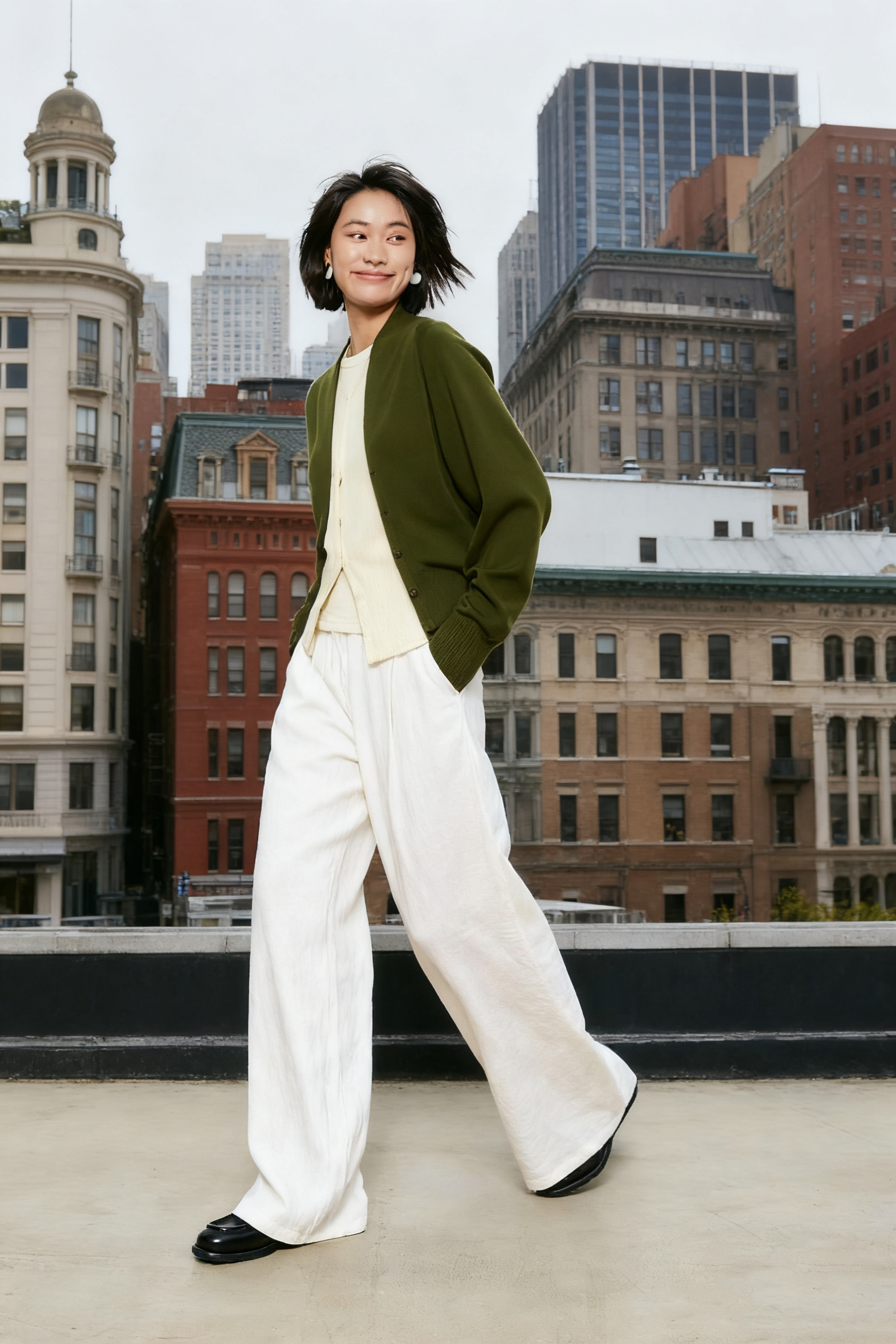 搭配公式:暗冷杉绿开衫 + 米白亚麻阔腿裤 + 乐福鞋。
