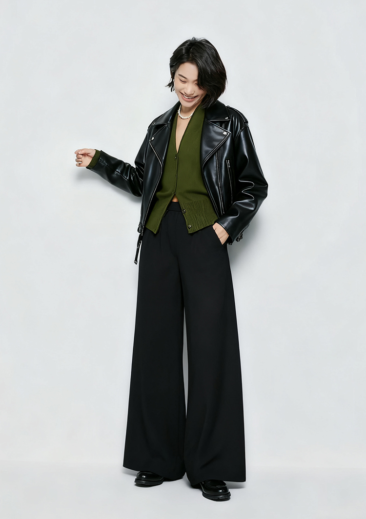 搭配公式:开衫外搭黑色皮衣 + 裙裤 + 高跟鞋。