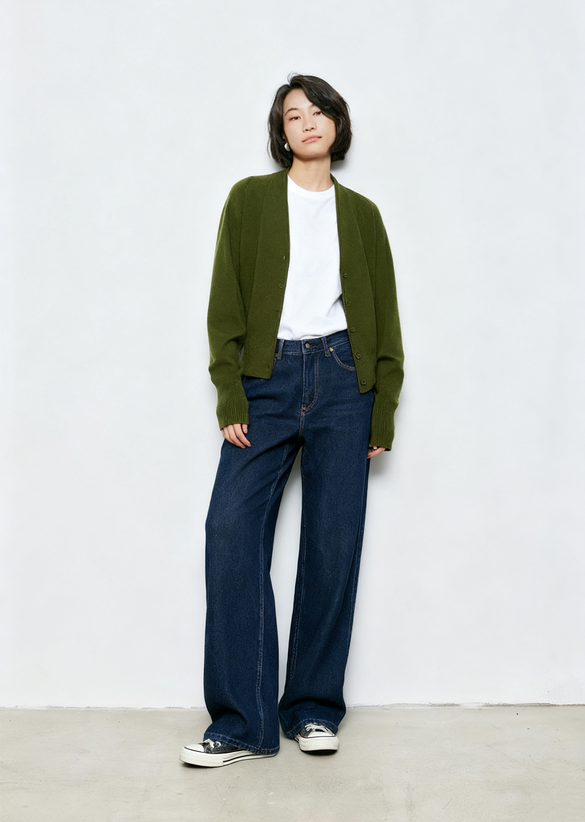 搭配公式:开衫内搭白T恤 + 深蓝直筒牛仔裤 + 帆布鞋。