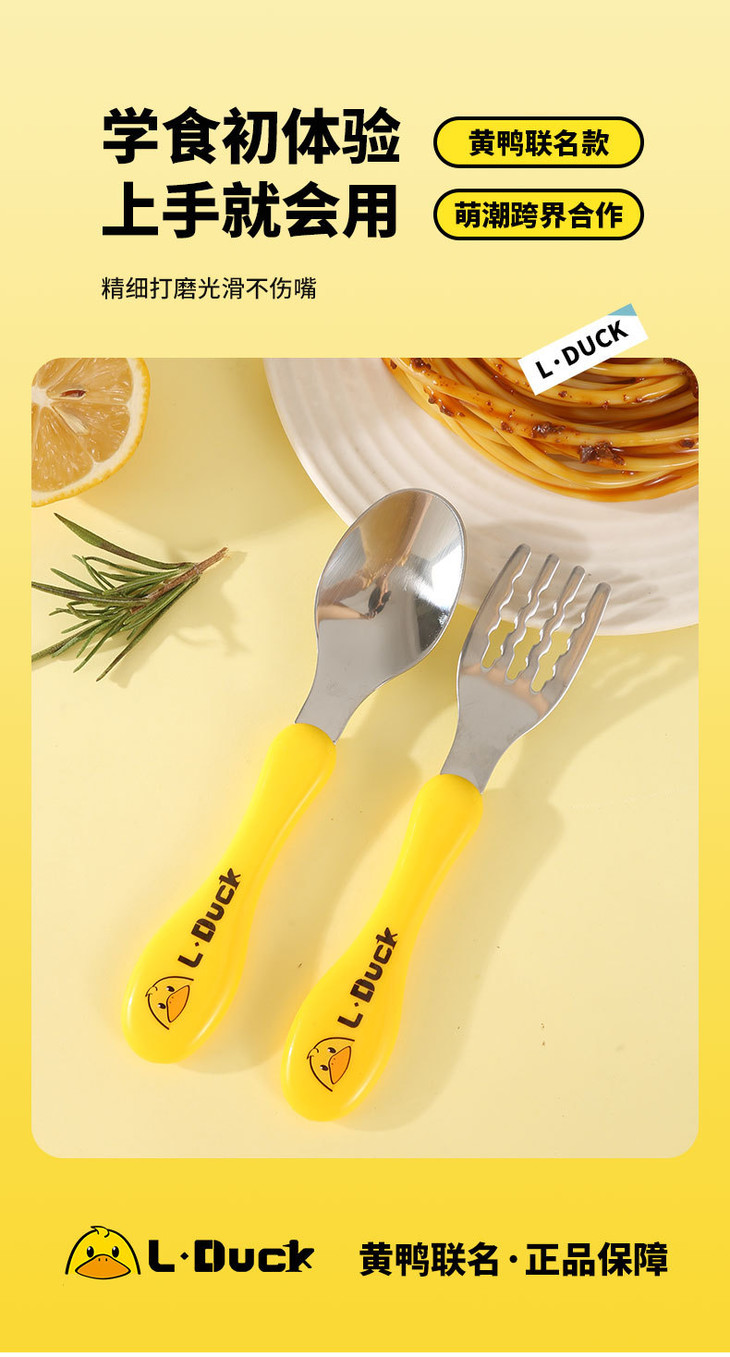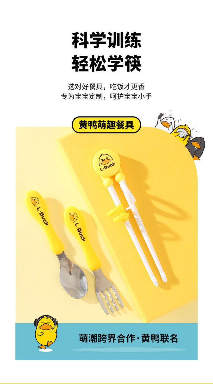 【黄鸭儿童餐具】不锈钢叉勺学习筷(四件套装)3-6岁宝宝学吃饭训练自主进食训练筷
