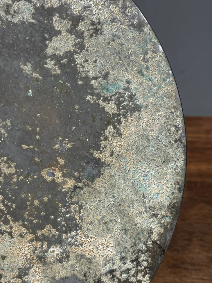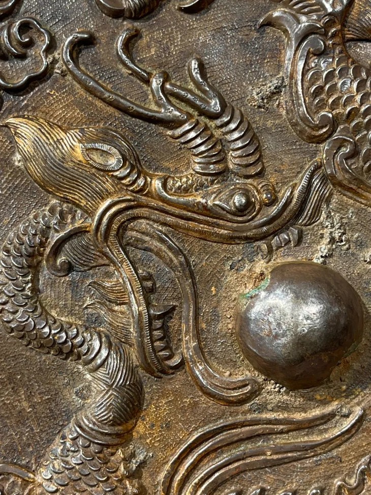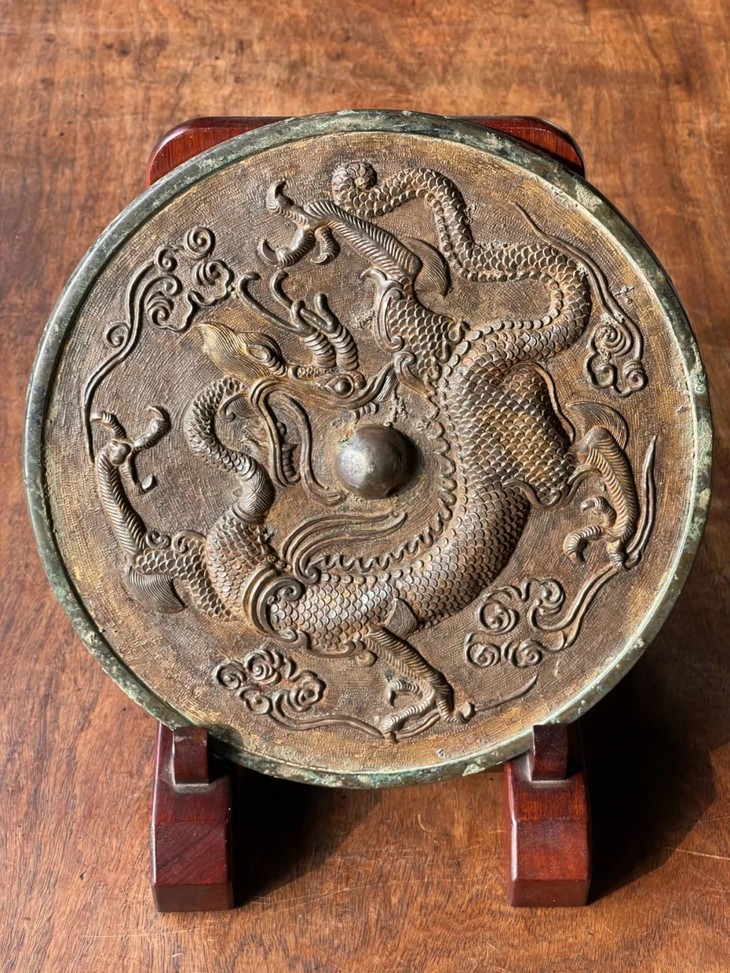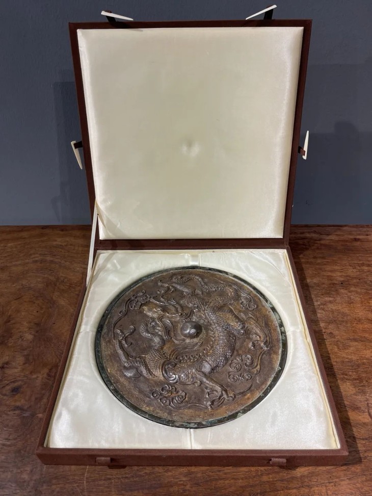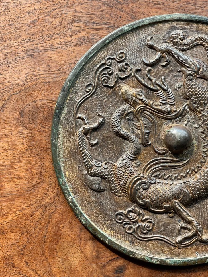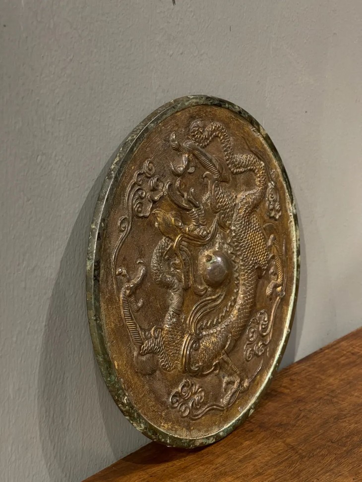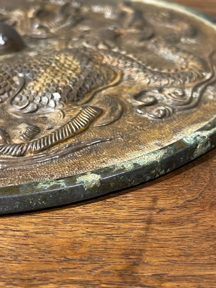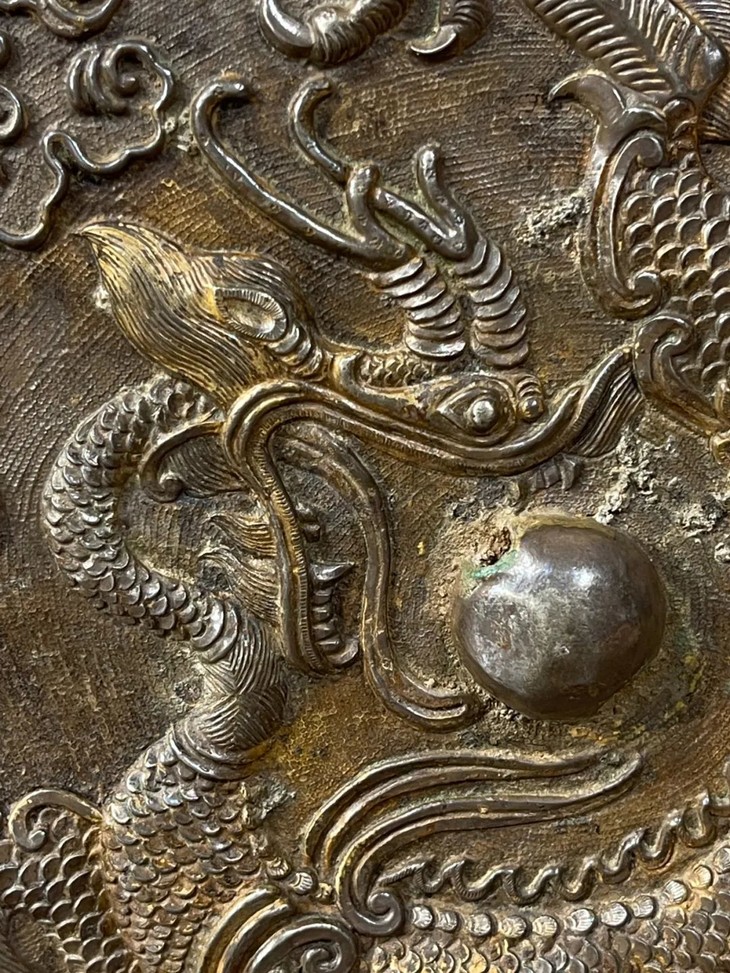 这是一件尺寸大的老银背凸雕青铜镜,以比重大质地坚硬的精炼铜铸造成唐宋风格大青铜镜,镜背镶嵌凸雕錾刻云龙纹的银壳,除中央凸起圆镜钮外,镜背银片满工凸吊云间回首戏珠大龙,精緻錾刻鳞纹与与龙身细节,平底錾精细鱼子纹,凸雕、錾刻、与刻划精緻华丽,龙身部份鎏金,整体生动流畅,构图精彩灵动,银背与青铜镜面自然使用痕迹与磨损处自然生成的绿铜绣与斑驳金属表面清晰可见,整体包浆皮壳温润。此银背凸雕錾刻云龙纹大青铜镜,尺寸碩大,直径近二十五厘米,材质厚实,重逾一点六公斤,局部鎏金银壳凸雕錾刻云龙纹精美华丽,金属铸造打磨、錾刻与刻划工艺精湛,尽显优雅高贵气质。此鎏金银背凸雕錾刻云龙纹大青铜镜,如图所示,局部鎏金表面自然使用磨损痕与铜镜自然生成的绿铜绣外,保存完好无损。尺寸:直径:23.2厘米,厚:0.6厘米~2厘米,重量:1625克。