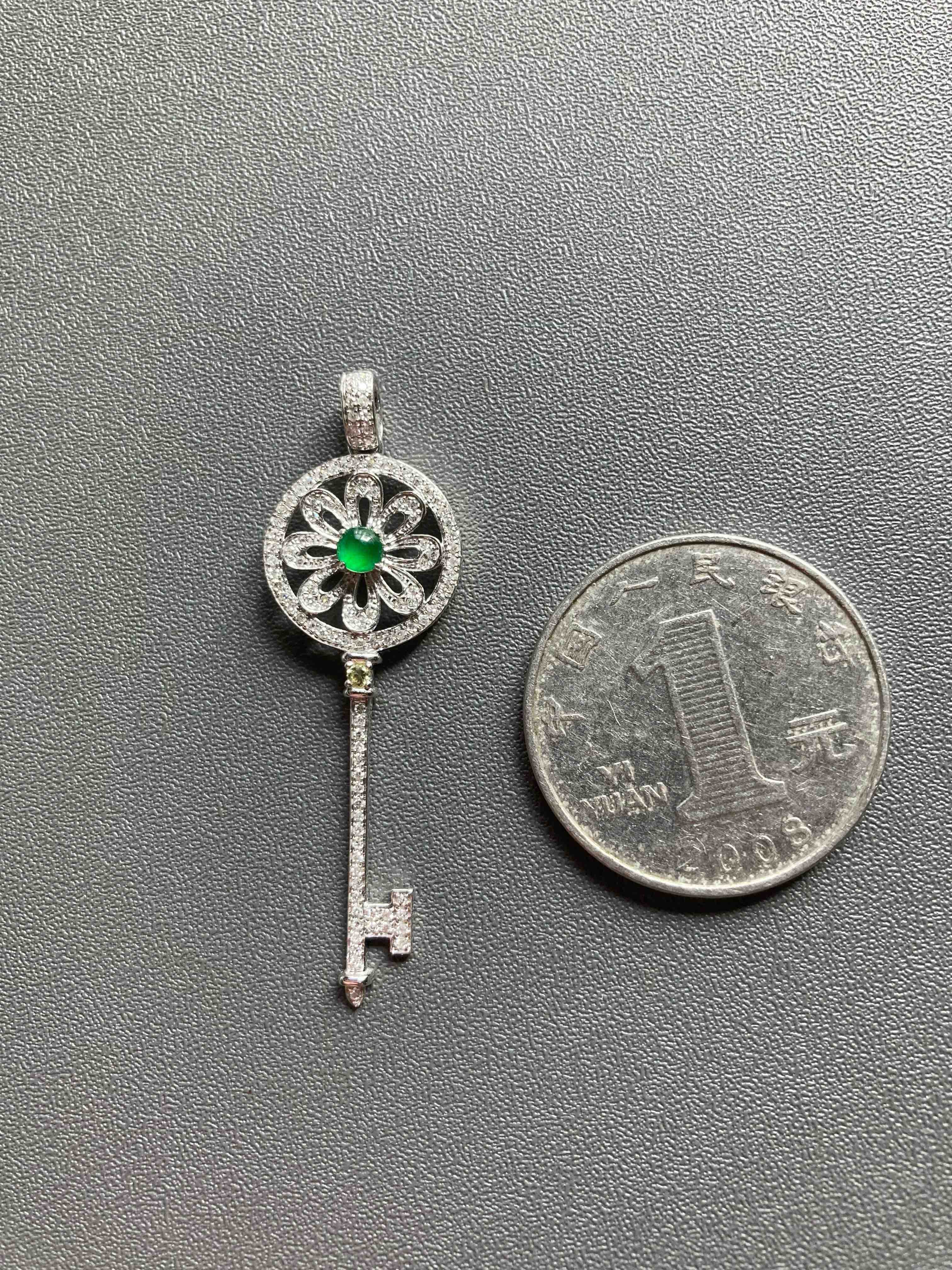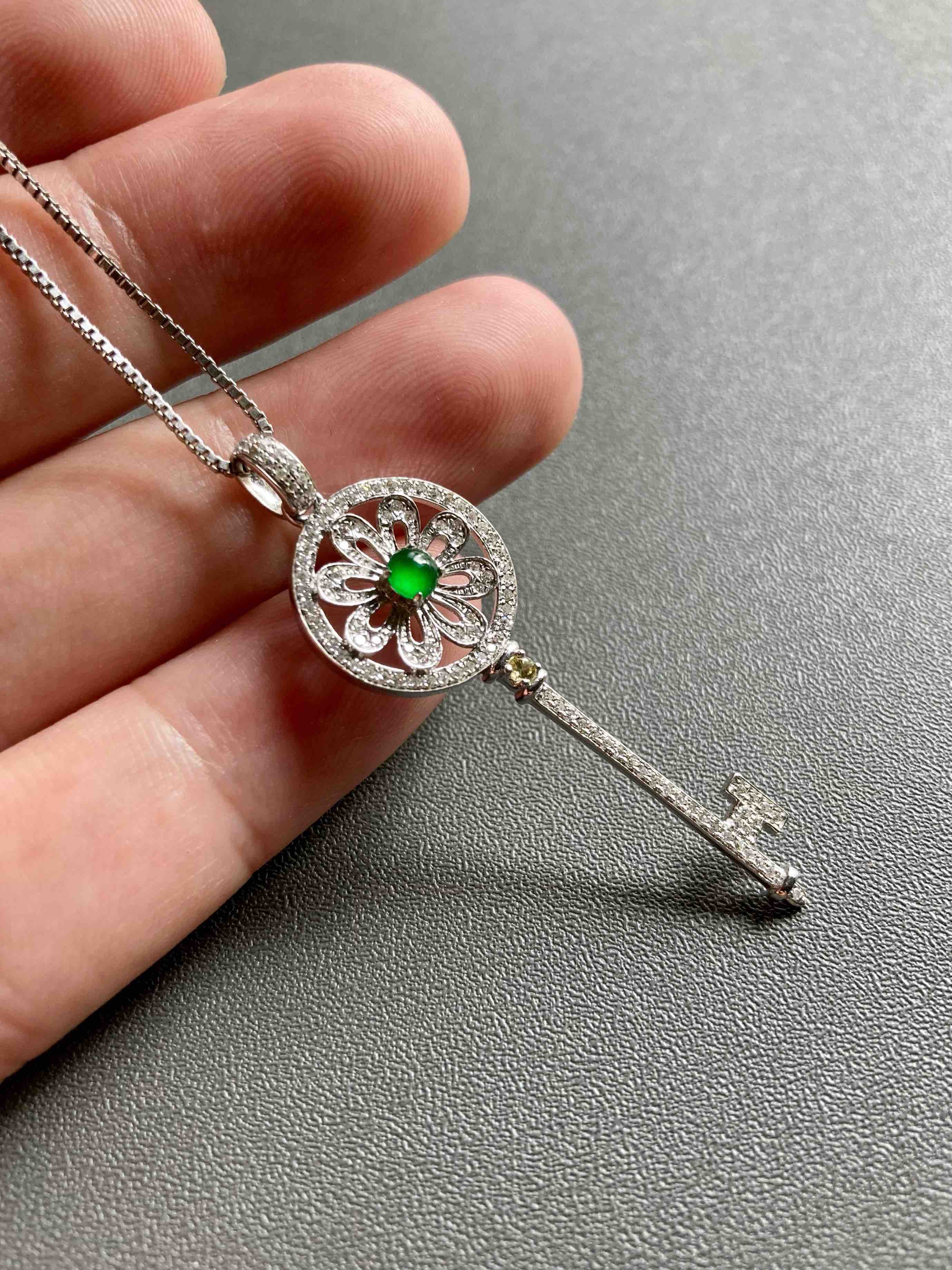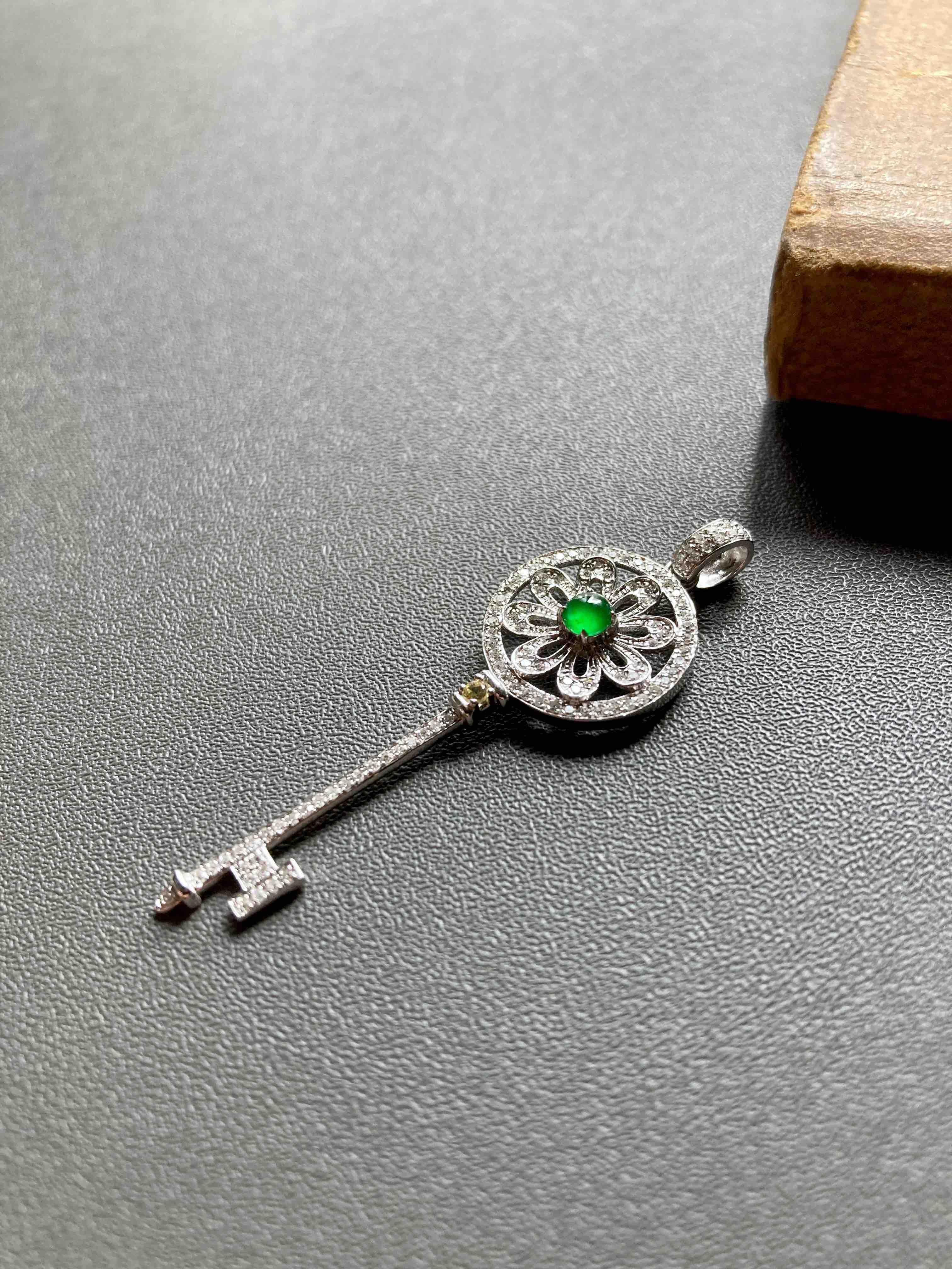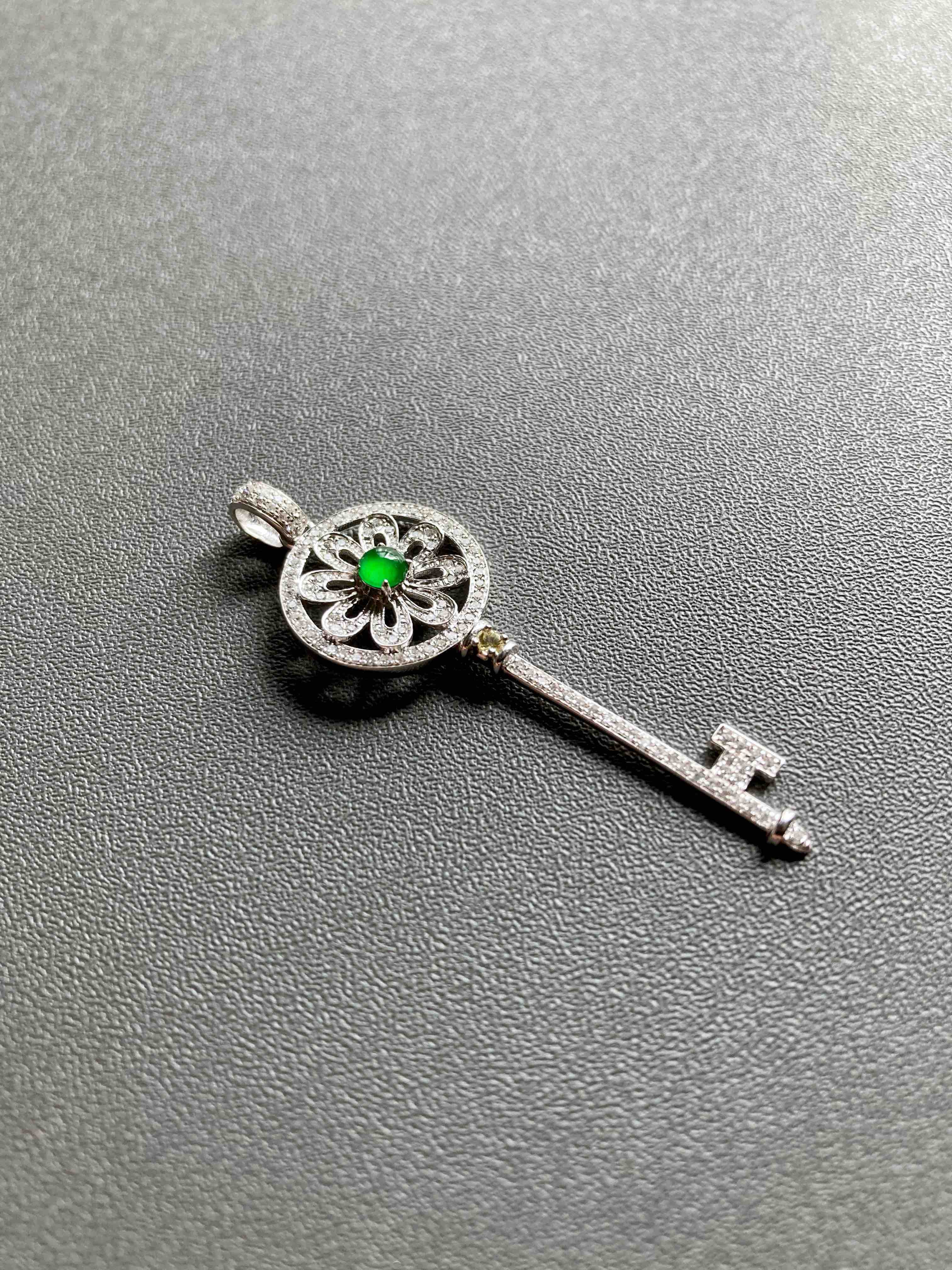 高冰种阳绿翡翠蛋面钥匙18k白金钻石镶嵌