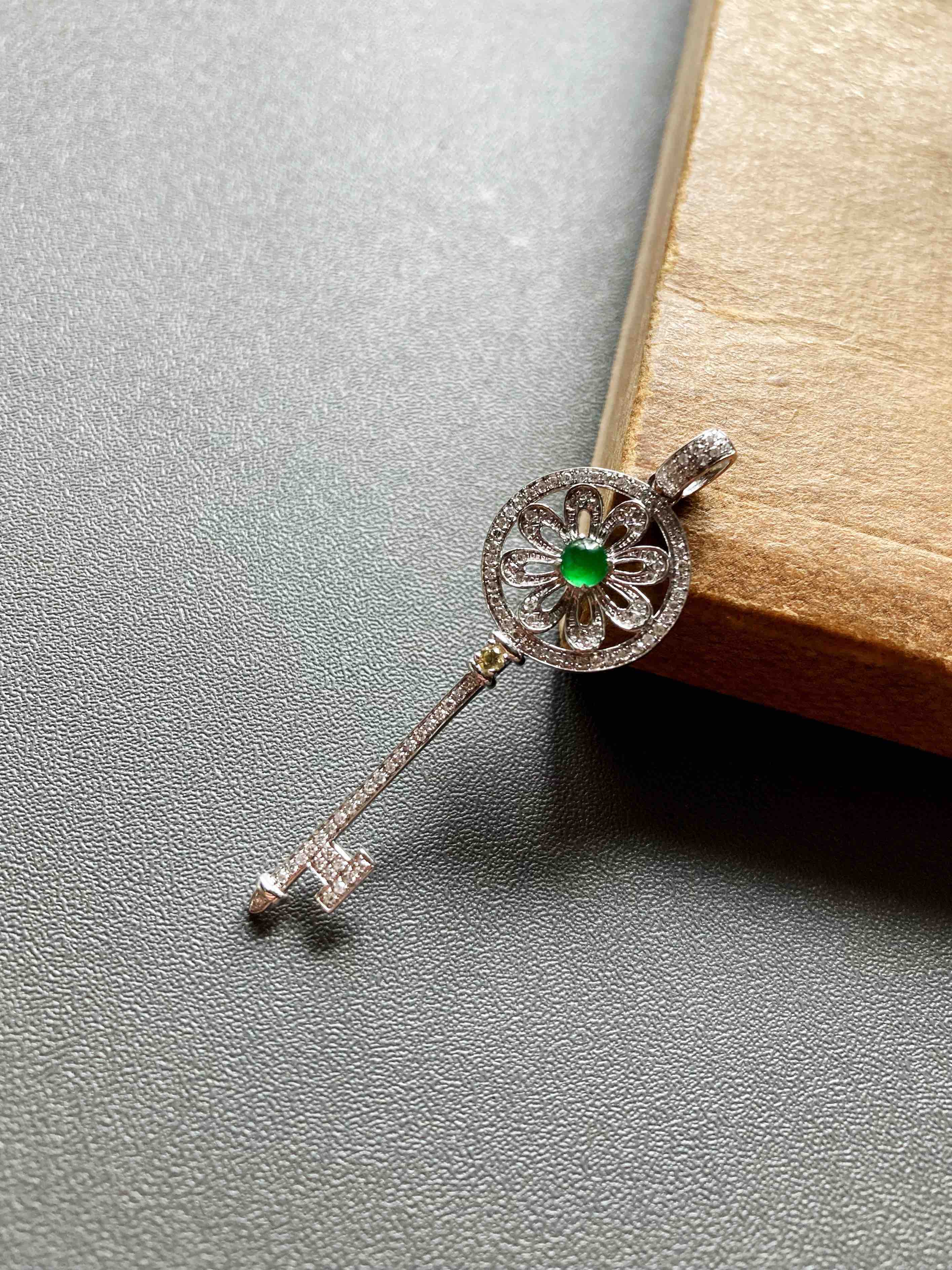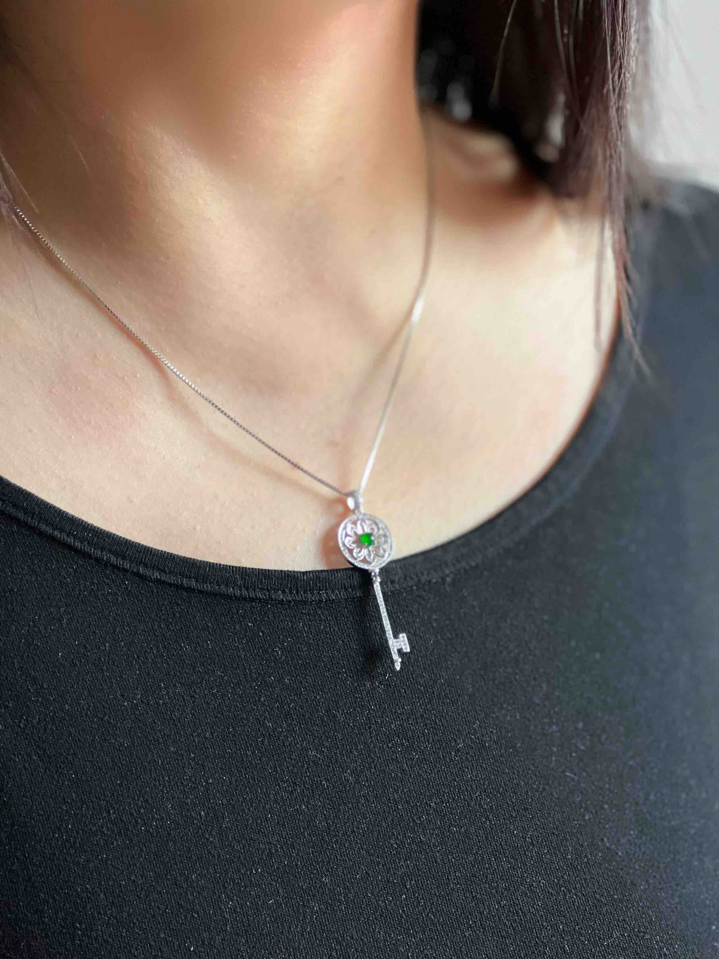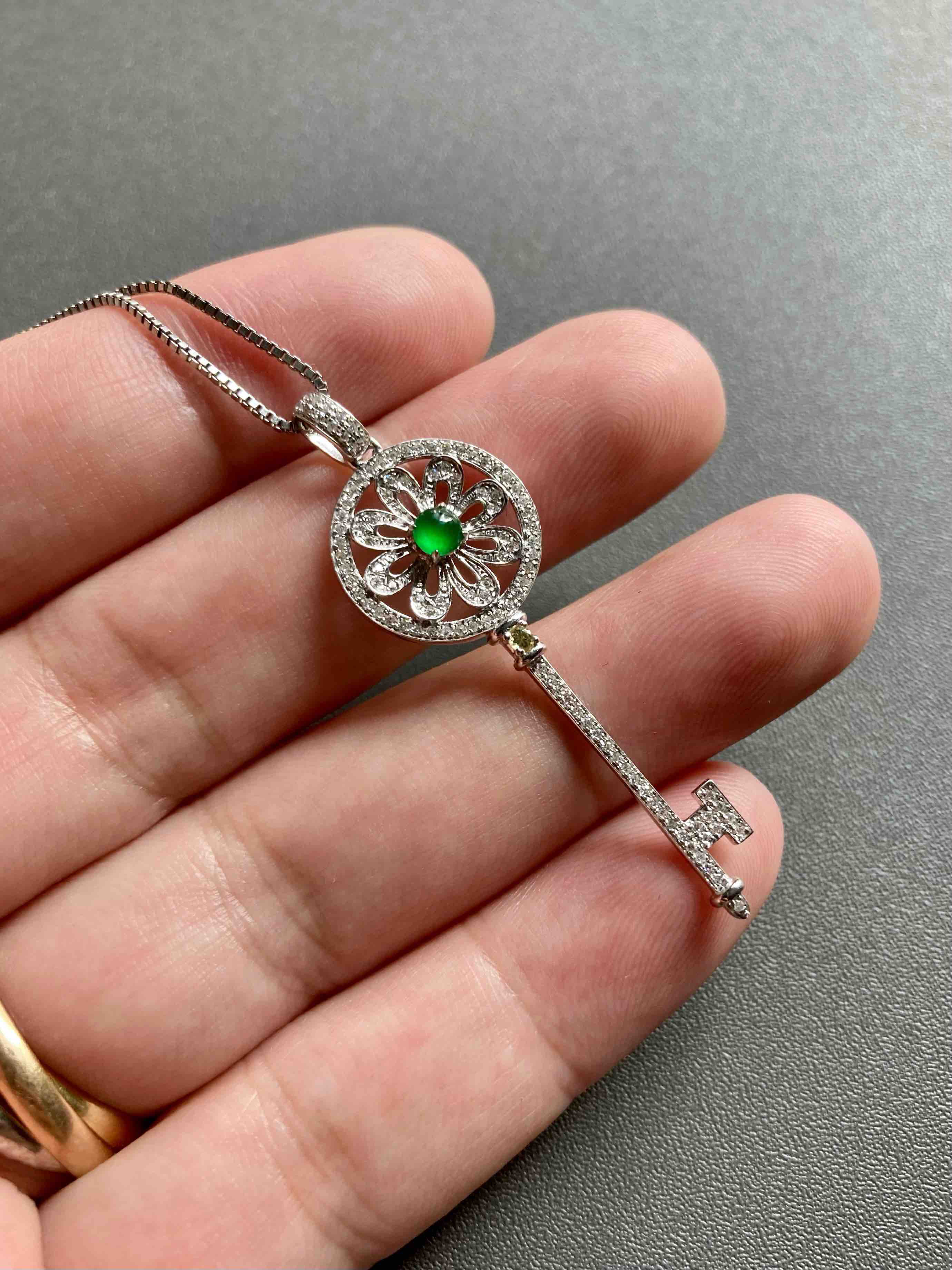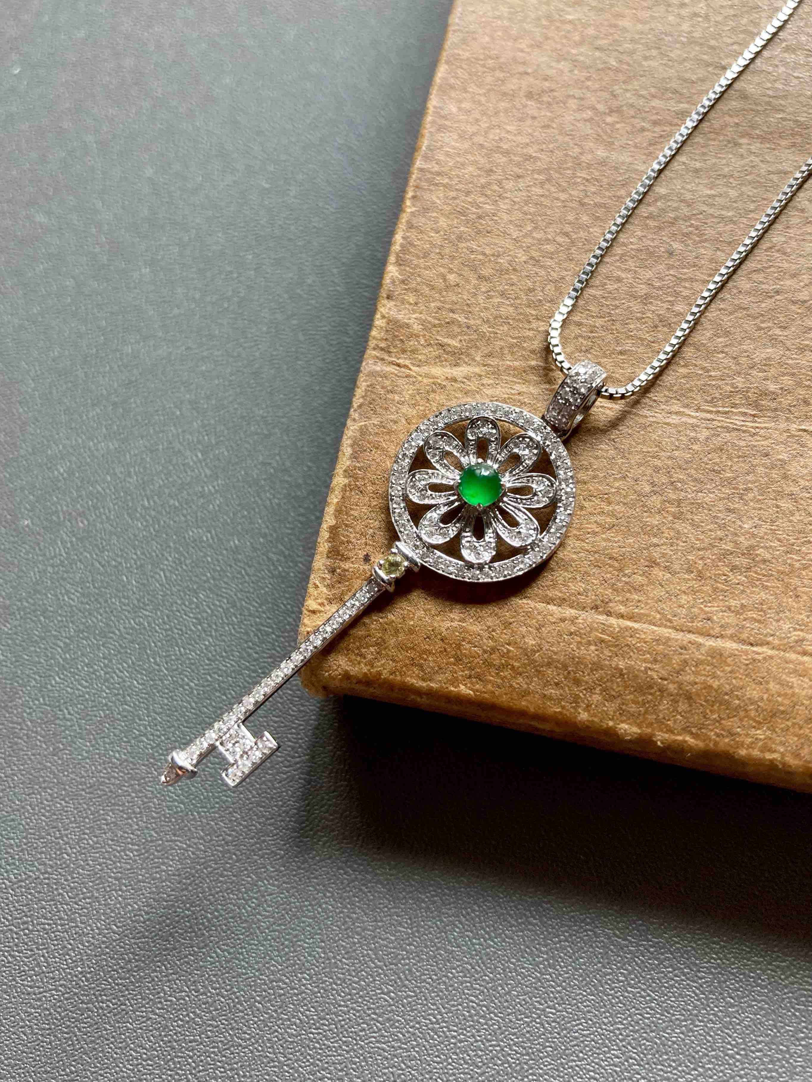 高冰种阳绿翡翠蛋面钥匙18k白金钻石镶嵌