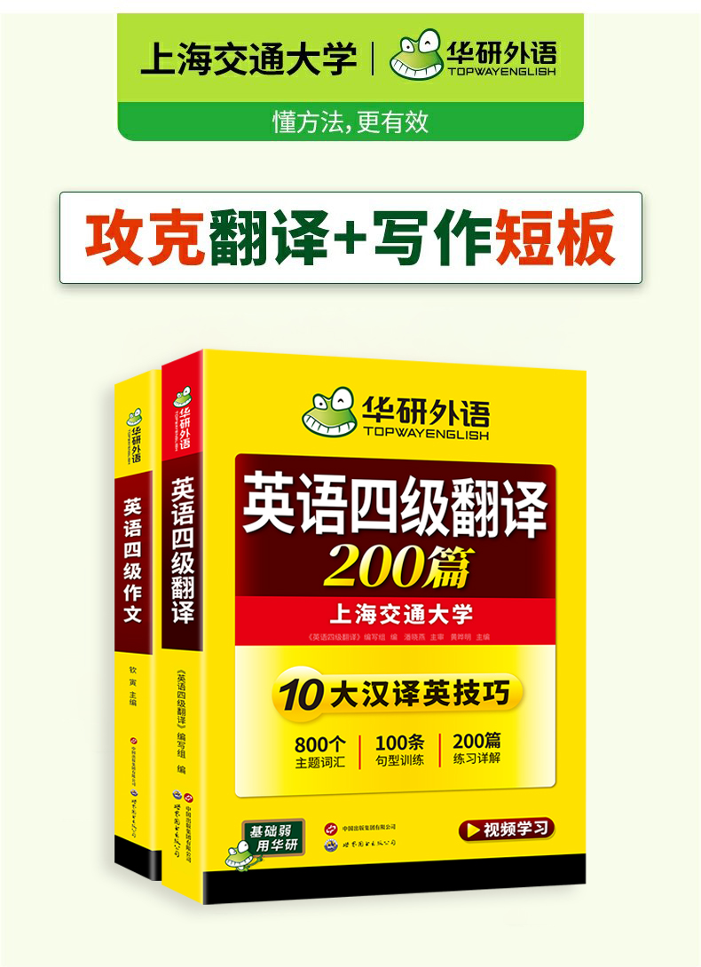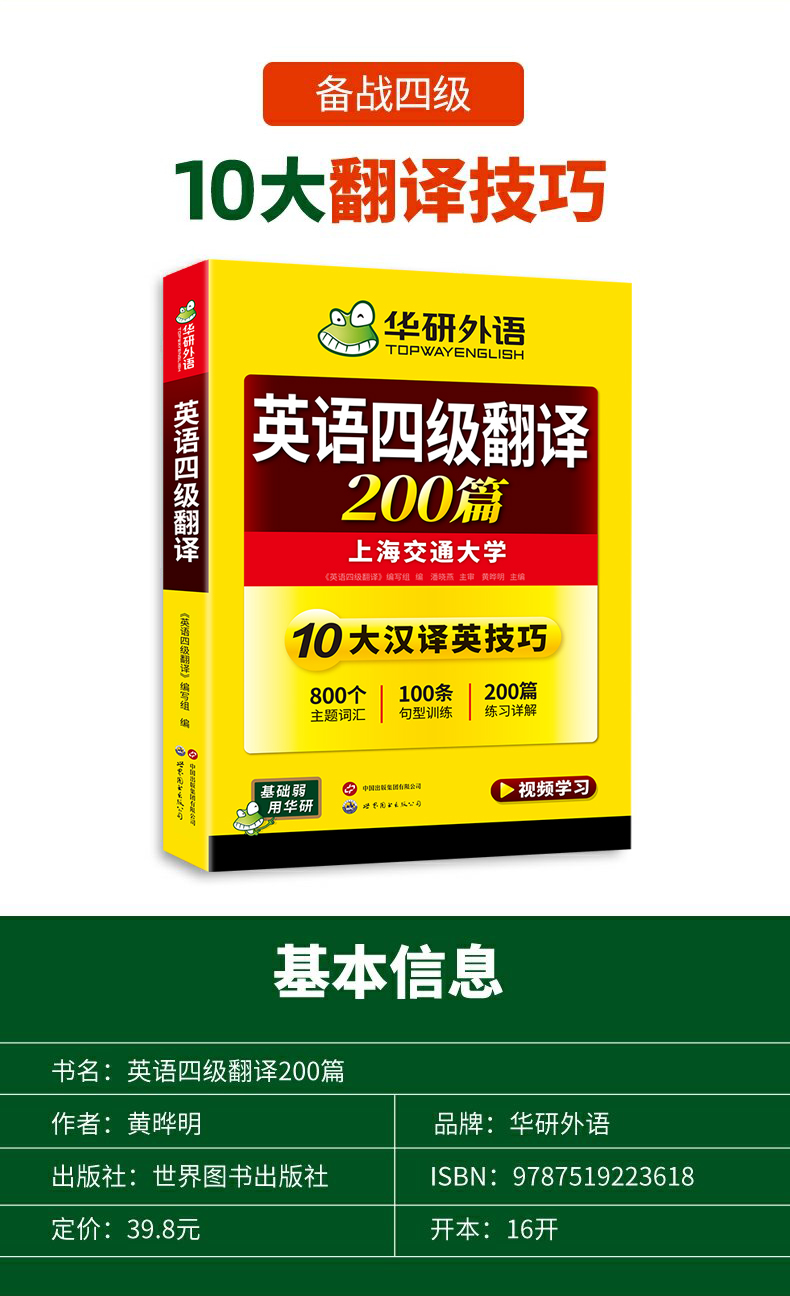 英语四级写作适用对象: 第一次参加大学英语四级考试的CET4级考生;因词汇量不够影响英语四级写作的考生;经常无话可写,需要英语四级写作模板或英语四级作文句型进行写作练习的考生。 推荐理由: 1.华研外语多次命中四级真题; 2.参照近年四级真题作文命题,把握命题趋势,备考针对性强; 2.由英语四、六级命题与阅卷中心——上海交通大学名师主编,命中率高; 3.配套视频讲解大学英语四级写作新题型,快速掌握写作技巧; 4.英语四级作文话题全面,范文易于模仿背诵; 5.英语四级作文解析详尽,包括写作思路、范文与译文、亮点词汇与句型等; 6.归纳英语四级写作主题词汇、谚语、写作模板、句型等实用写作素材,方便考生应考前储备; 7.英语四级作文100篇范文全录音,方便随时随地背诵。