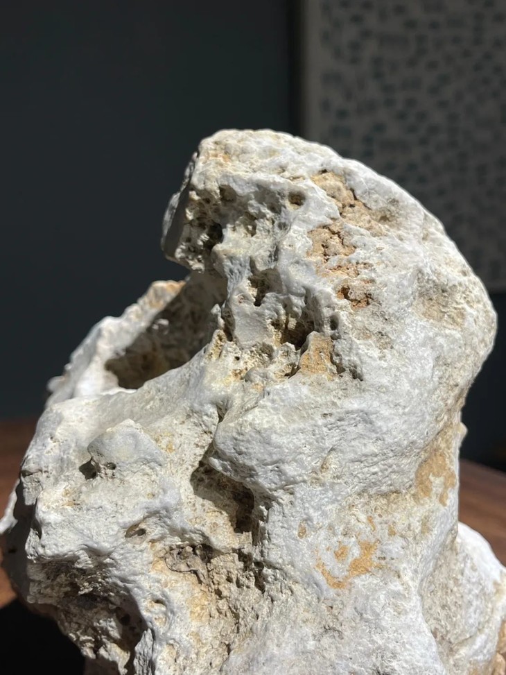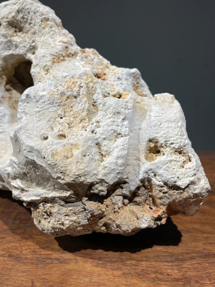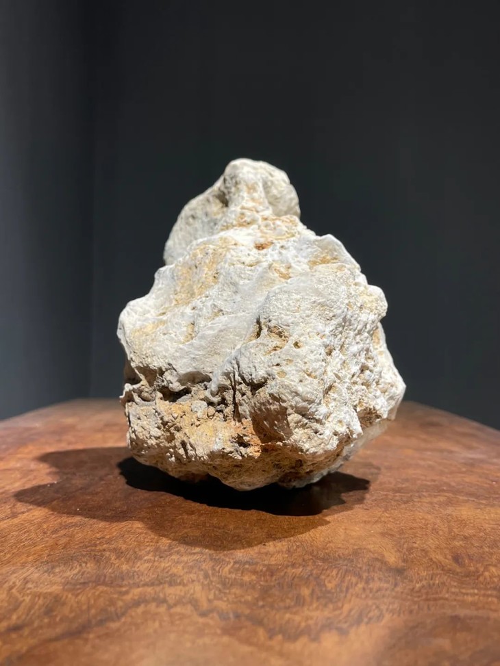 这是一块俗称北太湖石的案头山子,北太湖石产于河南安阳、鹤壁一带山区。开始採于民国年间,在安阳袁世凯墓陵园中就置放有数块产于当地的太湖石。北太湖石呈灰、灰黄、灰黑色,为经岩溶作用形成的多溶孔、溶沟而造型奇特的石灰岩。具备传统太湖石通灵剔透,“皱、漏、瘦、透”的特点,是叠山造园、美化庭院或是小块的文人案头山子的优质赏石。
