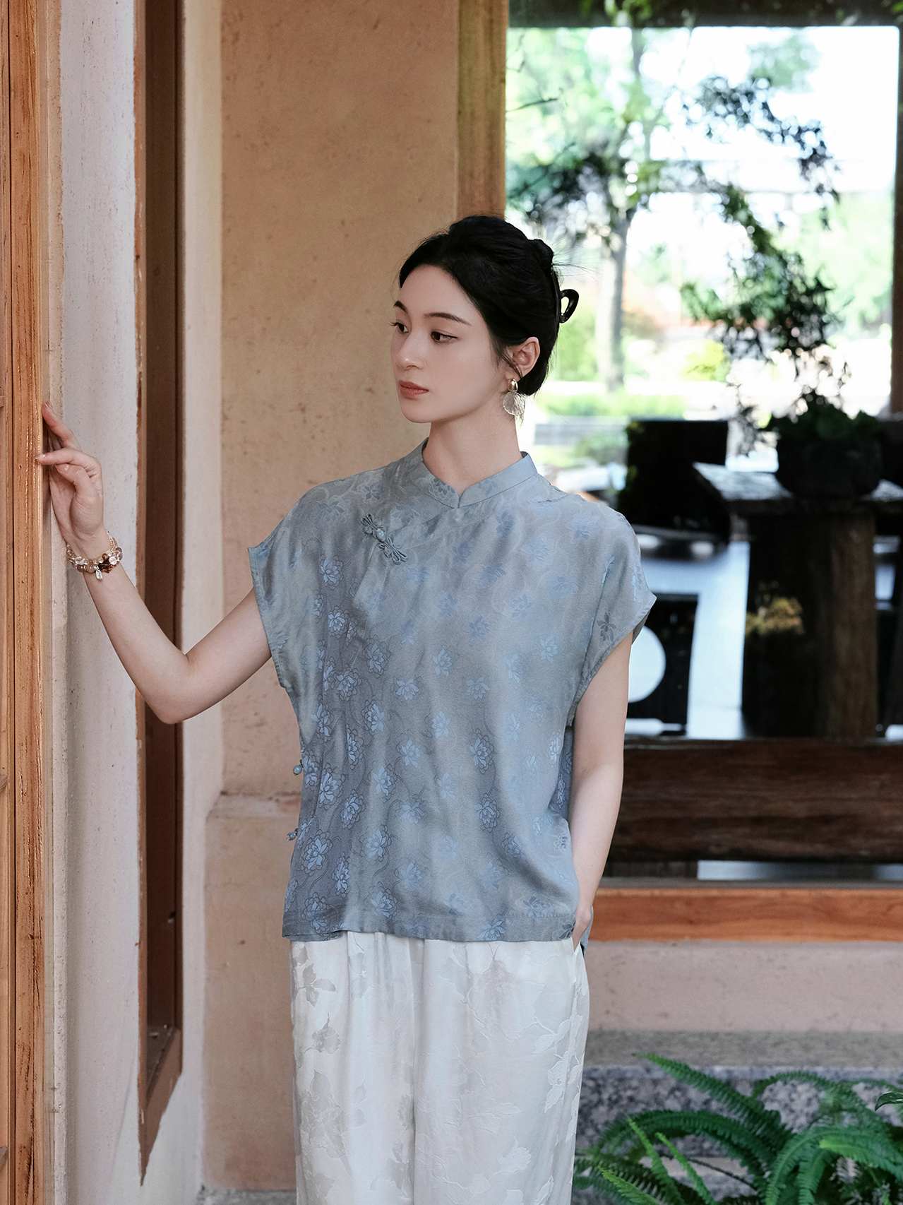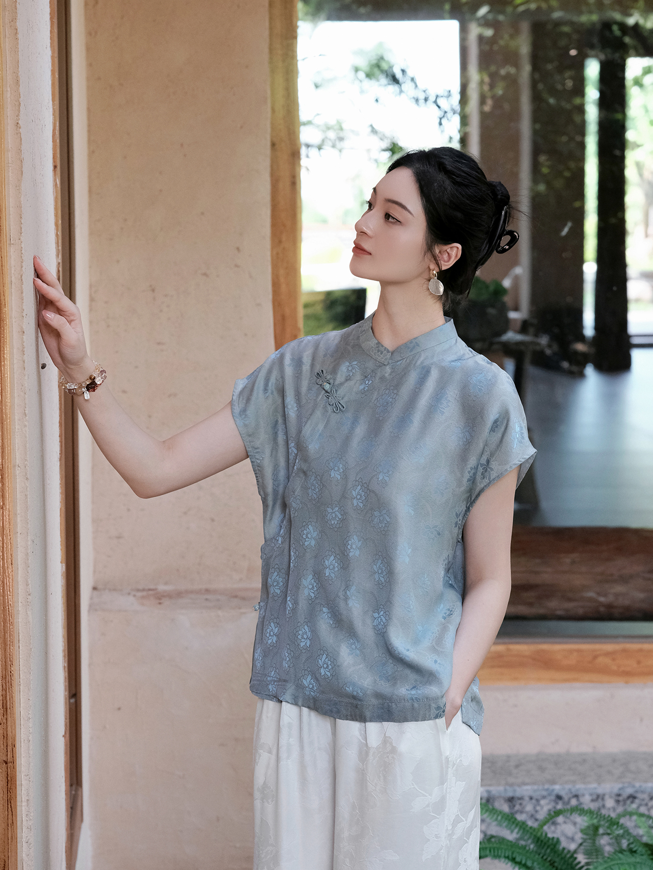 盛唐婧| 新中式小立领落肩蝴蝶盘扣短上衣-蓝色